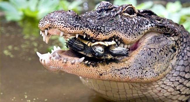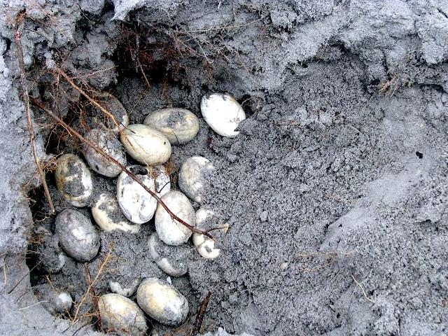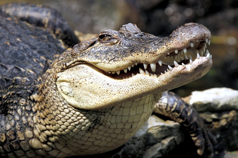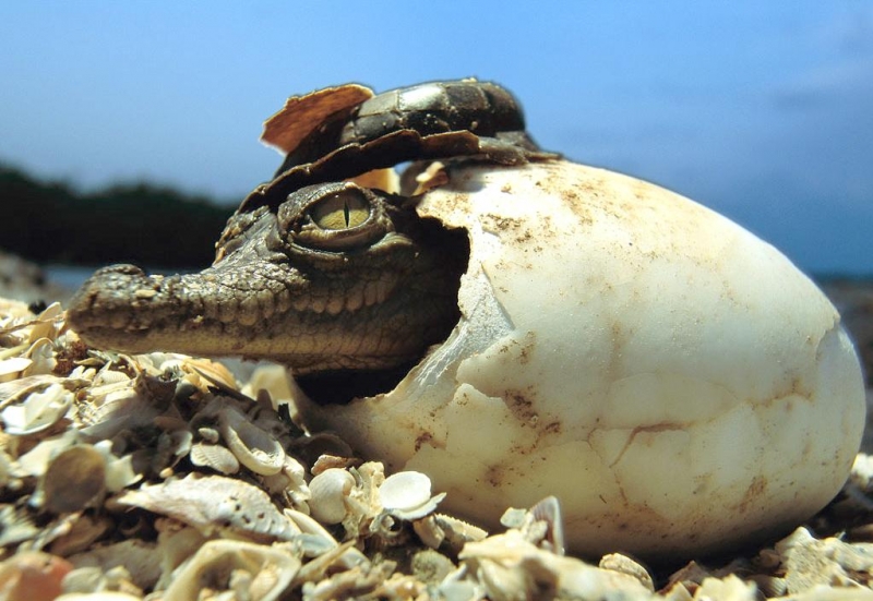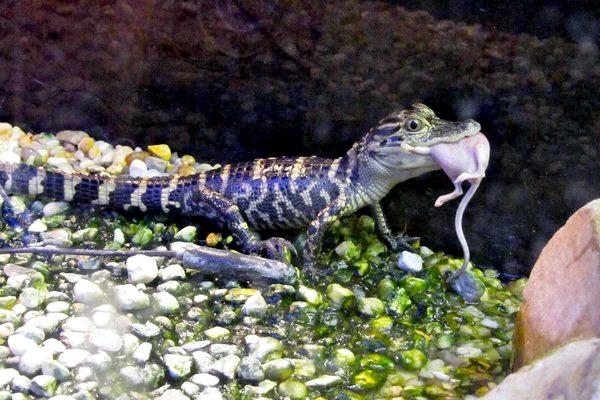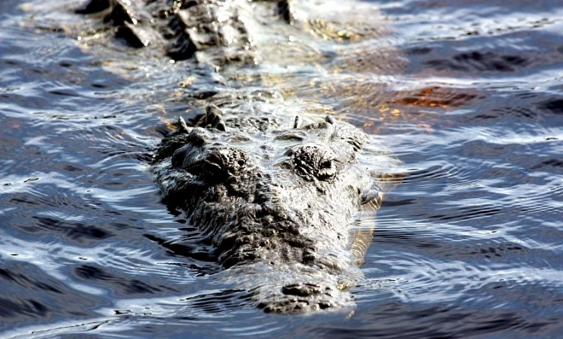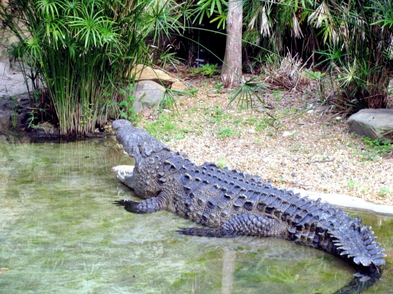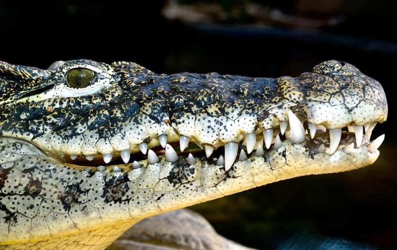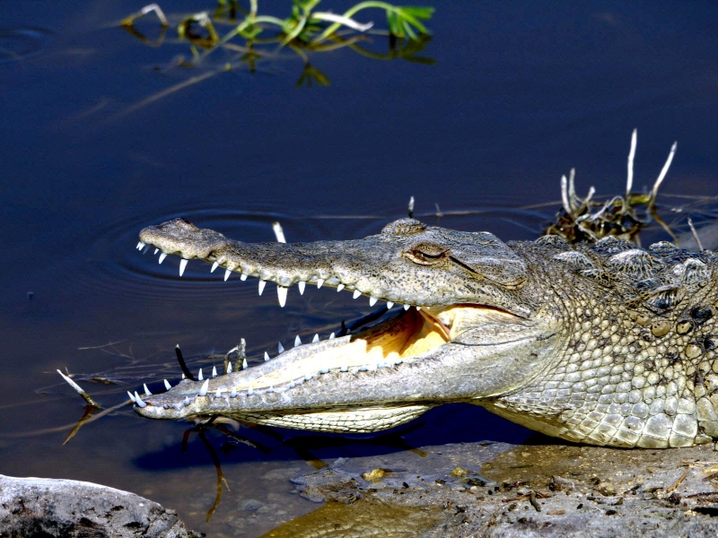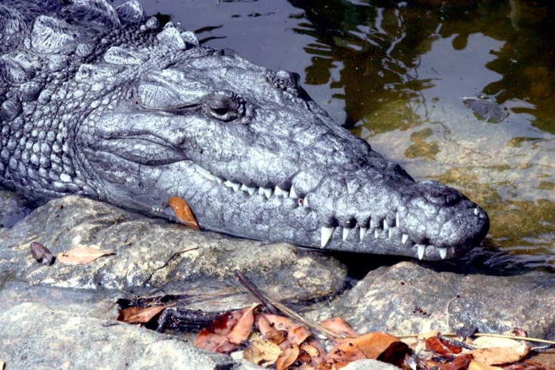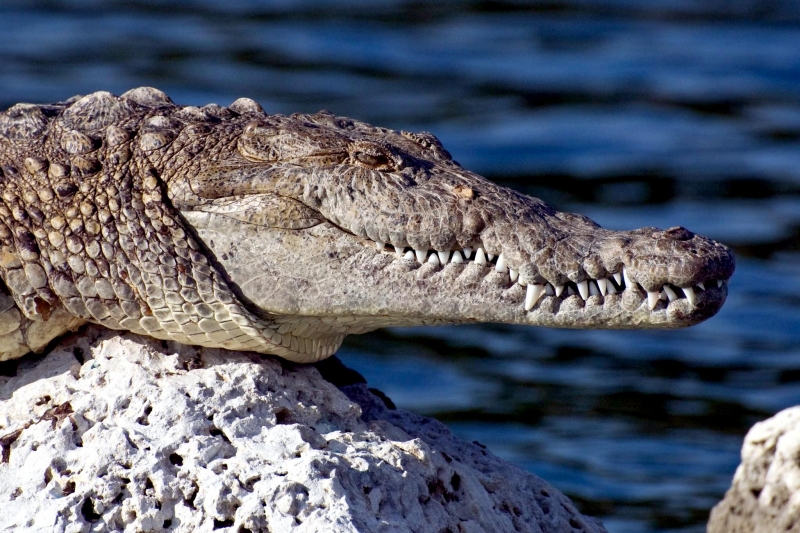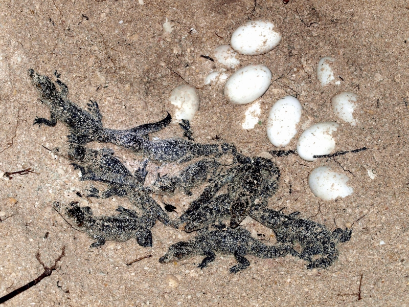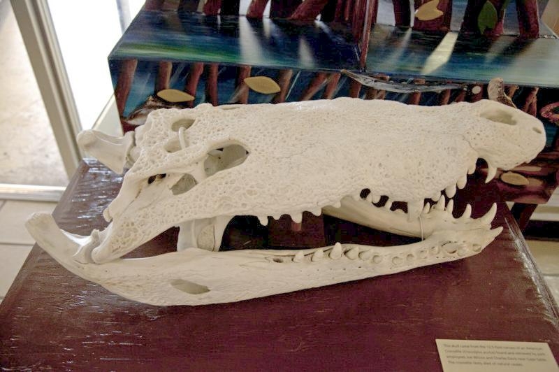 At first glance, American Crocodiles can be difficult to distinguish from the American Alligator, but closer inspection reveals several important differences. The American Crocodile is lizard-shaped with a long, muscular tail and four short legs that have five toes on the front feet and four on the back feet. Adults have grayish-green backs and tails and white to yellowish undersides. Their narrow snout is triangular in shape and the fourth tooth on both sides of the lower jaw is visible when the mouth is closed. The ear drums are protected by movable flaps of skin at the top of the head behind the eyes and the nostrils are at the end of the elongated snout. Because of the location of the eyes, ears and nostrils, an American Crocodile can be submerged with only the top of its head exposed and still be able to see, hear & breathe. Males are larger than females and can reach about 20 feet in length but rarely exceed 14 feet in the wild. Breeding females are about 8 to 12 feet in length. An American Crocodile will eat almost anything that moves. Hatchlings and the young eat small fish, snails, crustaceans and insects. Adults feed mostly at night on fish, crabs, turtles, snakes and small mammals. The growth rate of American Crocodiles varies with food availability & temperature. Digestion is efficient only within a certain range of body temperatures. Generally, they grow more slowly near the limits of their range. American Crocodiles build nests that are either holes in or mounds of sand and other earthen material. Unlike birds & mammals, the sex of embryos is not determined at fertilization but by the temperature at which the eggs are incubated. Temperatures of 88 to 91 °F produce mostly male offspring and temperatures lower than 88 °F result in mostly female American Crocodiles. However, the temperature must remain above 82 °F for the eggs to survive and hatch. Females lay from 20 to 60 eggs per clutch and incubate the eggs for about 85 days until they hatch in late July or early August. Females build soil nests on elevated, well-drained sites. Nests are constructed so that the eggs will be above the high-water mark because American Crocodile eggs cannot survive flooding for more than 12 hours. After nest construction, the female may not remain near the nest; however toward the end of incubation, females visit the nest with increasing frequency. When hatching begins, the mother digs open the nest and may help some of the hatchlings emerge from their eggs. She may also assist some of the newly hatched to water or nursery sites where they are released. Adults leave the nesting areas within a couple of days, leaving the hatchlings on their own. The hatchlings rapidly disperse from their nest and fend for themselves. American Crocodiles typically live to an age of 50 to 70 in the wild.