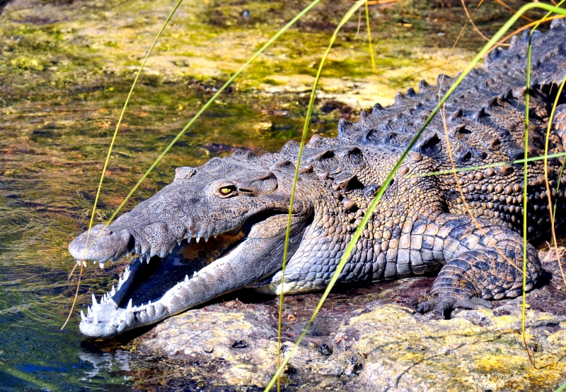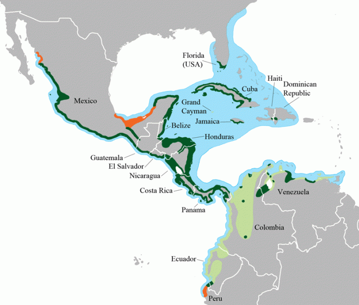American Crocodiles are a shy and reclusive species. They live in coastal areas throughout the Caribbean and occur at the northern end of their range in south Florida. They live in brackish or saltwater areas and can be found in ponds, coves & creeks in mangrove swamps. The Crocodile’s name comes from the ancient Greek krokodilos, meaning “worm of the pebbles”. American Crocodiles are occasionally being encountered inland in freshwater areas of the SE Florida coast as a result of the extensive canal system. Like the American Alligator, American Crocodiles are ectothermic, meaning they rely on external sources of heat to regulate their body temperature. Crocodiles control their body temperature by basking in the sun or moving to areas with warmer or cooler air or water temperatures. A basking American Crocodile may be surprised by an approaching person and quickly (and noisily) enter the water. This behavior might startle the person, but it should not be misunderstood. American Crocodiles would normally enter the water quietly; splashing away indicates that the crocodile is frightened. They can also be seen sunning with their mouths open or “gaping”. This behavior is also related to regulating their body temperature and does not mean that the American Crocodile is acting aggressively toward people. American Crocodiles & American Alligators belong to a group of reptiles called crocodilians, which are the largest of the living reptiles. Of the 23 different species of crocodilians in the world, 2 species are native to the United States and south Florida is the only place where both of these species coexist. The American Alligator ranges throughout the southeastern United States and exist at the southern extreme of their range. American Crocodiles on the other hand, inhabit coastal areas of south Florida where they are at the northern extreme of their range. American Crocodiles also can be found on the islands of Cuba, Jamaica and Hispaniola as well as along both coasts of southern Mexico and Central America, south to Ecuador on the Pacific coast of South America and Venezuela on the Atlantic coast.