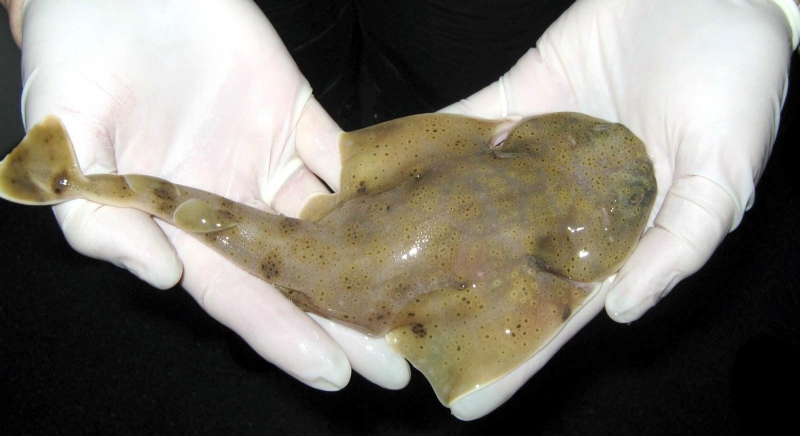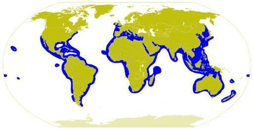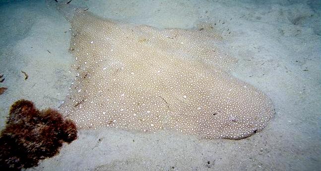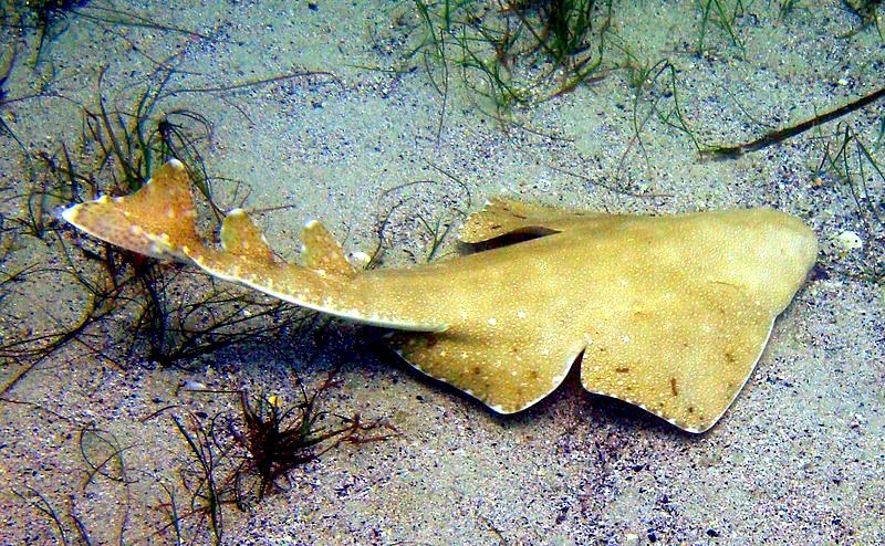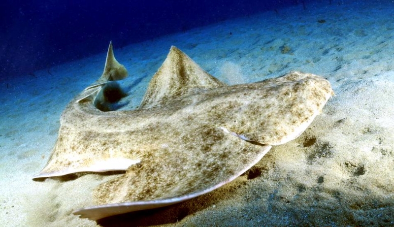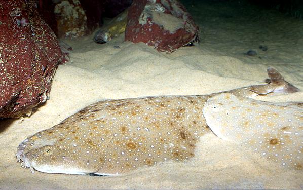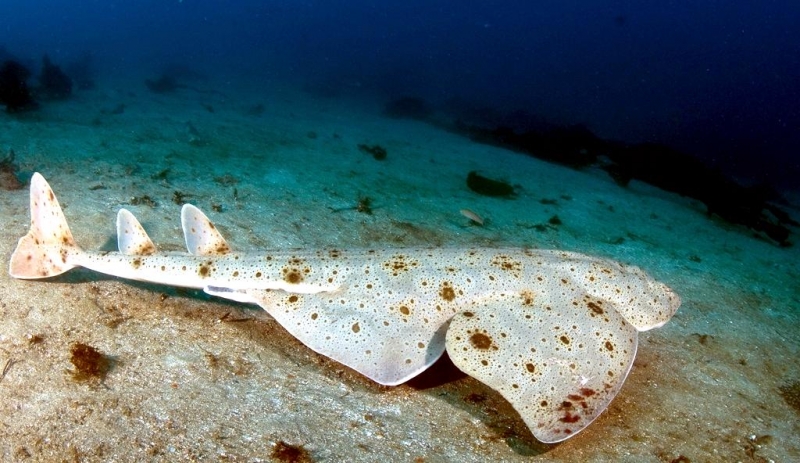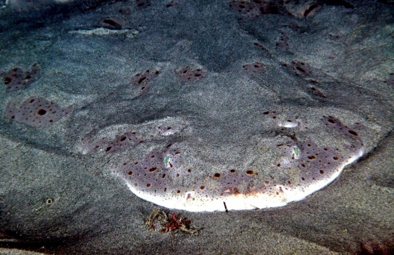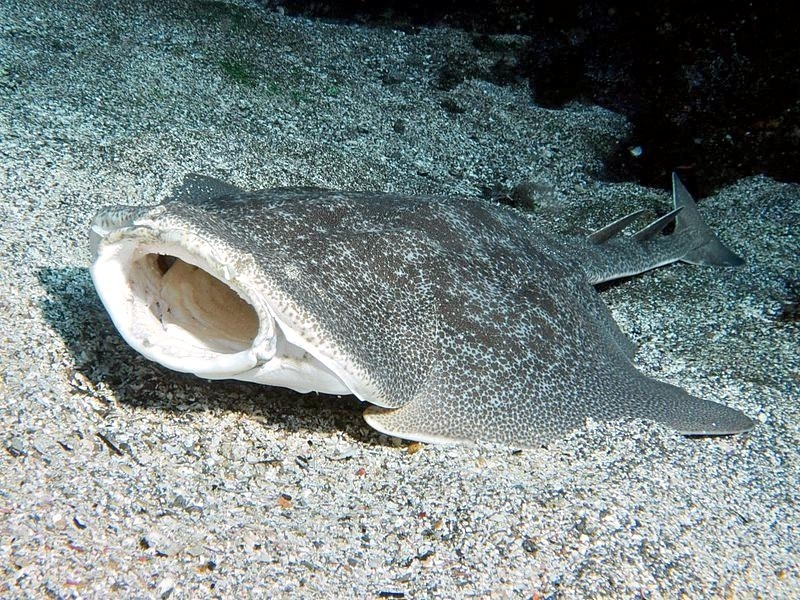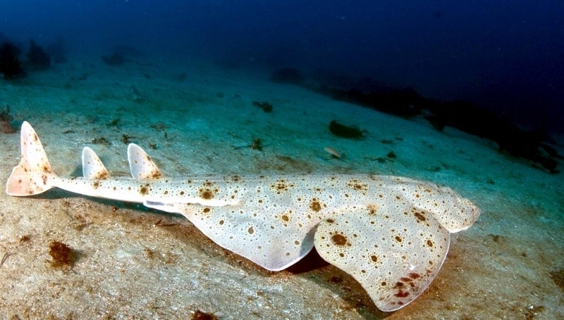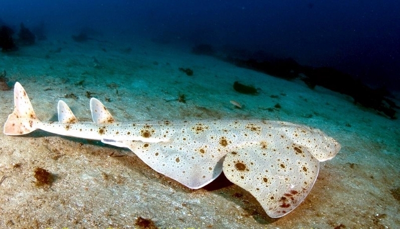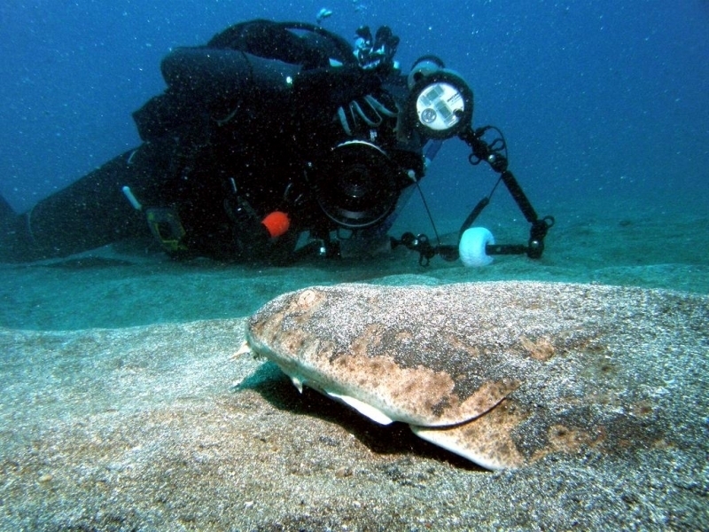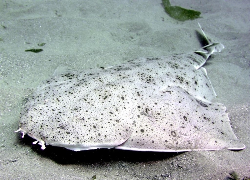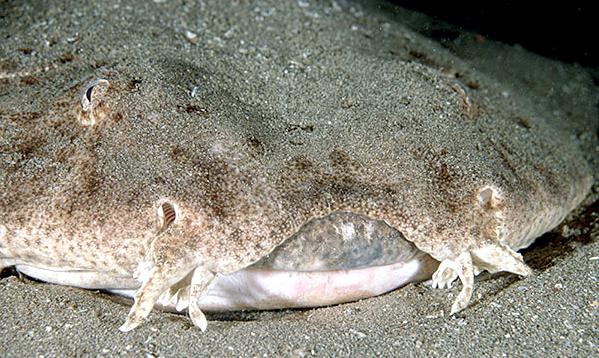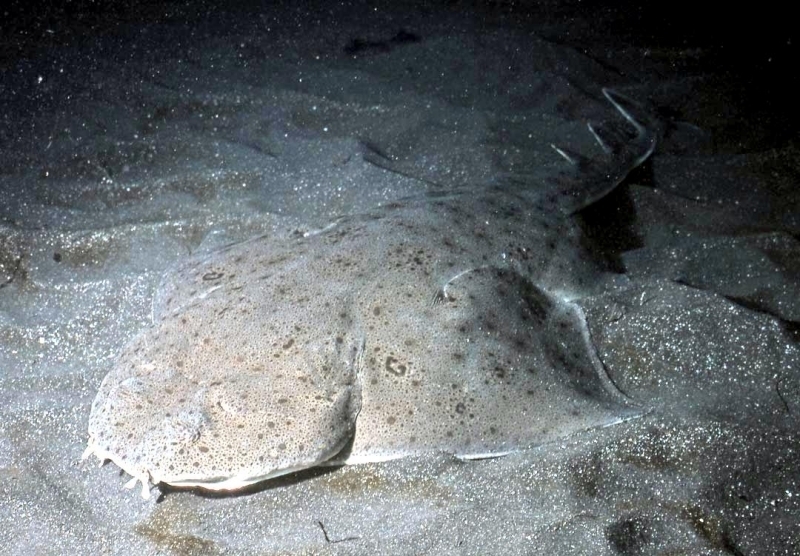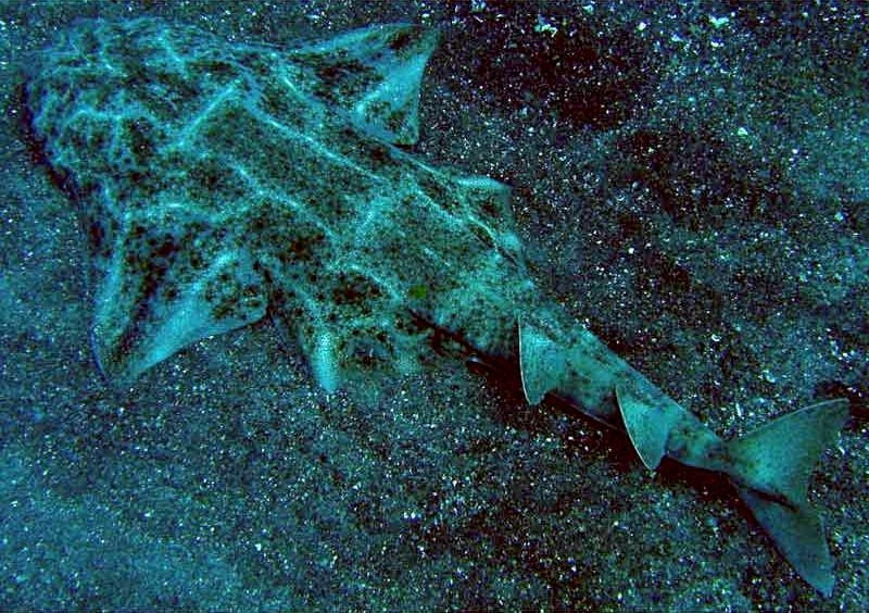 Its extensible jaws are lined with long, needle-like teeth that snap rapidly in the upward direction. The Angel shark is nocturnal. It spends most of the day buried in the sea-bed, with only its eyes protruding. It manipulates a position that allows it to dart forward at a startling speed to devour prey. These amazingly beautiful creatures feast of passing fish, croakers, flounder, mollusks, squid and crustaceans. The Angel Shark is ovoviviparous. The litters rarely exceed 10-12 pups at a time. The female Angel Shark retains the eggs inside the body, till they are ready to hatch. After a gestation period of around 10 months, the female gives birth to pups not more than 30 centimeters in length. The genus is not normally aggressive but if interfered with, the Angel Shark does snap & bite. The shark normally inhabits the sandy sea-bed but it is also sighted offshore in the bays along Norway, Mauritania, the Canary Islands, Mediterranean Sea, Black Sea, Alaska, Gulf of California and Costa Rica. It is regularly seen along kelp forest fringes. Its flat body, olive colored blotches and flat pectoral fins provide the Angel Shark with a perfect camouflage on the ocean & sea beds.