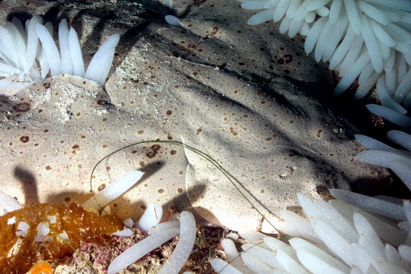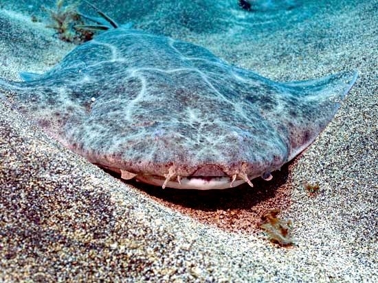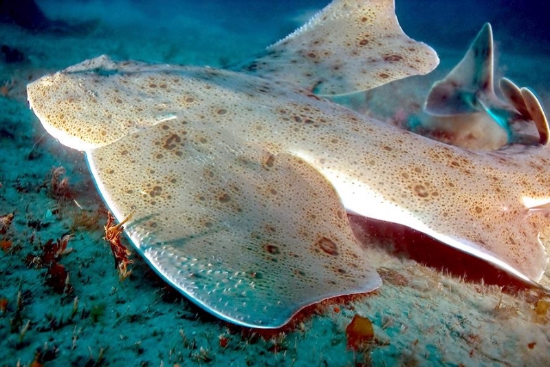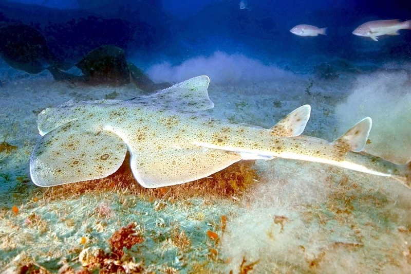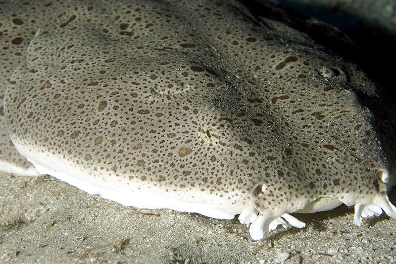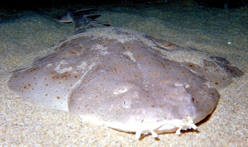 The Angel Shark is a magnificent marine creature, with a flattened body and broad pectoral fins. This ovoviviparous member of the ‘Squatinidae’ family bears a close resemblance to rays and skates. The Angel Shark inhabits the warm tropical and temperate seas, feeding on an array of fish & crustaceans. Angel Sharks have inhabited our oceans for millions of years. Today, the genus exhibits an improved anatomy which is the product of over 400 million years of evolution of which there are 15 different Angel Shark species currently known. The Angel Shark has large, horizontal pectoral and pelvic fins, generally used for balancing and braking. It has 2 dorsal fins and unlike others in the genus, the Angel Shark has a longer caudal fin lower lobe. Under ideal conditions, the genus grows to a length of 8 feet, weighing around 35 kilograms. The skin color varies from gray to reddish-brown or greenish-brown with scattered spots. The young ones exhibit net-like markings with dark blotches. The Angel Shark has whisker-like projections or nasal barbels near the nostrils. These projections help the shark to taste & feel. Its large eyes have vertically slit pupils that offer the predator an all-round vision for an almost perfect ambush every time.