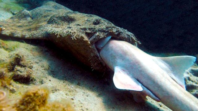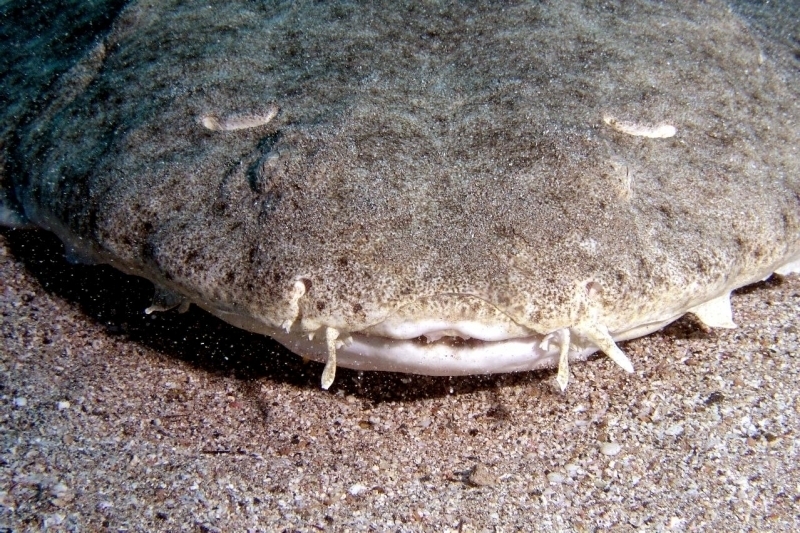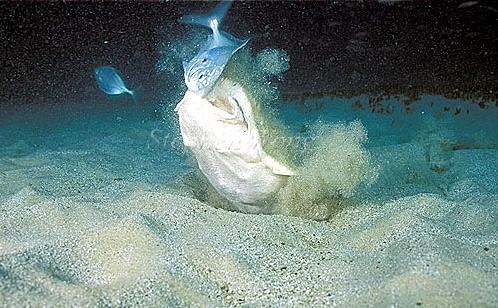 * Angel Sharks have incredibly sharp teeth and are not afraid to use them on unsuspecting victims who lure near their vicinity, hence the ironic name of “Sand Devil”. If a diver exposes it completely by fanning the sand away from an Angel Shark‘s back, it is still reluctant to move. An Angel Shark is known to lie in wait for over a week until the right food passes by.