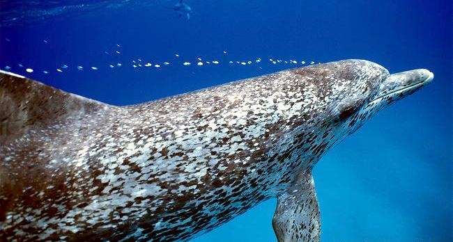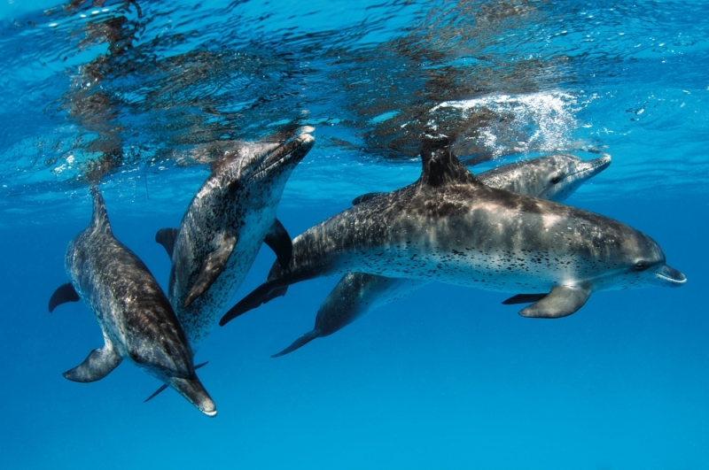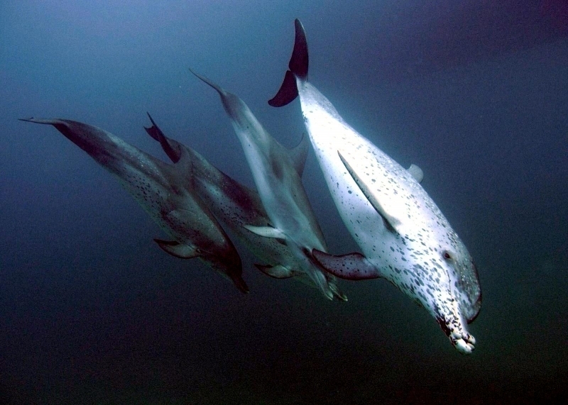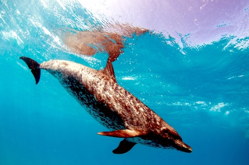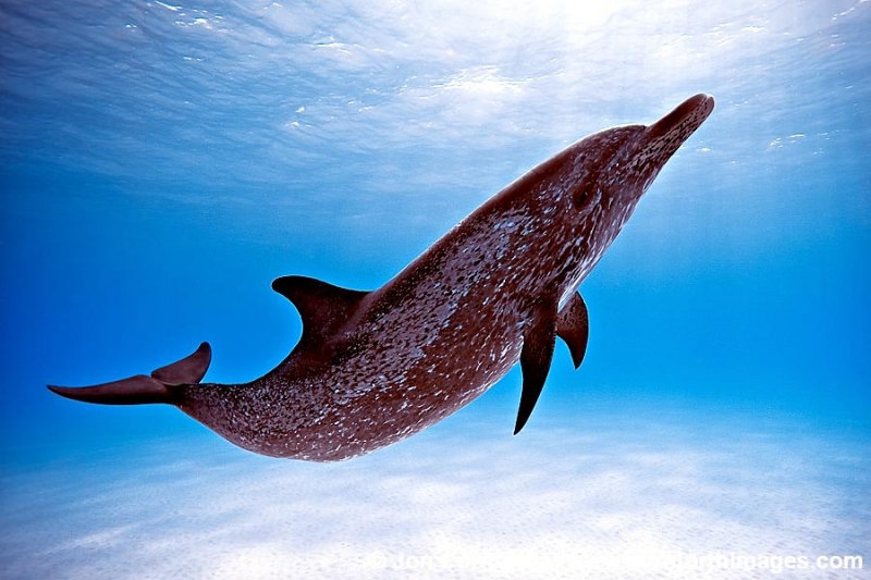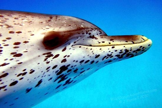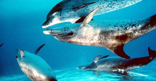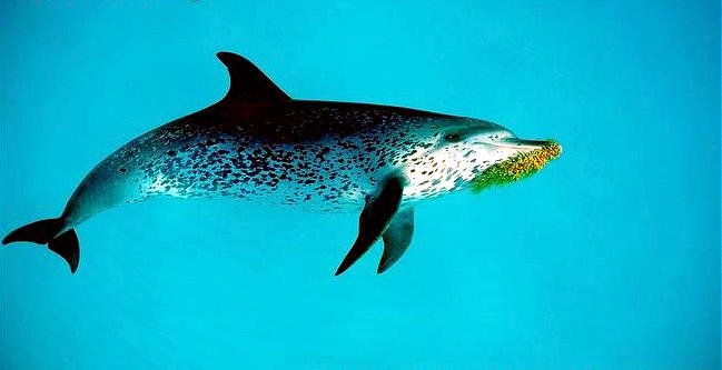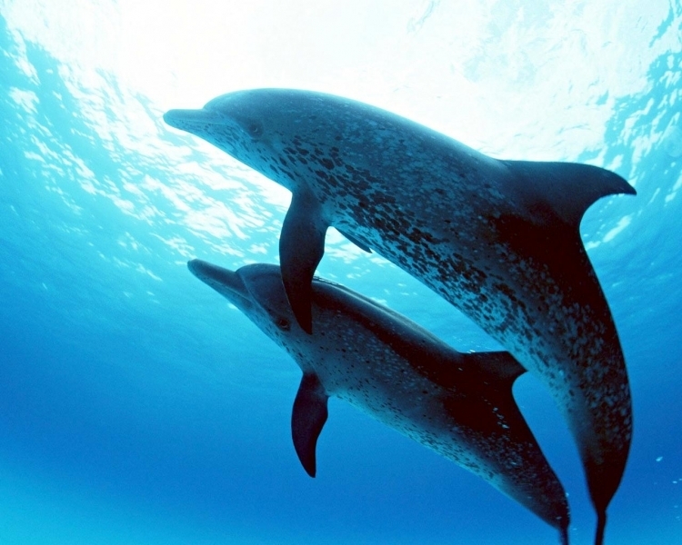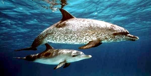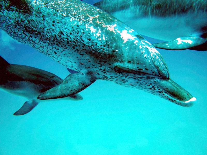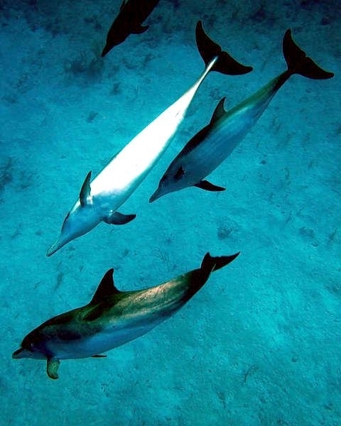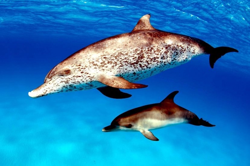 Atlantic Spotted Dolphins are agile swimmers known to flip & leap from the water. They communicate using whistles that are distinguishable among individuals by humans. They also communicate with clicking and other sounds. This communication is sometimes used when the animal is in distress. The Atlantic Spotted Dolphin like other dolphin species, will support wounded or sick animals in the water until they recover or die. Atlantic Spotted Dolphins are found in the tropical & temperate waters of the Atlantic Ocean. They inhabit the continental shelf along the southeastern and Gulf coasts of the U.S. In the Bahamas however, the Atlantic Spotted Dolphin is found in the shallow waters over sand flats. Atlantic Spotted Dolphins feed on invertebrates like squid & octopuses as well as a wide range of fishes.