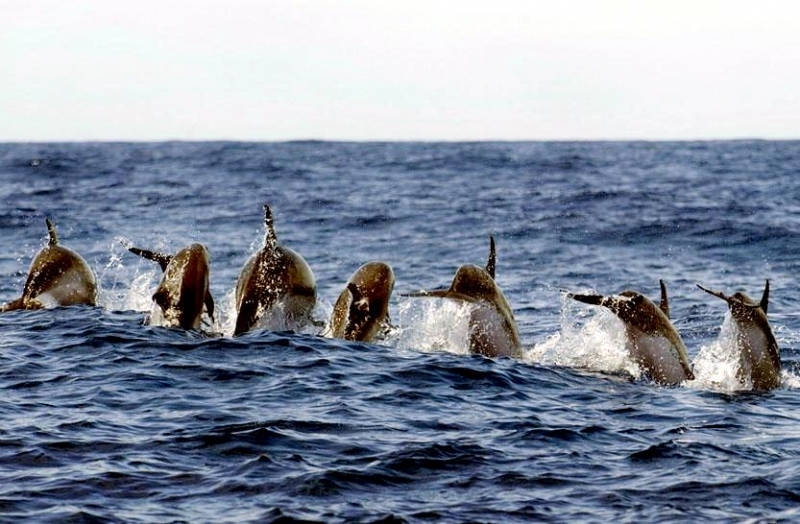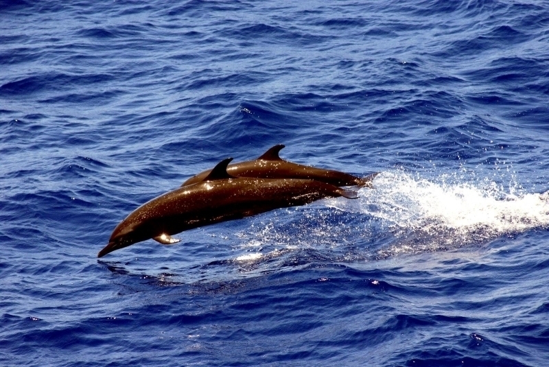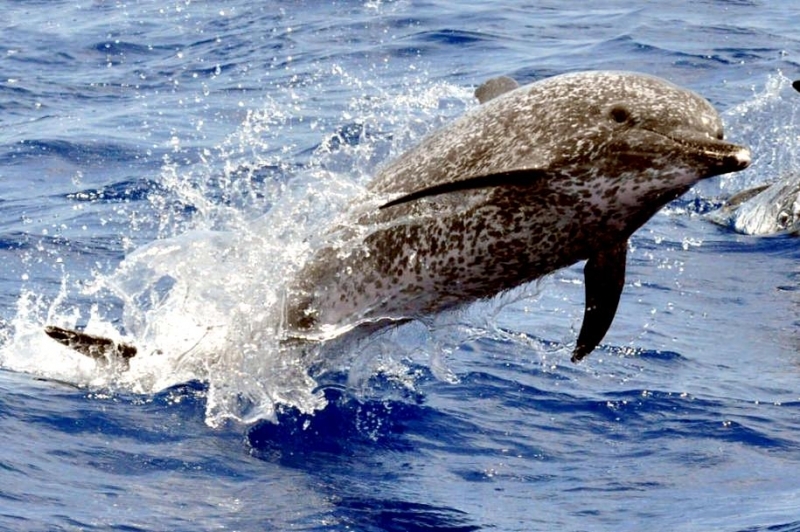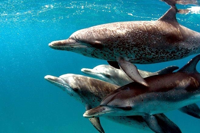 The Atlantic Spotted Dolphins have a long slender beak typical of Spinner Dolphins. This species has a stocky head & body and larger flippers, flukes and tail than Spotted Dolphins making them slightly larger in size. The average adult body length of the Atlantic Spotted Dolphin is 1.66-2.29 meters and females tend to be lightly larger than males. The average weight is approximately 90 kilograms. In spite of the larger size, it is often difficult to distinguish these 2 species when their ranges overlap. Atlantic Spotted Dolphins are known to travel in pods with Spinner Dolphins often forming subgroups separated by age, sex and reproductive status.