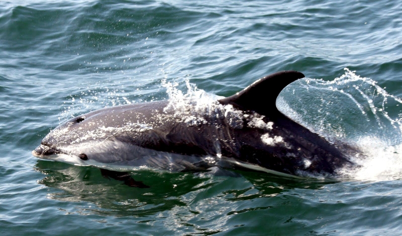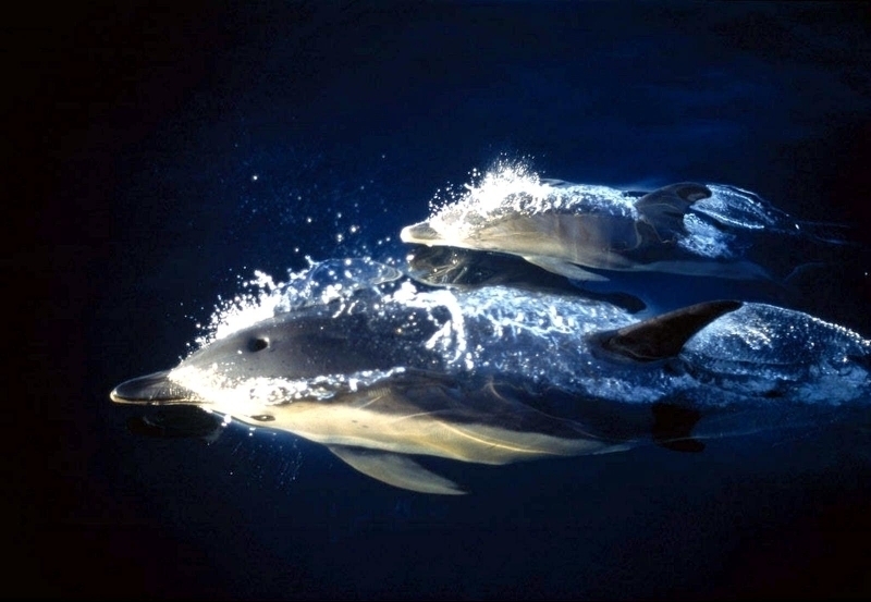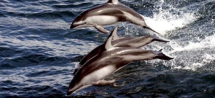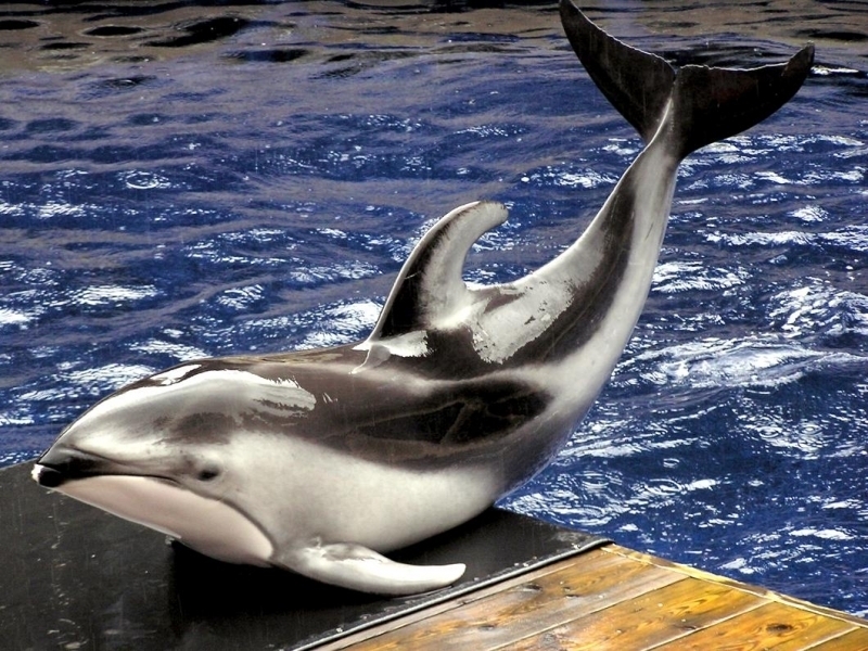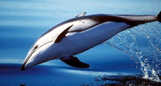 Atlantic White-sided Dolphins get their name from the Greek lagenos which means bottle, rhynchus which means snout or nose and acutus from Latin, which means sharp or pointed and refers to their sharply pointed dorsal fins. These dolphins ranges from 2.53 meters in length. Their pectoral fins are about 30 centimeters in length and their dorsal fins may be up to 50 centimeters in height. Their tail flukes range from 30-60 centimeters across. Females may be considerably smaller than males and average only 182 kilograms. The dorsal region of is black, their flanks are gray and their ventral surface is white. This dolphin’s distinguishing characteristic is the yellow-white patches on their dorsal side and the black rings around their eyes. Their beaks are prominent and contain 30-40 pairs of pointed teeth. Male longevity is about 22 years, female longevity is about 27 years.
