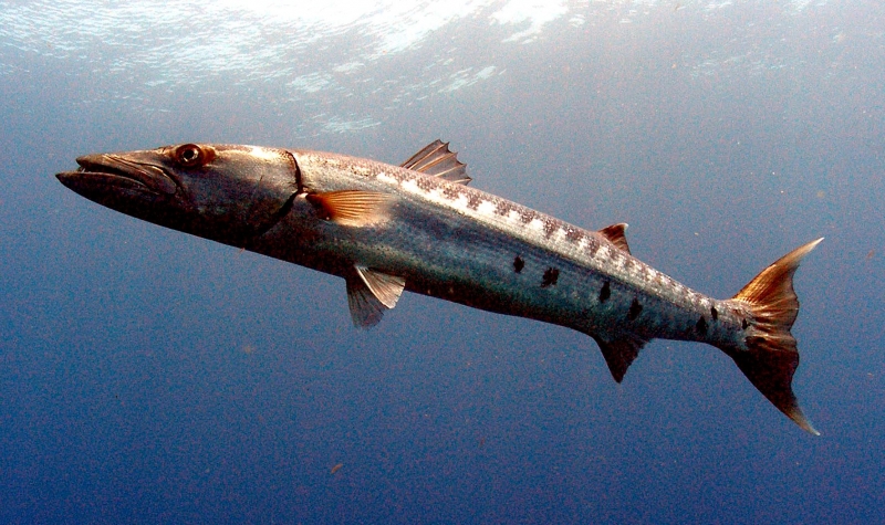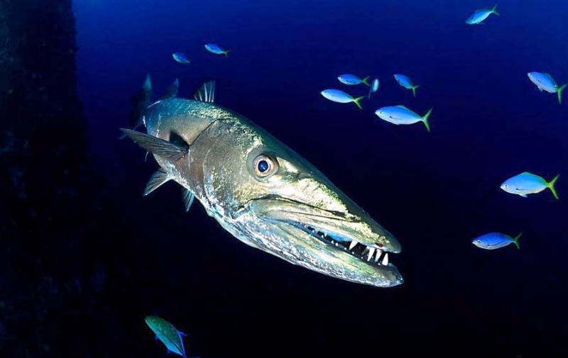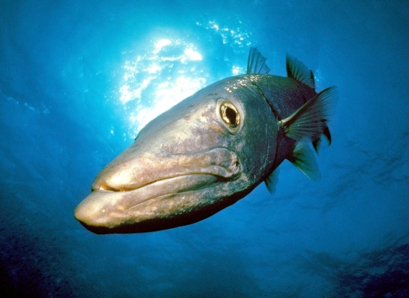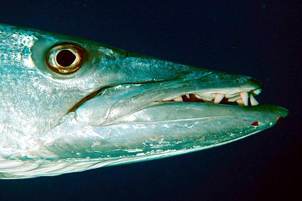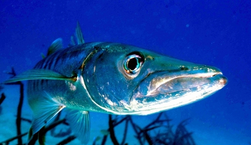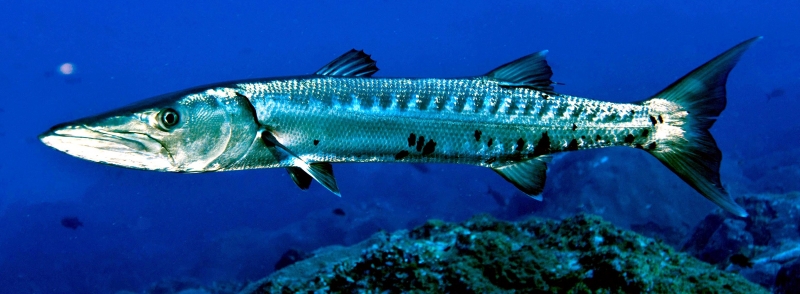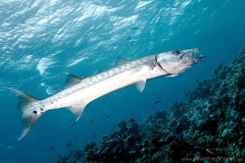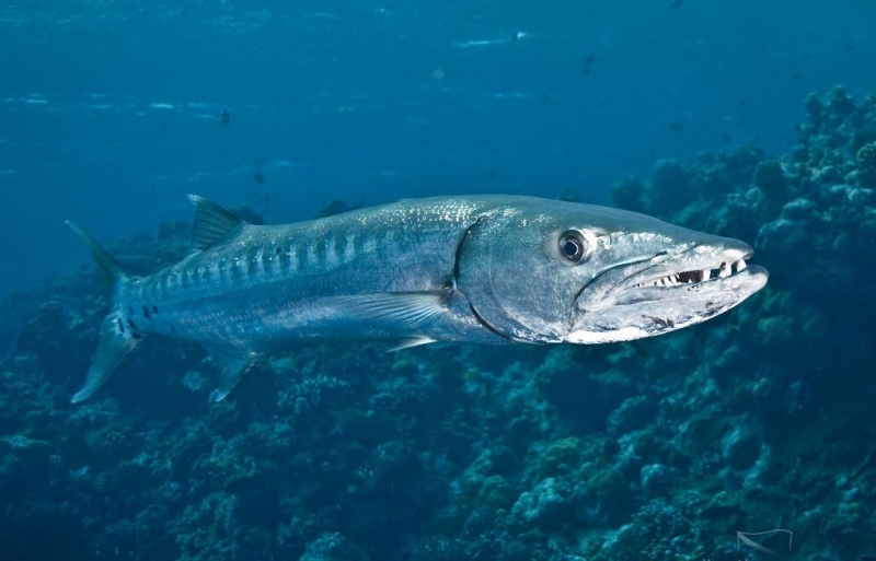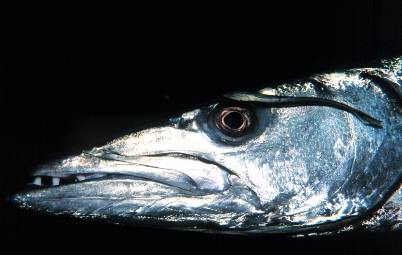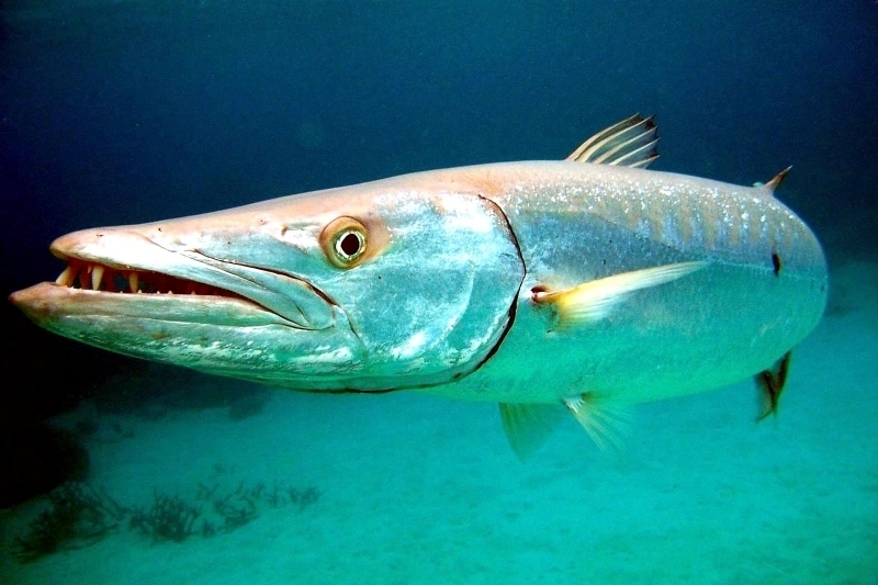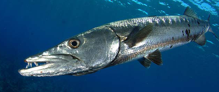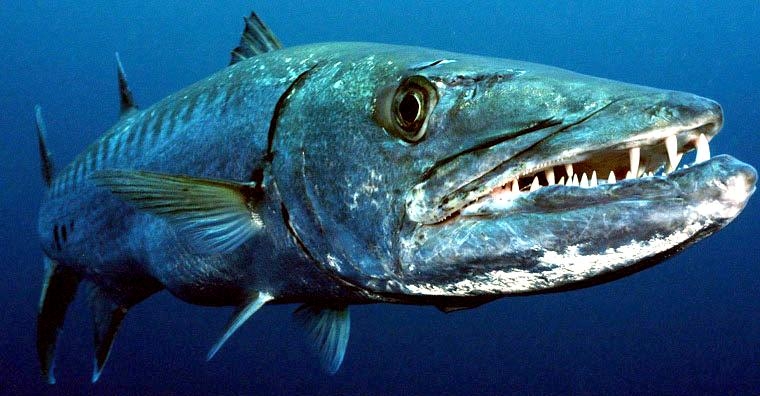 Barracudas are curious, fearsome-looking, usually solitary predators common to reefs & shallows of Florida and the Caribbean as well as in the Indo-Pacific regions of the Red Sea and east coast of Africa to Hawaii, Marquesas and Tuamotos Islands; throughout Micronesia. Western Atlantic: Massachusetts, Bermuda and throughout the Caribbean Sea to Brazil. Eastern Atlantic: Sierra Leone, Côte d’Ivoire, Togo, Nigeria, Senegal; Mauritania; St. Paul’s Rocks; Sáo Tomé Island. The Barracuda is a large species of fish found in the warmer, coastal regions of the world’s oceans. There are more than 20 different species of Barracuda that range in size from less than 50 centimeters to nearly 2 meters in length. The name Barracuda actually comes from Haiti, where the native island terms bara and couta are combined. Bara means fierce or dangerous and couta means fish and that Barracuda can also be spelled Barracouta. The Barracuda is widely spread across the oceans but is more commonly found in the more tropical regions where there is an abundance of food. Although Barracuda can be found in the deep ocean, they tend to prefer coastal habitats along continental shelves and close to coral reefs. Despite the difference in size & color between Barracuda species, all species of have a similar elongated appearance and pointed head with powerful jaws, containing rows of sharp fang-like teeth used for eating larger prey. The Barracuda is known to be an aggressive and dominant predator, often relying on the surprise tactic in order to catch it’s prey. Barracudas are also able to swim at over 40 kilometers per hour in short bursts which they do to overtake prey that may be trying to swim away.