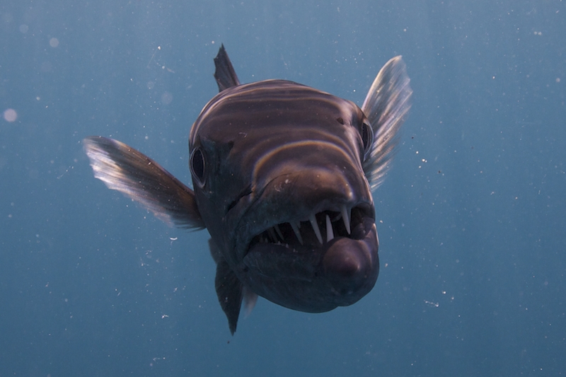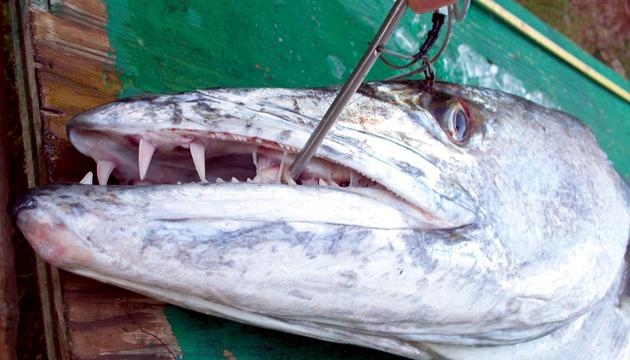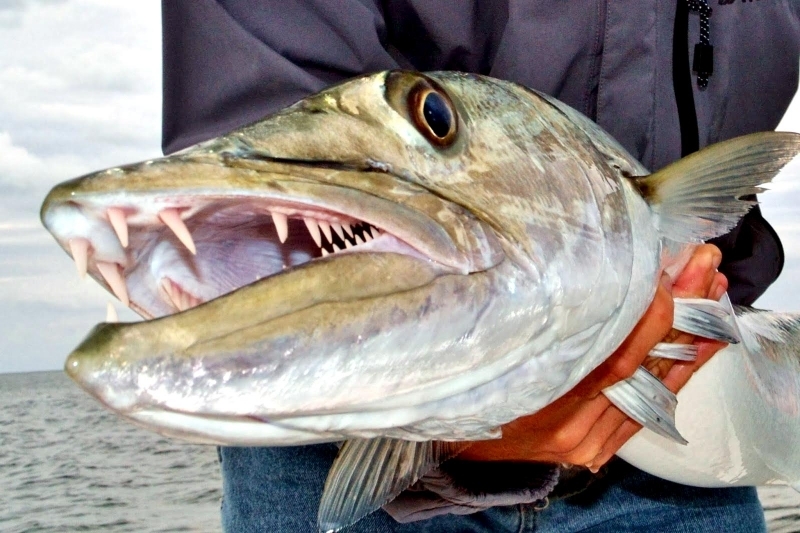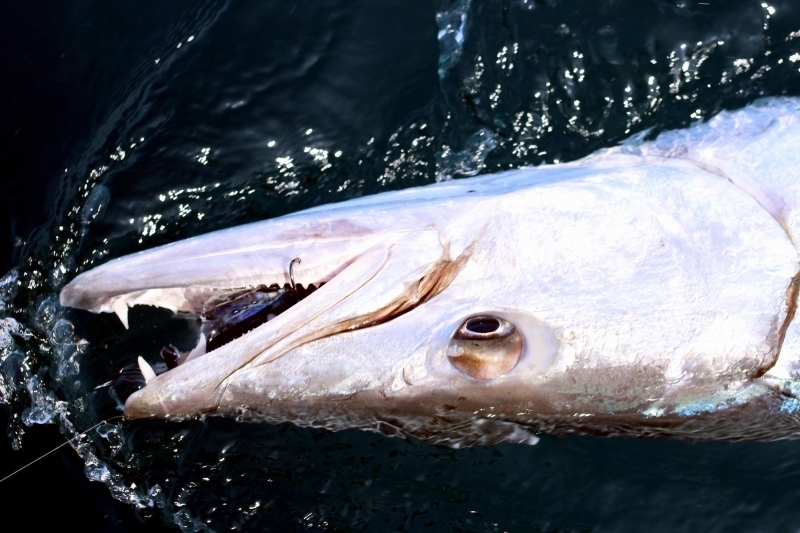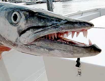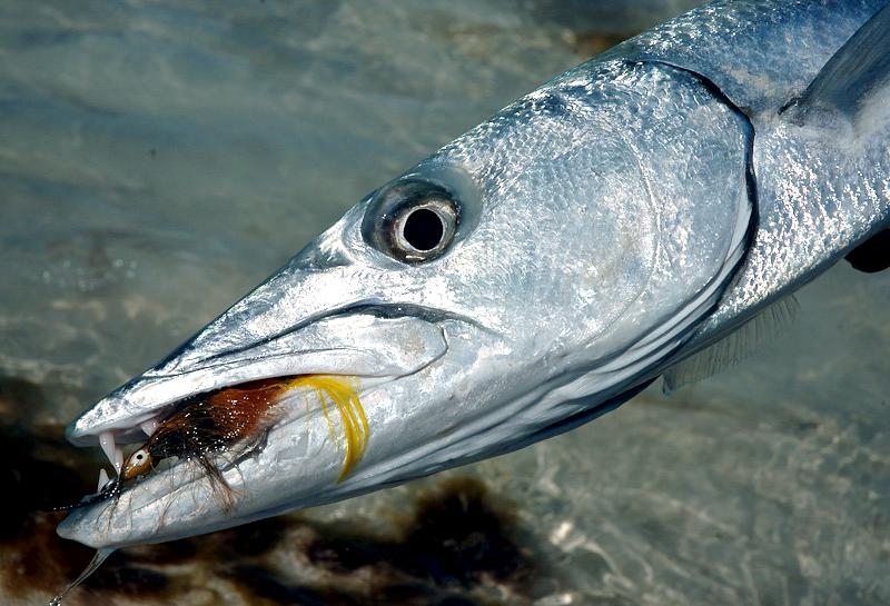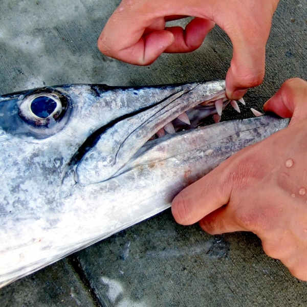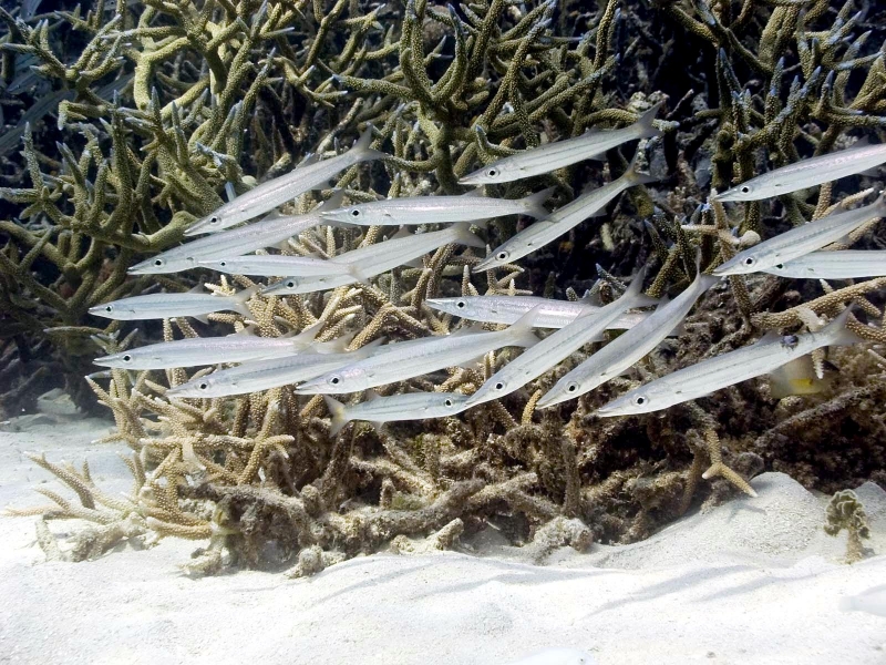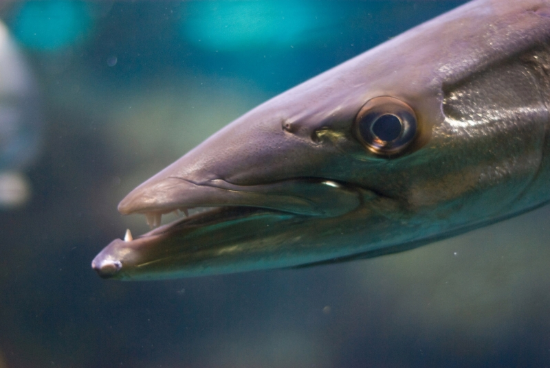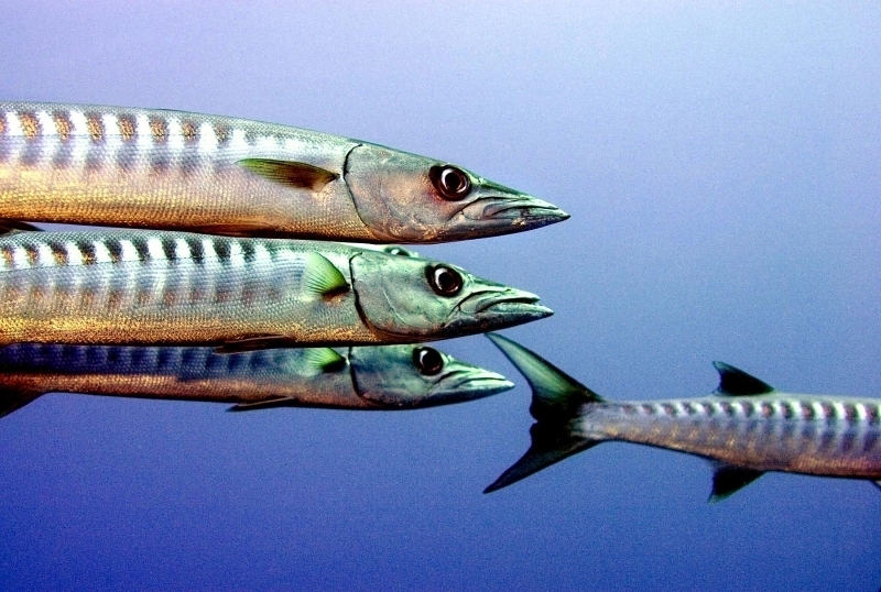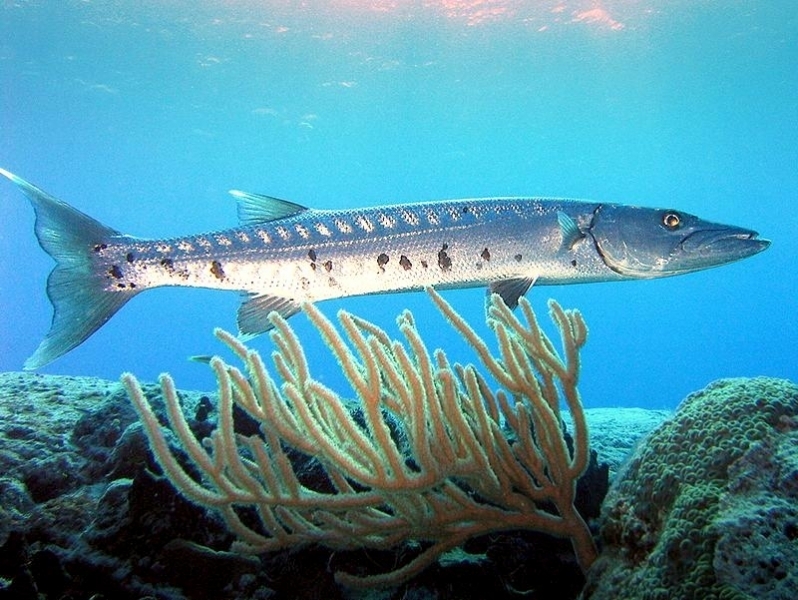 Barracudas are curious, fearsome-looking, usually solitary predators common to reefs & shallows of Florida and the Caribbean as well as in the Indo-Pacific regions of the Red Sea and east coast of Africa to Hawaii, Marquesas and Tuamotos Islands; throughout Micronesia. Western Atlantic: Massachusetts, Bermuda and throughout the Caribbean Sea to Brazil. Eastern Atlantic: Sierra Leone, Côte d’Ivoire, Togo, Nigeria, Senegal; Mauritania; St. Paul’s Rocks; Sáo Tomé Island. The Barracuda is a large species of fish found in the warmer, coastal regions of the world’s oceans. There are more than 20 different species of Barracuda that range in size from less than 50 centimeters to nearly 2 meters in length. The name Barracuda actually comes from Haiti, where the native island terms bara and couta are combined. Bara means fierce or dangerous and couta means fish and that Barracuda can also be spelled Barracouta. The Barracuda is widely spread across the oceans but is more commonly found in the more tropical regions where there is an abundance of food. Although Barracuda can be found in the deep ocean, they tend to prefer coastal habitats along continental shelves and close to coral reefs. Despite the difference in size & color between Barracuda species, all species of have a similar elongated appearance and pointed head with powerful jaws, containing rows of sharp fang-like teeth used for eating larger prey. The Barracuda is known to be an aggressive and dominant predator, often relying on the surprise tactic in order to catch it’s prey. Barracudas are also able to swim at over 40 kilometers per hour in short bursts which they do to overtake prey that may be trying to swim away.
