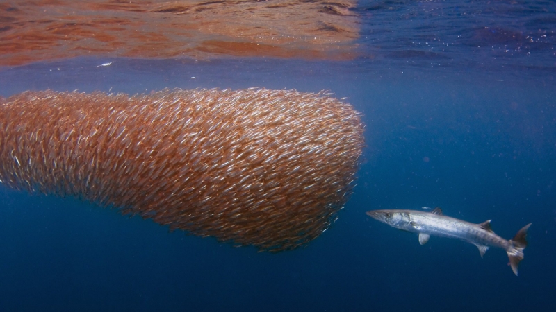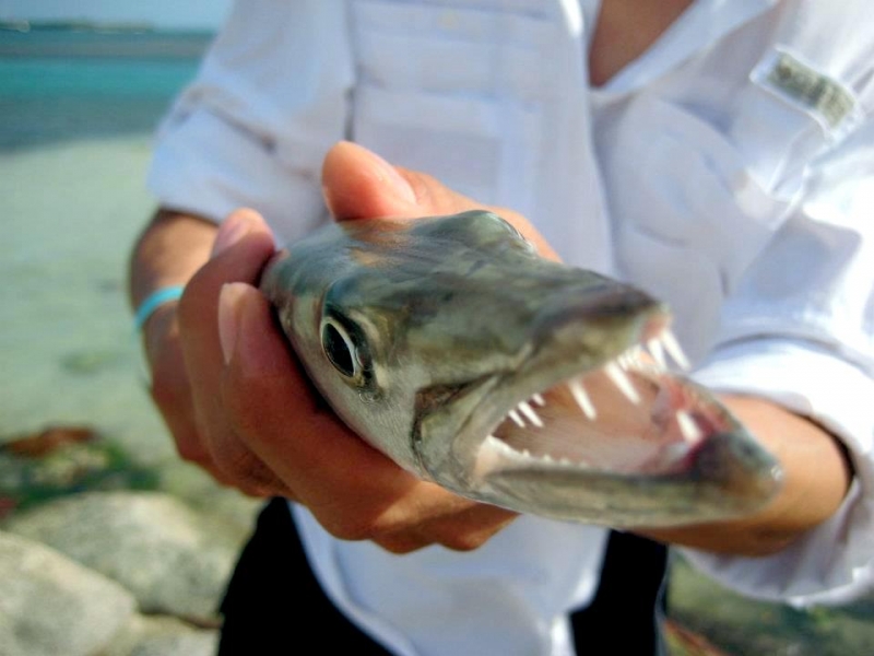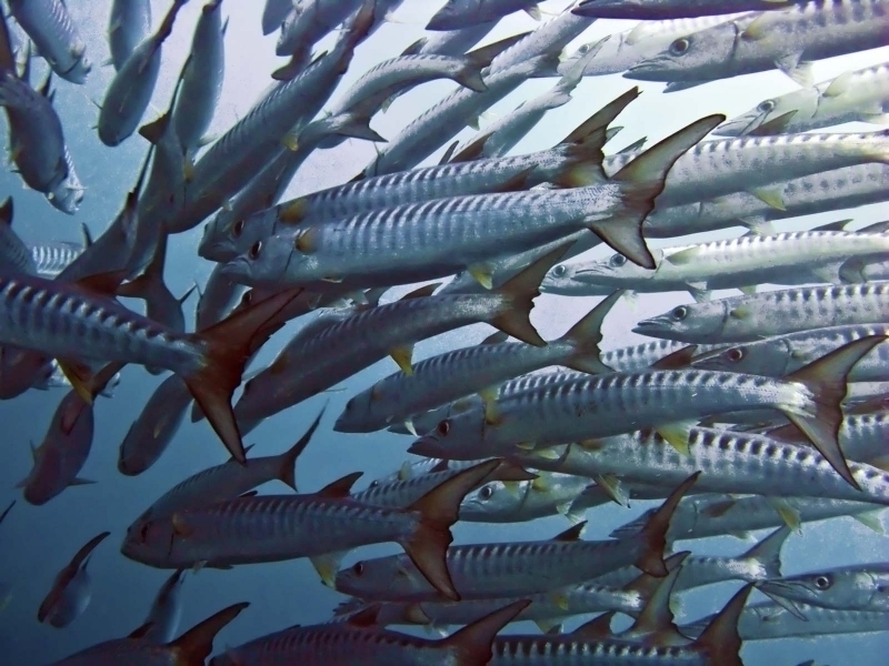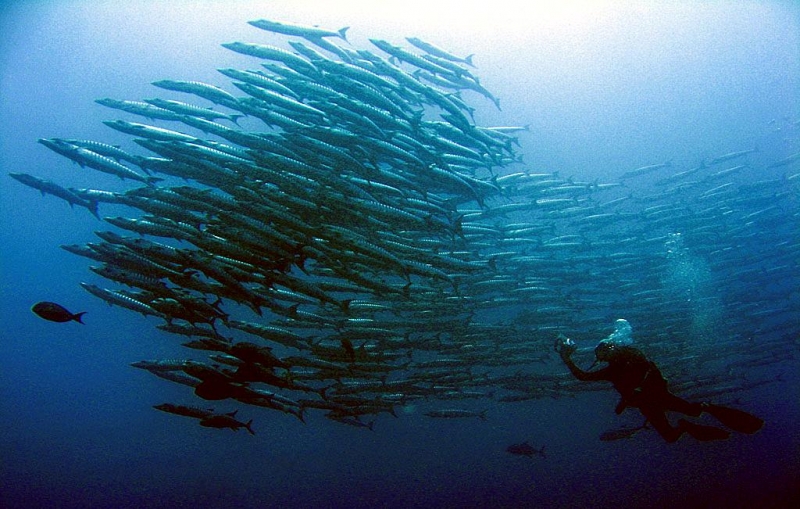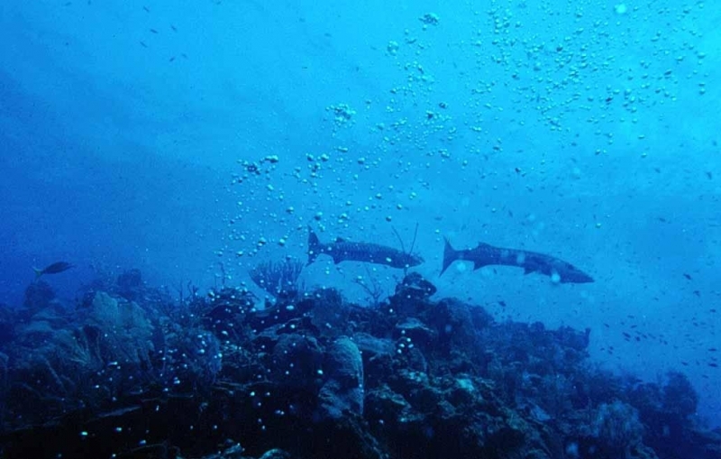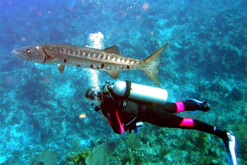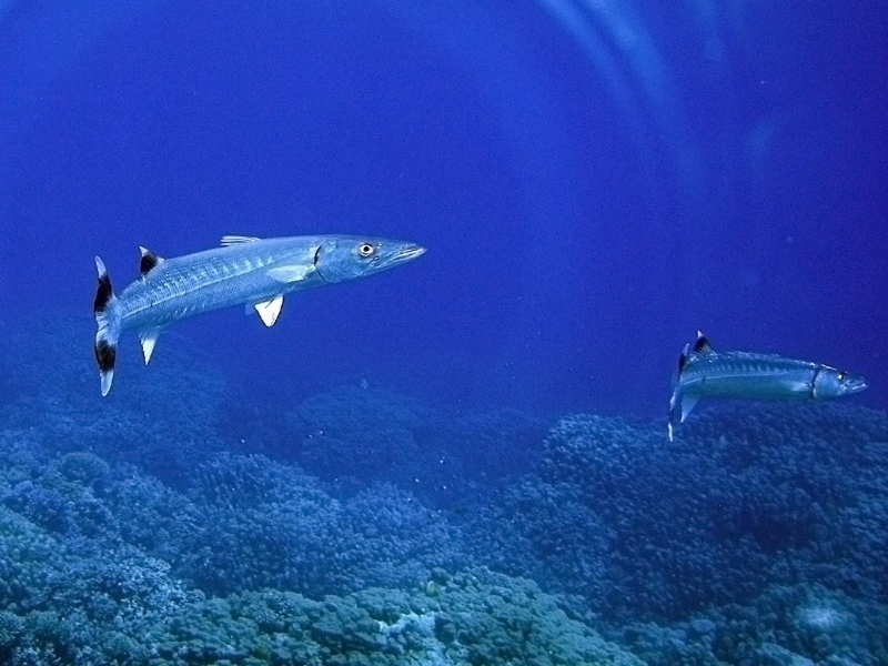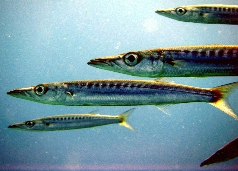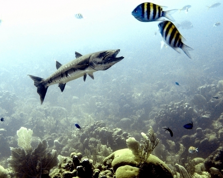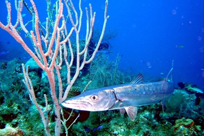 The Barracuda is an opportunistic predator, feeding only on other animals in the surrounding water. The carnivorous Barracuda primarily feeds on smaller species of fish, marine invertebrates, crustaceans & squid which the Barracuda usually ambushes with tremendous power. They are distinguished by a torpedo-shaped body, large eyes and mouth, formidable teeth, a double emarginate (notched) tail fin with pale tips on each lobe and the presence of a few scattered black blotches on the lower sides. The top of the large head between the eyes is flat or concave. Maximum Length: 2 millimeters; Maximum Weight: 50 kilograms. Environment: pelagic; brackish; marine; Depth Range: 0-100 meters. Climate: subtropical; 30°N-30°S. Found predominantly at or near the surface though it has been recorded down to 100 meters. Juveniles occur among mangroves, estuaries & shallow sheltered inner reef areas; adults occur in a wide range of habitats from murky inner harbors to open seas. Diurnal and solitary, but can also be found in small aggregations. The Great Barracuda is a top predator of reefs and feeds on a variety of fishes, cephalopods and occasionally shrimp. Due to the fact that Barracudas can grow into very large sized fish, it has few natural predators in the ocean besides sharks, large sea birds and Killer Whales. Humans also one of the Barracuda’s main predators as they are hunted & eaten all around the world. Although little is really known about the reproduction of the Barracuda, females are known to spawn during the spring. The female releases her eggs into the water which are then fertilized externally. As with many fish species once spawned, the mother has no interest in caring for her young. Due to it’s aggressive nature, the Barracuda is one of the most dominant predators within it’s coastal environments and has even been known to act aggressively towards humans diving or snorkeling in the water.