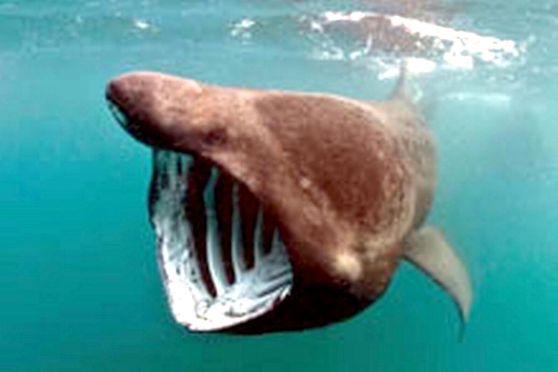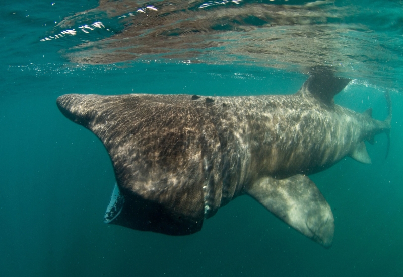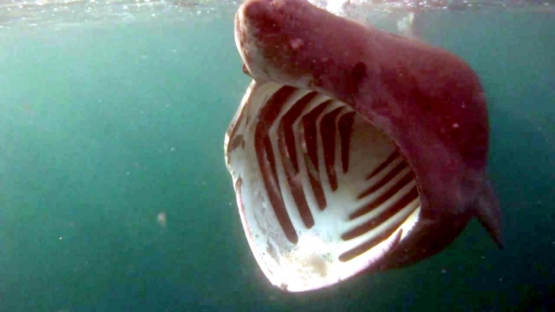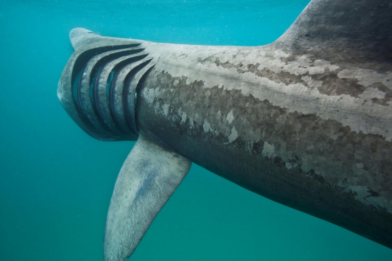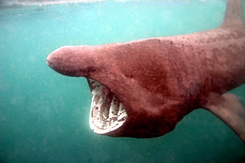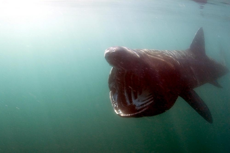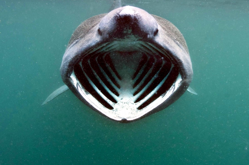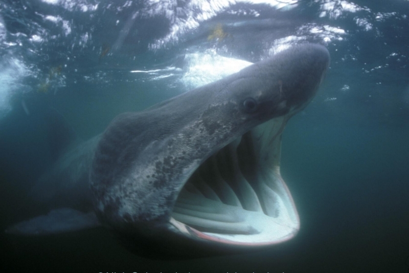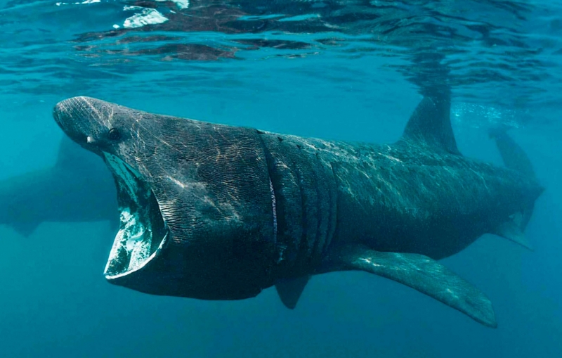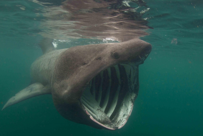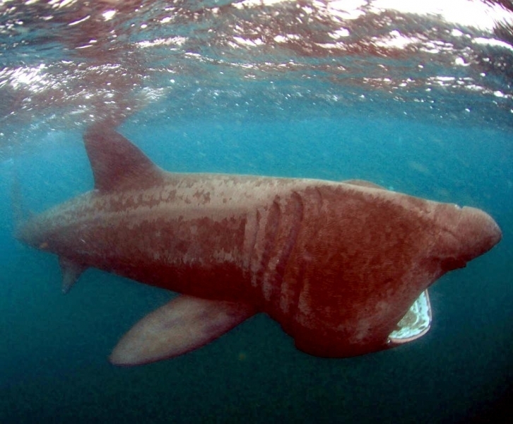 Basking Sharks are recognized by their huge sizes, conical snouts, sub-terminal mouths, extremely large gill slits, dark bristle-like gill rakers inside the gills, strong caudal keels and large lunate (curved) tails. Basking Sharks have numerous, small teeth. Their bodies are mottled gray-brown to slate-gray or black in color, sometimes with lighter patches on the dorsal side. The ventral side is paler, often with white patches under the snout & mouth or along the ventral side. It is the second largest fish/shark, only surpassed by the Whale Shark. As the 2nd largest shark species in the world, the Basking Shark has few natural predators. Apart from hunting by humans, Great White Sharks and Killer Whales are their only real threat, mainly due to the fact that Basking Sharks are slow & generally sluggish swimmers. Their average size is 6.7-8.8 meters with the largest measured Basking Shark at 9.75 meters and a 9.14 meters long individual was recorded that weighed 3,900 kilograms. There are also unconfirmed reports of Basking Sharks up to 13.7 meters long.