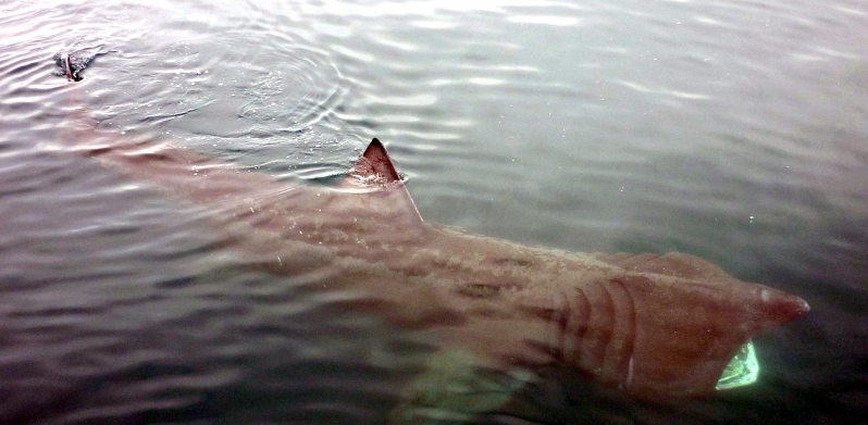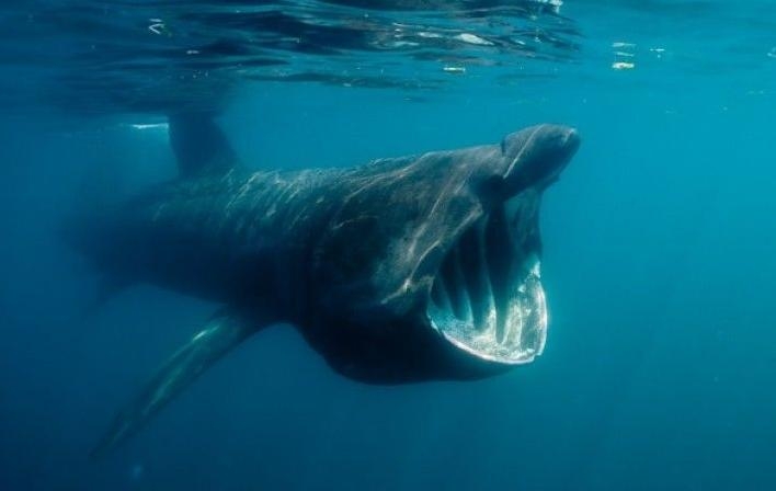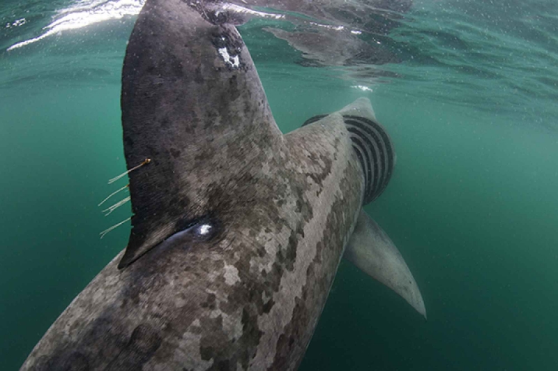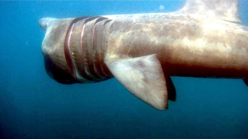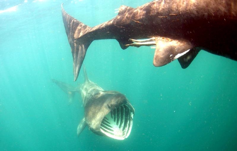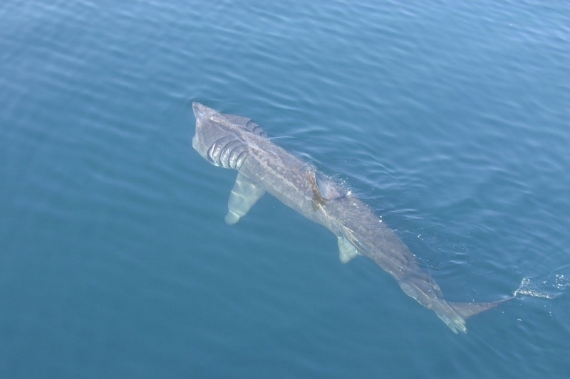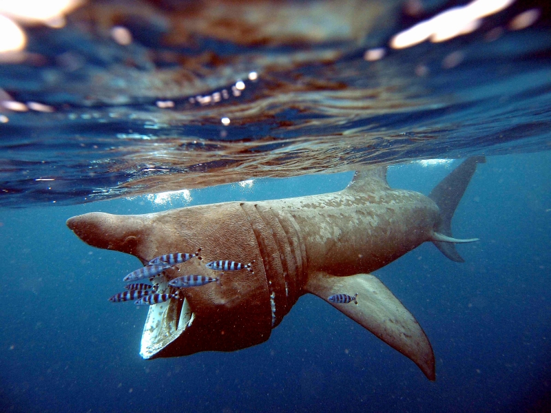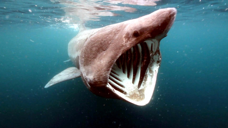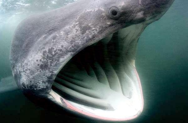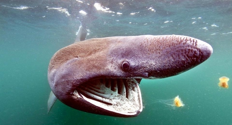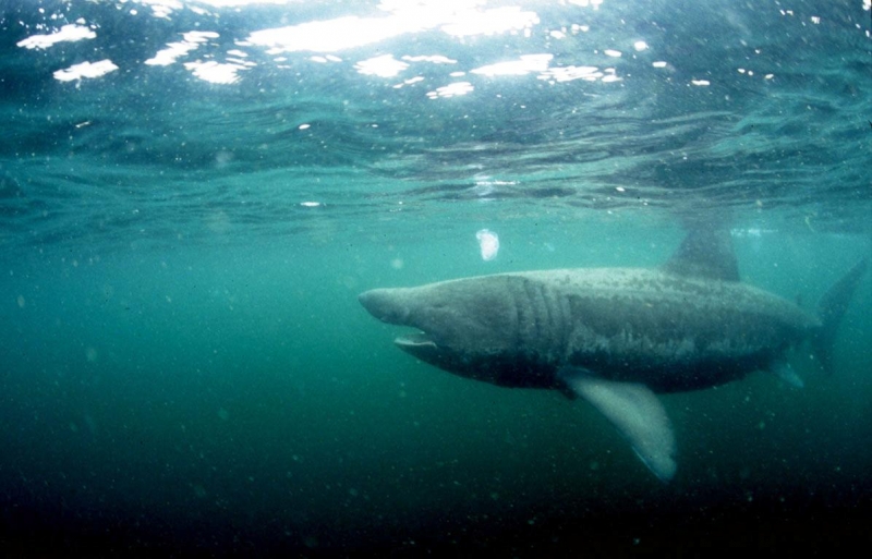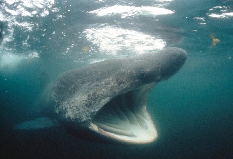 Basking Sharks are recognized by their huge sizes, conical snouts, sub-terminal mouths, extremely large gill slits, dark bristle-like gill rakers inside the gills, strong caudal keels and large lunate (curved) tails. Basking Sharks have numerous, small teeth. Their bodies are mottled gray-brown to slate-gray or black in color, sometimes with lighter patches on the dorsal side. The ventral side is paler, often with white patches under the snout & mouth or along the ventral side. It is the second largest fish/shark, only surpassed by the Whale Shark. As the 2nd largest shark species in the world, the Basking Shark has few natural predators. Apart from hunting by humans, Great White Sharks and Killer Whales are their only real threat, mainly due to the fact that Basking Sharks are slow & generally sluggish swimmers. Their average size is 6.7-8.8 meters with the largest measured Basking Shark at 9.75 meters and a 9.14 meters long individual was recorded that weighed 3,900 kilograms. There are also unconfirmed reports of Basking Sharks up to 13.7 meters long.