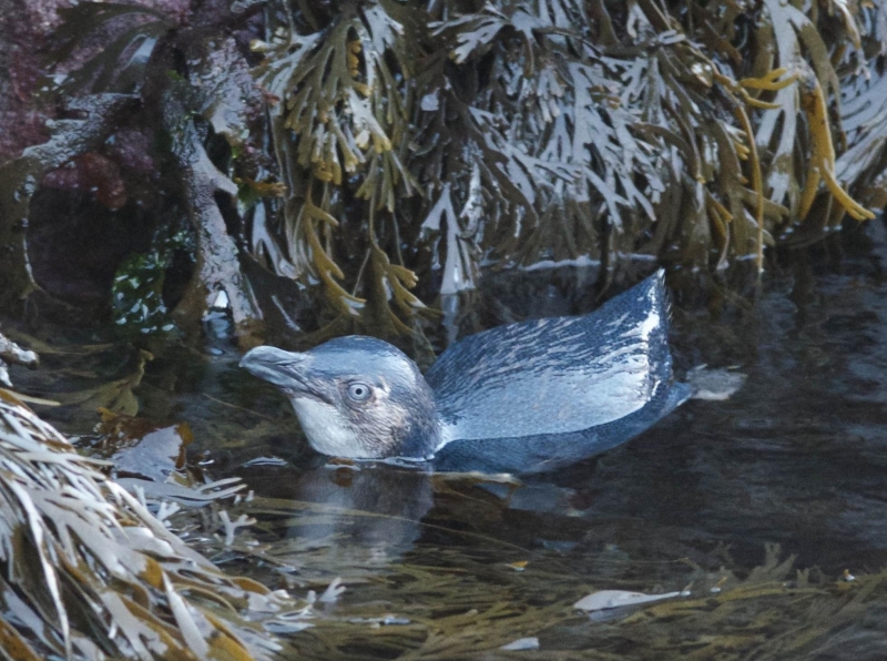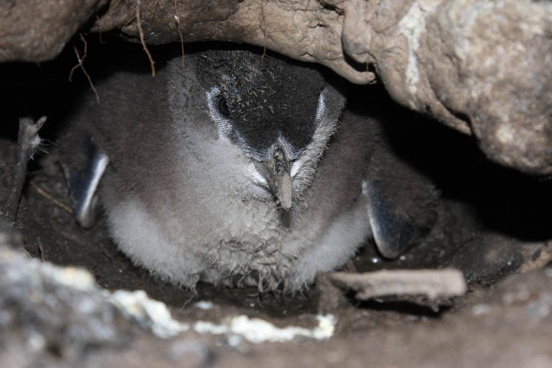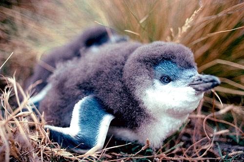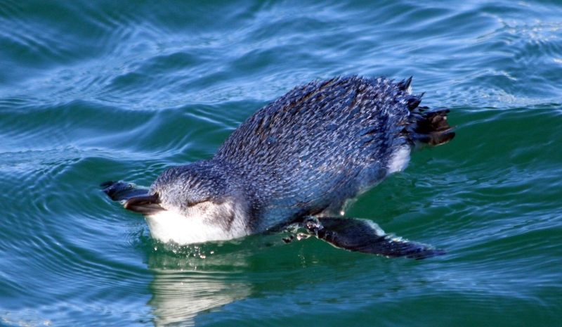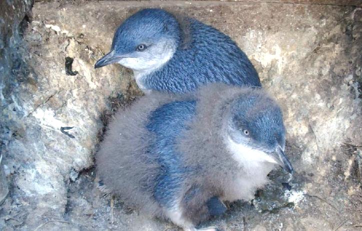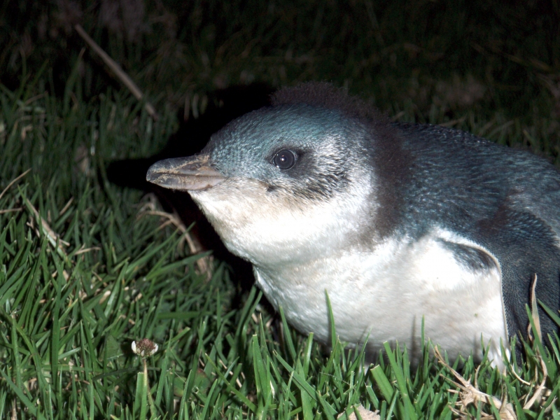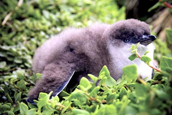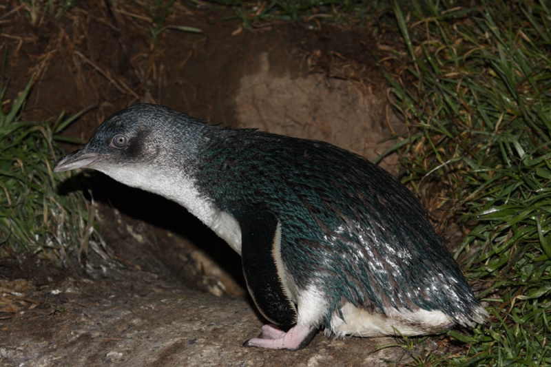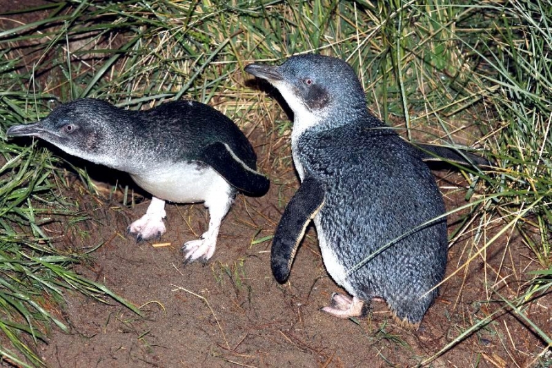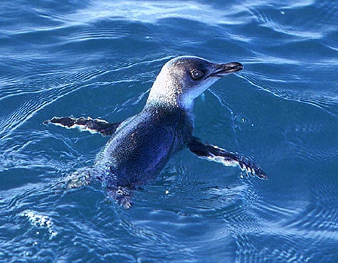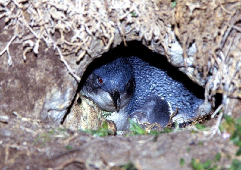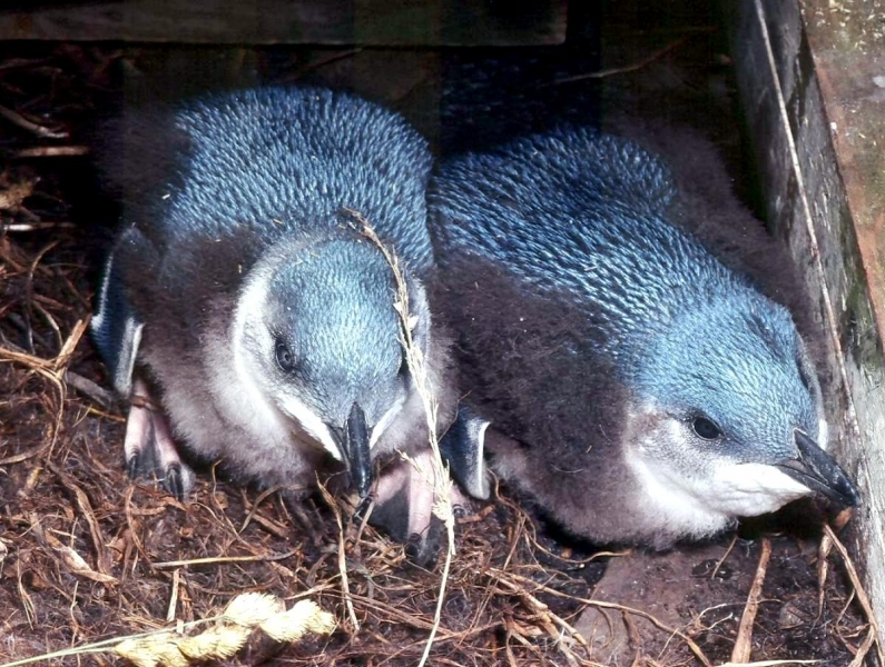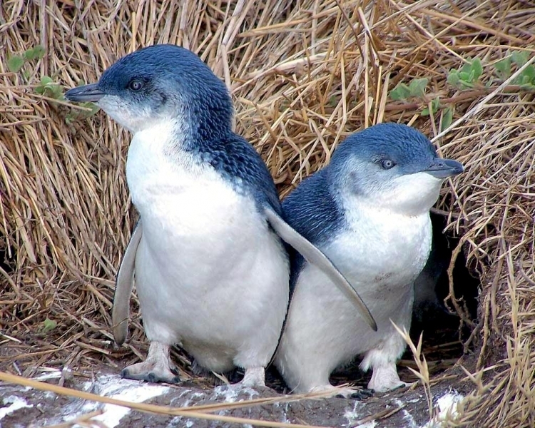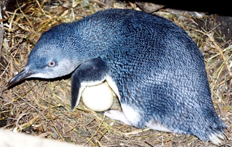 Some breeding sites have been found near urban areas where Blue Penguins have nested under buildings and other man-made structures. This species tends to return to the same breeding site year after year and juveniles often return to their birth site to breed when they reach sexual maturity. Blue Penguins feed on small fishes including anchovies, crustaceans & squid diving to average depths of 10-20 meters for an average of 24 seconds, although dives as deep as 60 meters have been recorded. They tend to remain within 25 kilometers of the coast when foraging, however longer trips up to 75 kilometers have been recorded. The Blue Penguin can reach swim speeds of up to 6 kph. They reach sexual maturity between the ages of 2-3. In New Zealand, eggs are laid between September and November. Typically 2 eggs are laid and incubated for about 36 days by both parents. Once hatched, parents alternate guarding & feeding the chicks for the first 2-3 weeks, then both parents leave the chicks to forage as more food is required to support their rapid growth. Chicks reach their adult weight of 1 kilogram in about a month and typically fledged about a month later.
