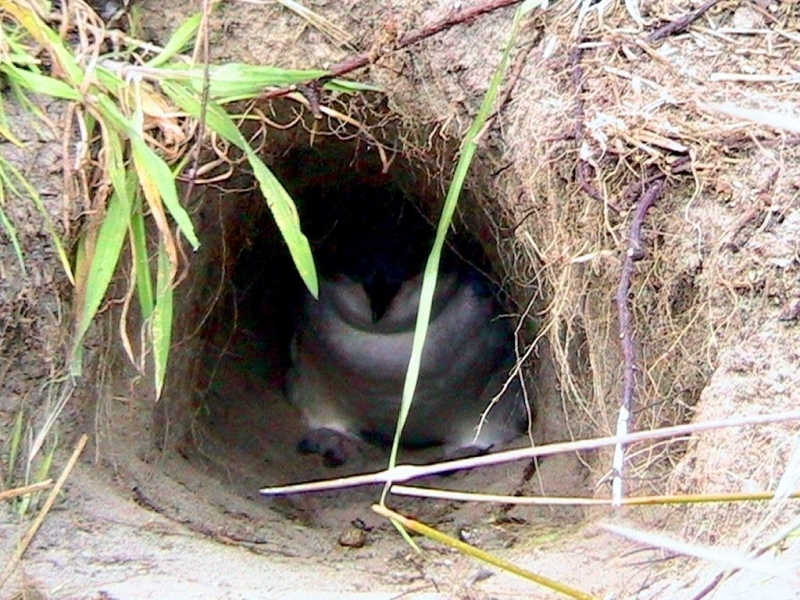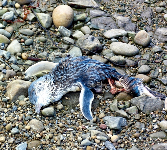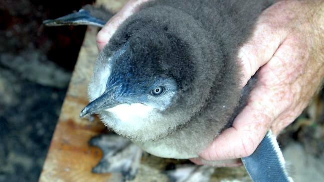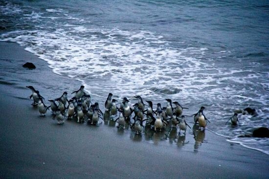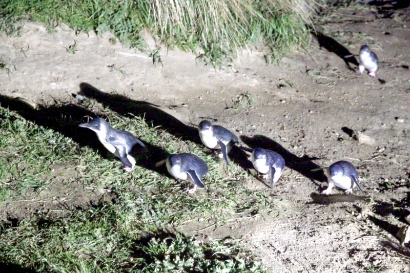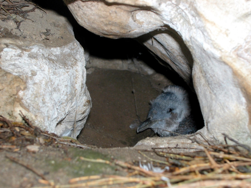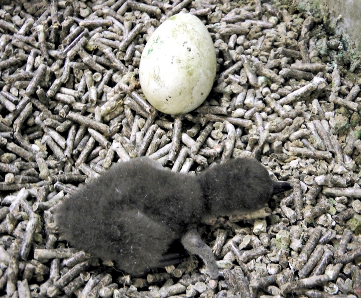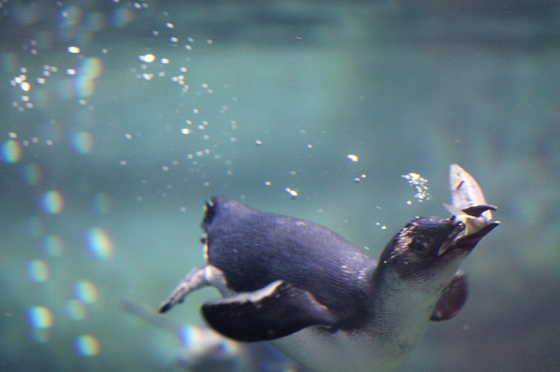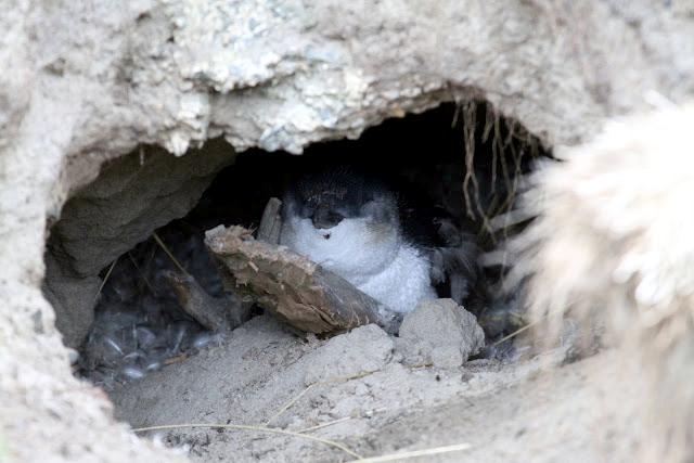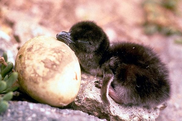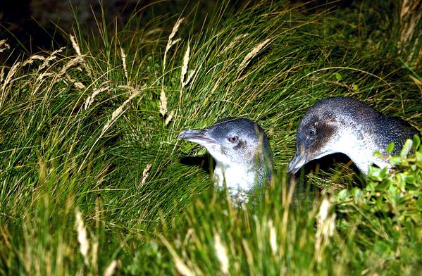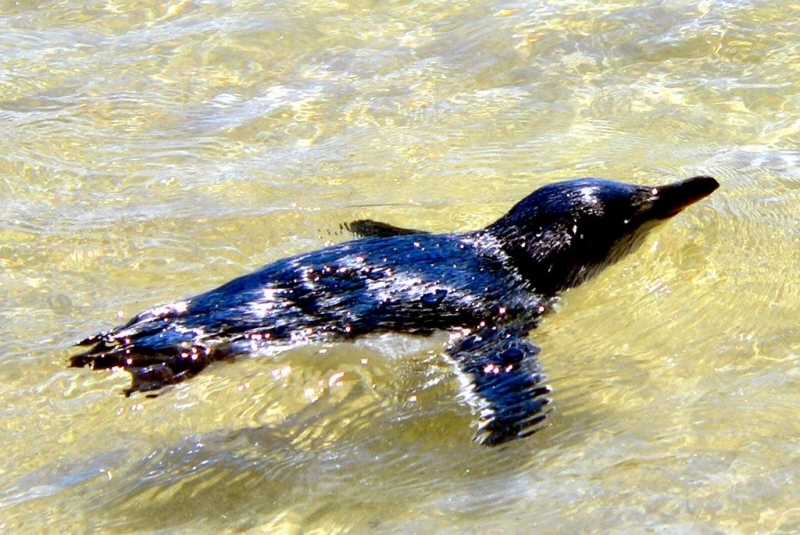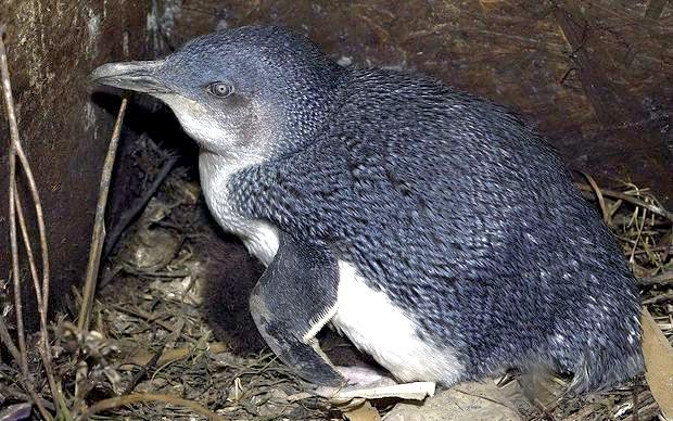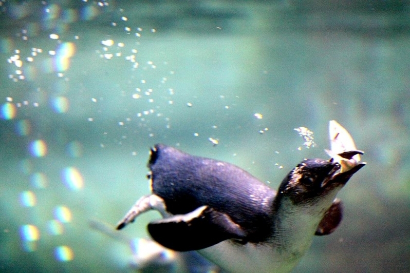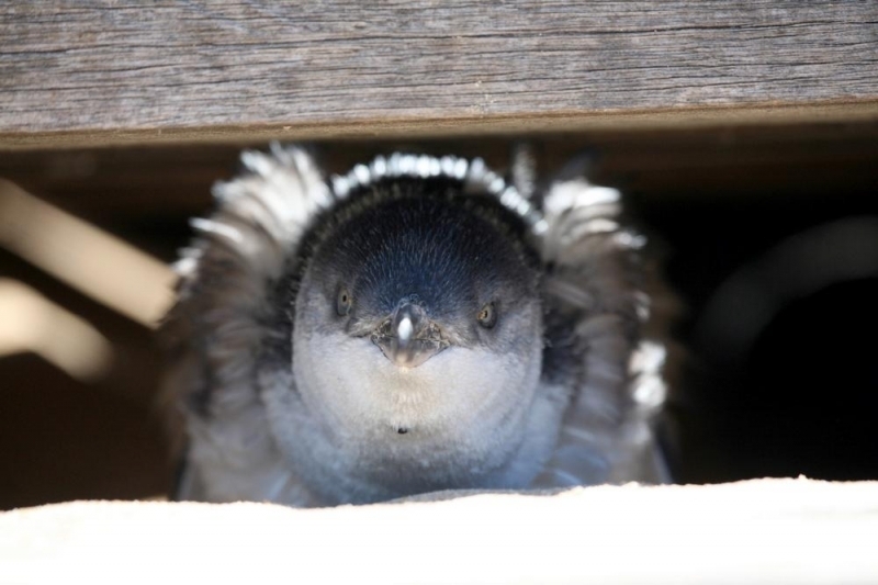 Some breeding sites have been found near urban areas where Blue Penguins have nested under buildings and other man-made structures. This species tends to return to the same breeding site year after year and juveniles often return to their birth site to breed when they reach sexual maturity. Blue Penguins feed on small fishes including anchovies, crustaceans & squid diving to average depths of 10-20 meters for an average of 24 seconds, although dives as deep as 60 meters have been recorded. They tend to remain within 25 kilometers of the coast when foraging, however longer trips up to 75 kilometers have been recorded. The Blue Penguin can reach swim speeds of up to 6 kph. They reach sexual maturity between the ages of 2-3. In New Zealand, eggs are laid between September and November. Typically 2 eggs are laid and incubated for about 36 days by both parents. Once hatched, parents alternate guarding & feeding the chicks for the first 2-3 weeks, then both parents leave the chicks to forage as more food is required to support their rapid growth. Chicks reach their adult weight of 1 kilogram in about a month and typically fledged about a month later.