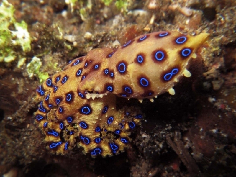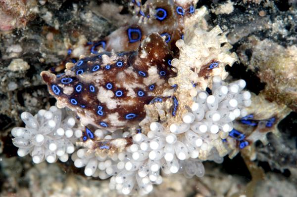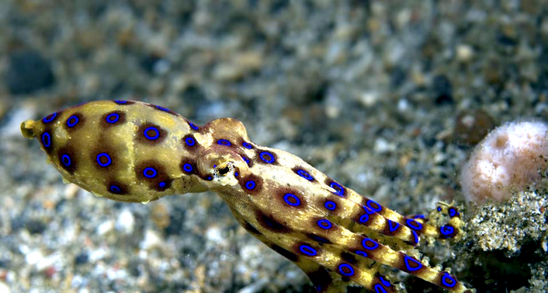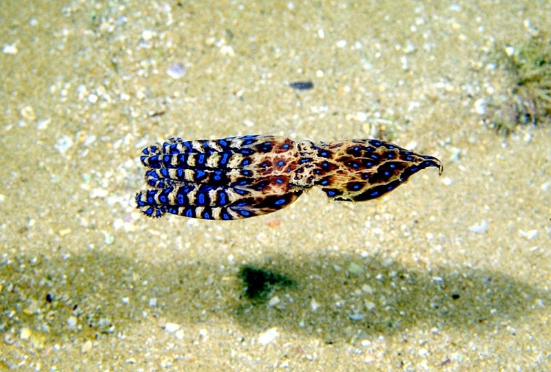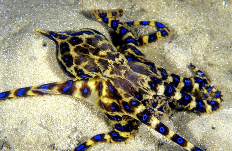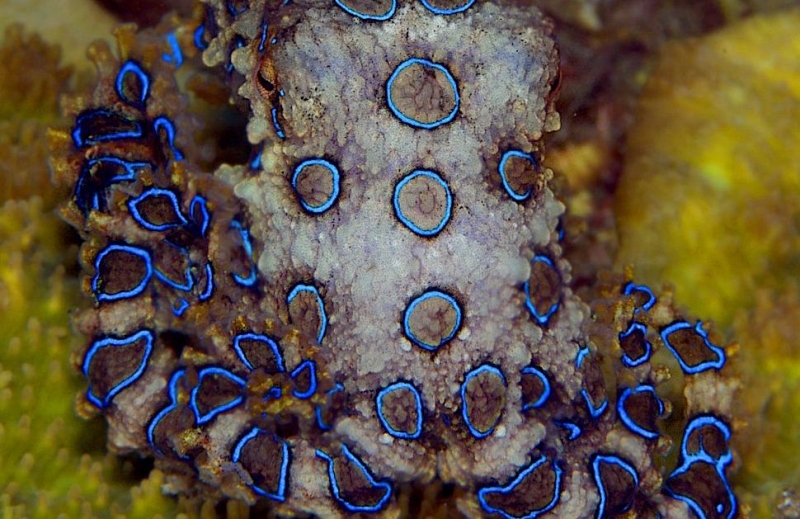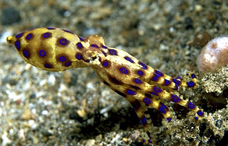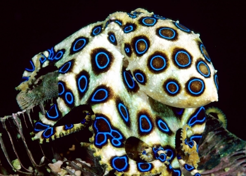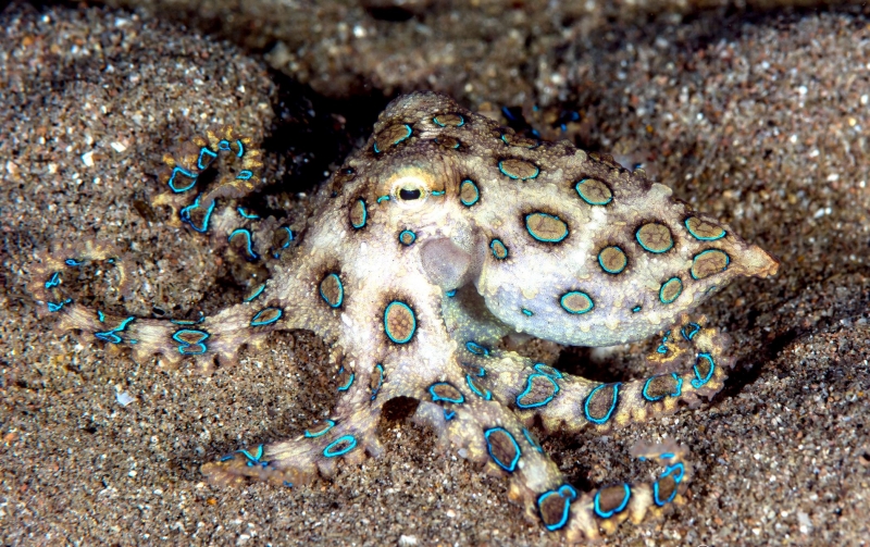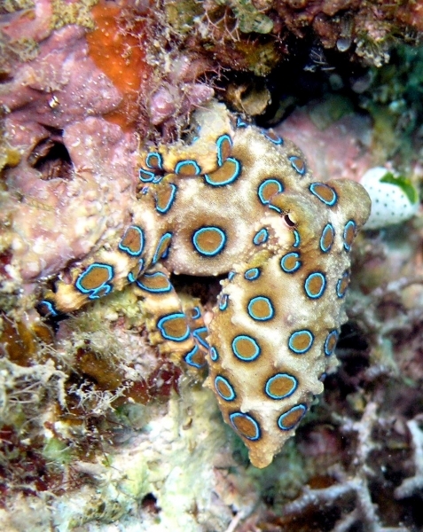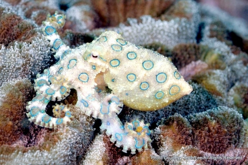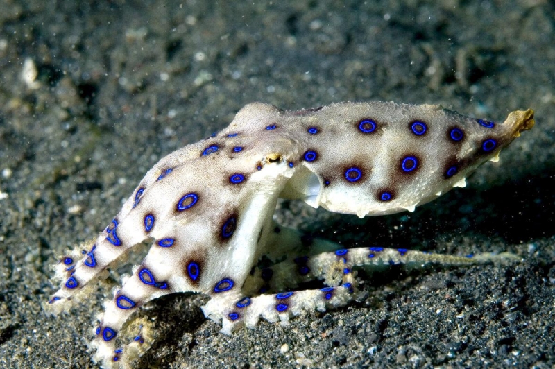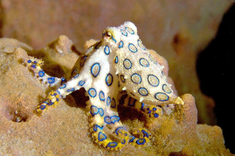 The tiny Blue-ringed Octopus which ironically for their size, are the most deadly of all cephalopods. The common name comes from the bright-blue rings that appear when they are alarmed. The name Octopus came from the Greek okto (eight) and pous (foot). The Blue-ringed Octopus have small bodies 5 centimeters long and arms to 7 centimeters across the tentacles from tip to tip. Their surfaces are often covered with numerous papillae (a small projecting body part similar to a nipple in form), giving it a rough texture. Large iridescent blue rings hence their name, cover the dorsal (upper) surfaces of their mantle and web and extend out their arms. Rings on their mantle are up to 8 millimeters in diameter and number fewer than 25. There is a characteristic short, horizontal iridescent blue line that runs through their eyes. When at rest, faint, thin blue rings are usually visible. While resting, the Blue-ringed Octopus is a pale brown to yellow color depending on its surroundings. When alarmed, the octopus displays bright blue rings all over its body and carries enough venom to kill 26 adult humans within minutes. Blue-ringed Octopuses can be found only in the temperate waters of southern Australia, from southern Western Australia to eastern Victoria at depths ranging from 0-50 meters. They can be found in shallow reefs & tide pools from northern Australia to Japan, including Papua New Guinea, Solomon Islands, Philippines & Indonesia and as far west as Sri Lanka at depths ranging from 0-20 meters.