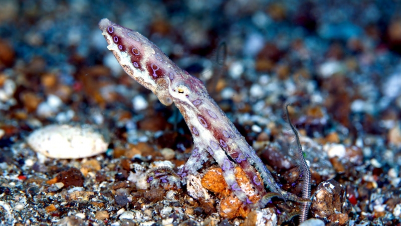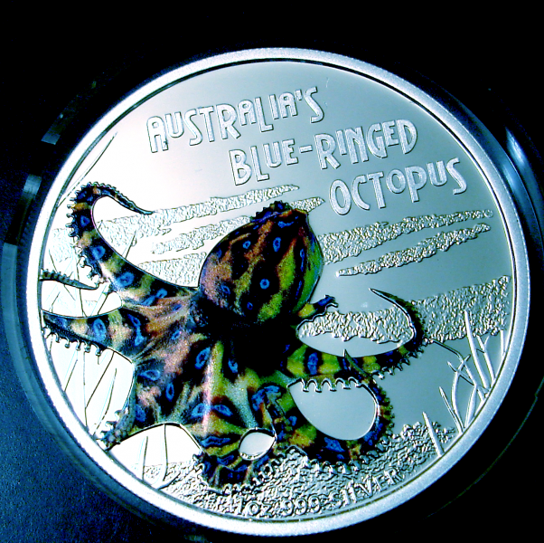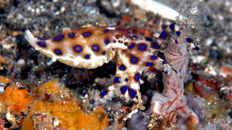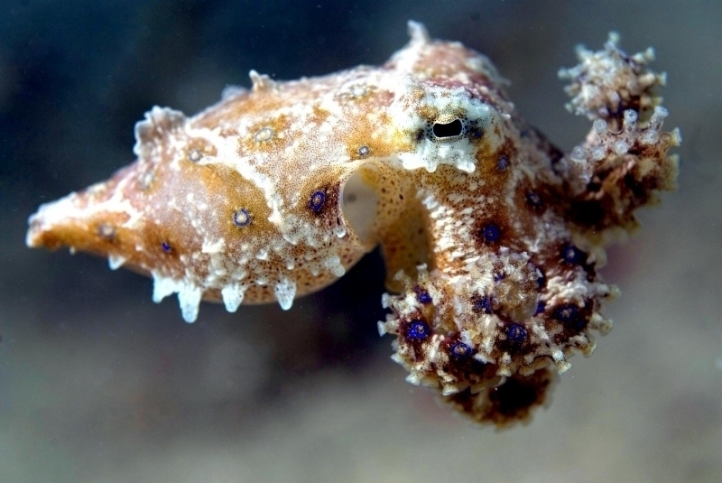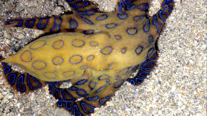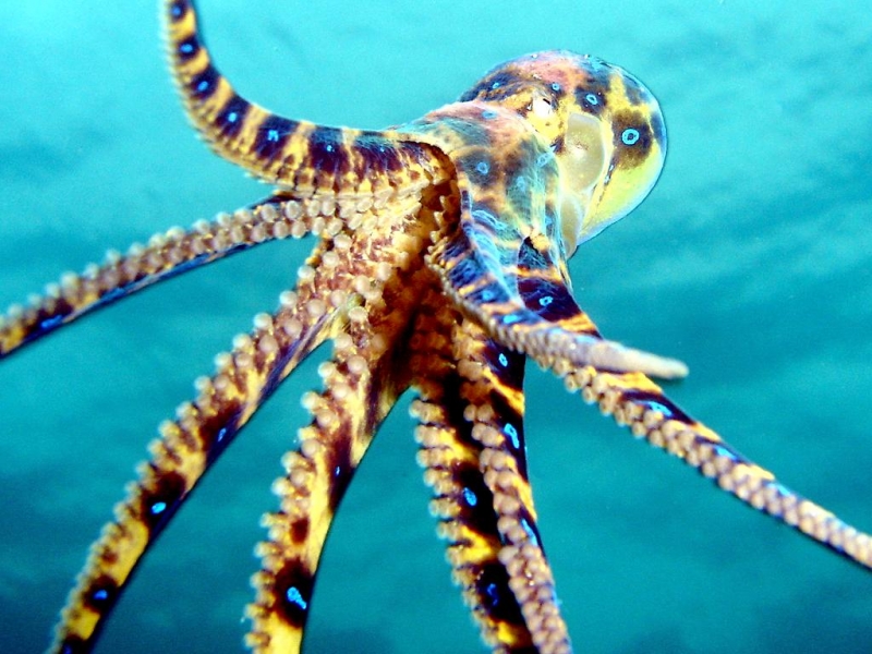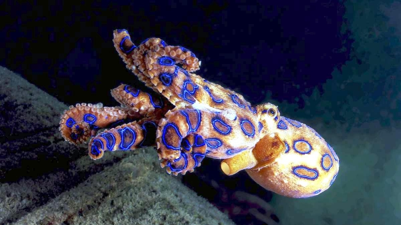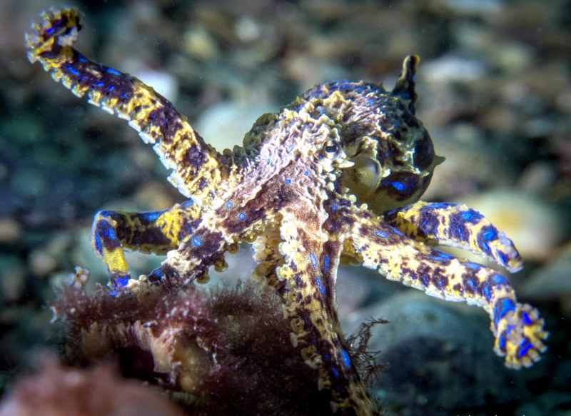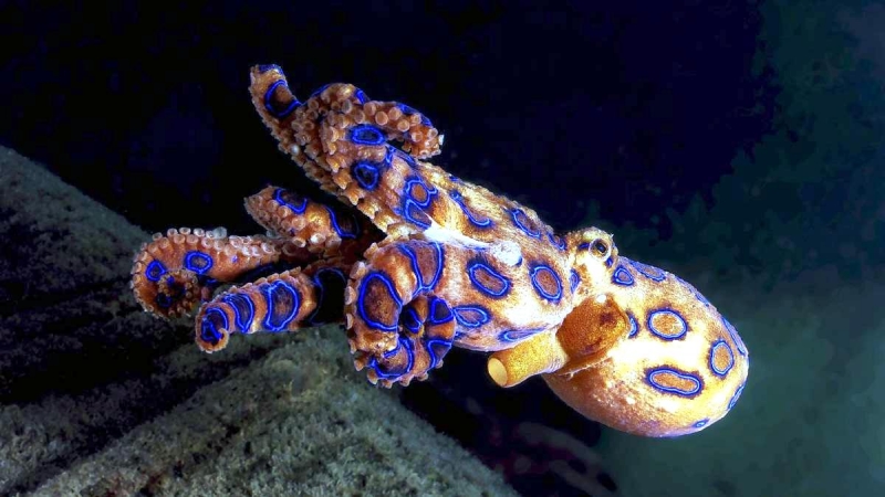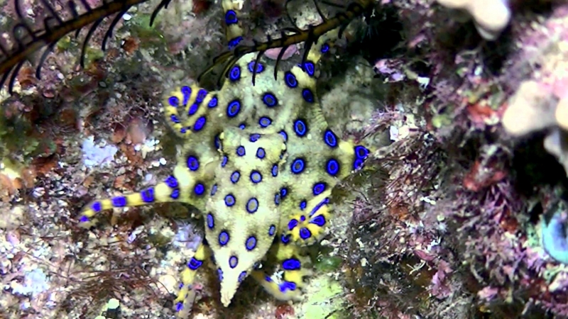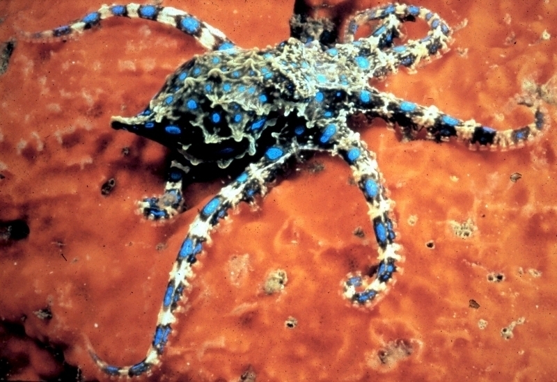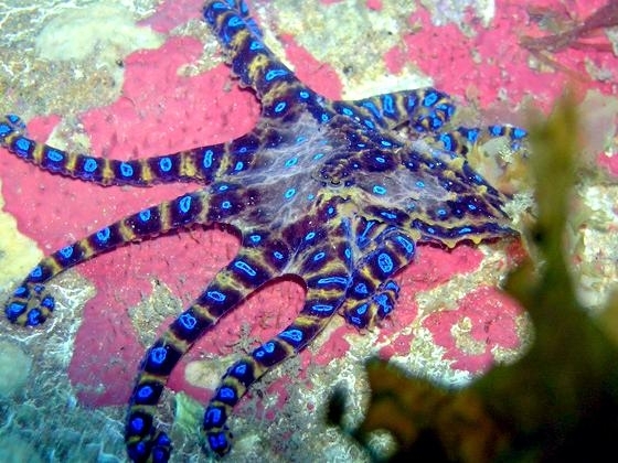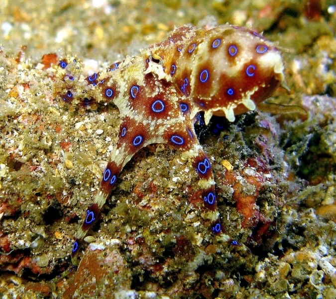 The tiny Blue-ringed Octopus which ironically for their size, are the most deadly of all cephalopods. The common name comes from the bright-blue rings that appear when they are alarmed. The name Octopus came from the Greek okto (eight) and pous (foot). The Blue-ringed Octopus have small bodies 5 centimeters long and arms to 7 centimeters across the tentacles from tip to tip. Their surfaces are often covered with numerous papillae (a small projecting body part similar to a nipple in form), giving it a rough texture. Large iridescent blue rings hence their name, cover the dorsal (upper) surfaces of their mantle and web and extend out their arms. Rings on their mantle are up to 8 millimeters in diameter and number fewer than 25. There is a characteristic short, horizontal iridescent blue line that runs through their eyes. When at rest, faint, thin blue rings are usually visible. While resting, the Blue-ringed Octopus is a pale brown to yellow color depending on its surroundings. When alarmed, the octopus displays bright blue rings all over its body and carries enough venom to kill 26 adult humans within minutes. Blue-ringed Octopuses can be found only in the temperate waters of southern Australia, from southern Western Australia to eastern Victoria at depths ranging from 0-50 meters. They can be found in shallow reefs & tide pools from northern Australia to Japan, including Papua New Guinea, Solomon Islands, Philippines & Indonesia and as far west as Sri Lanka at depths ranging from 0-20 meters.