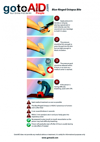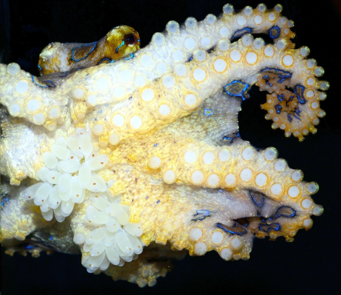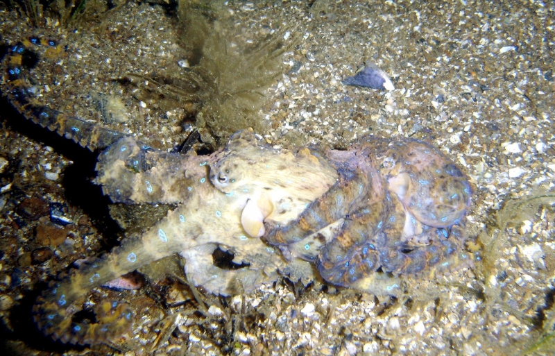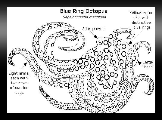 Blue-ringed Octopuses feed on small crabs, hermit crabs & shrimp that it hunts during the day. There are 2 types of venom secreted by 2 separate venom glands which are used against prey & predators. One of the venoms is used for hunting crab, the other which is extremely toxic, is used as self-defense against predators. The venoms are secreted into the Blue-ringed Octopus’s saliva, but the mechanism for poisoning its victim is not well understood. Either the venom is expelled in the saliva into the water or the octopus bites its prey or predator. Once the prey is dead, the Blue-ringed Octopus begins consuming it with its powerful beak-like mouth. The mating ritual for Blue-ringed Octopus begins when a male approaches a female and begins to caress her with his modified arm, the hectocotylus. Males then climb on the females back, at times completely engulfing the female’s mantle obstructing her vision. The hectocotylus is inserted under the mantle of the female and spermatophores are released into the female’s oviduct. The female then lays between 50-100 eggs and guards them by carrying them under her tentacle until they hatch about 50 days later into plank-tonic paralarvae. The female then dies as she is unable to eat while she guards her eggs. The Blue-ringed Octopus is about the size of a pea when hatched, then grows to reach the size of a golf ball as an adult. Both sexes mature quickly and begin mating the following autumn. The male dies after mating. All octopuses along with squids & cuttlefishes have a short lifespan of about 2 years.