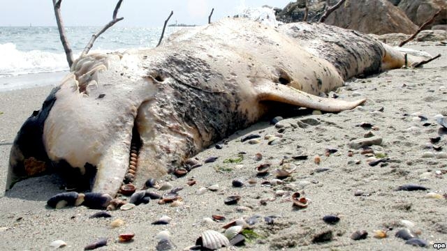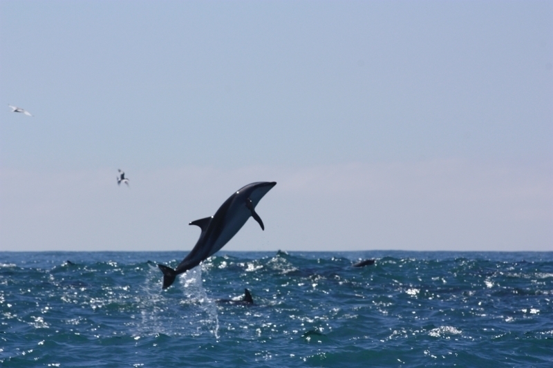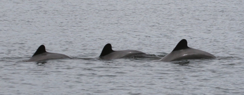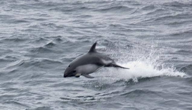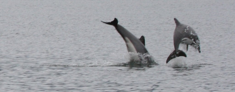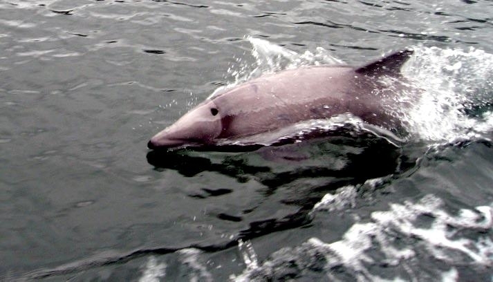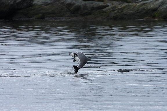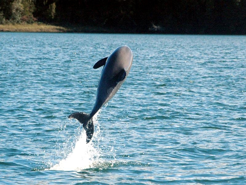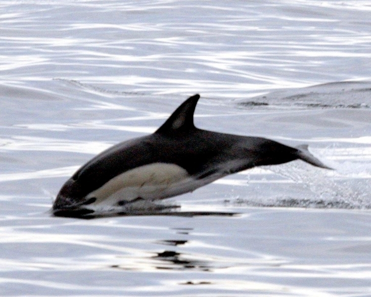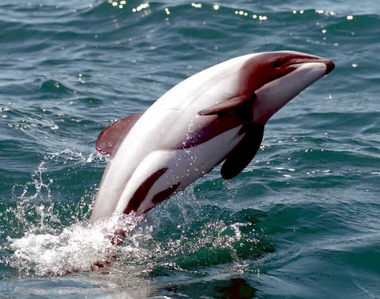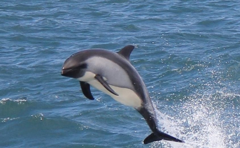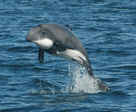 Chilean Dolphins also known as Black Dolphins, are small cetaceans with a stocky body shape and blunt beak-less heads. They measure about 1.7 meters long on average and reach 60 kilograms in weight. They have rounded flippers and a large rounded dorsal fin. Chilean Dolphins are gray in color with lighter coloring on the ventral side. They have white markings on the lips, throat, forehead and behind each flipper. A darker gray band covers the throat across the body. Chilean Dolphins are found in the shallow, coastal waters of South America from Valparaiso, Chile (33°S), south to Isla Navarino, Beagle Channel and Cape Horn, Argentina. It is thought that this is a gregarious species as they are commonly found in small pods from 2-10 as well as large pods of 20-50 in the northern part of the range. There are reports of larger pods, including a remarkable 15 mile-long pod of Chilean Dolphins near the shoreline at 39°22’S from a 1996 field research report.