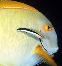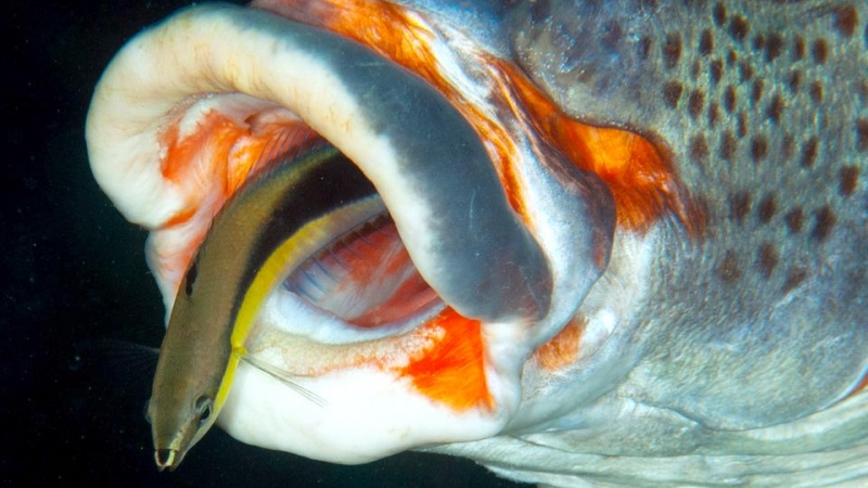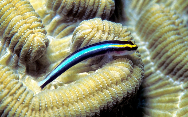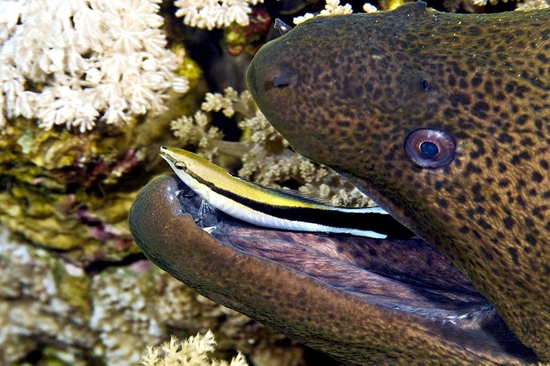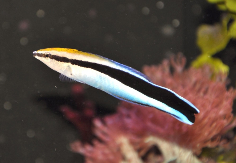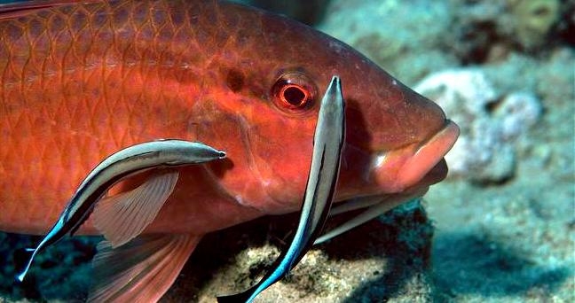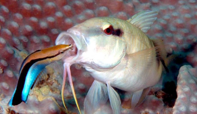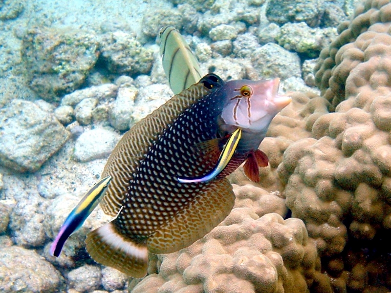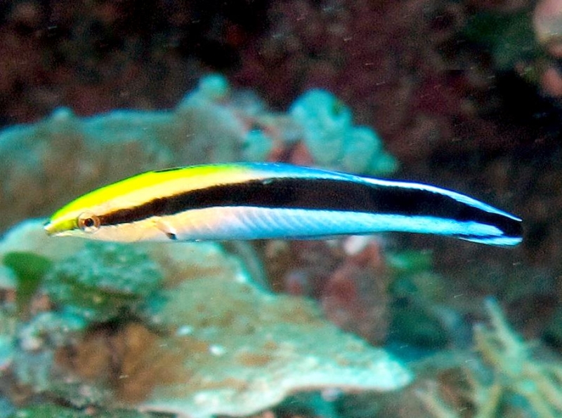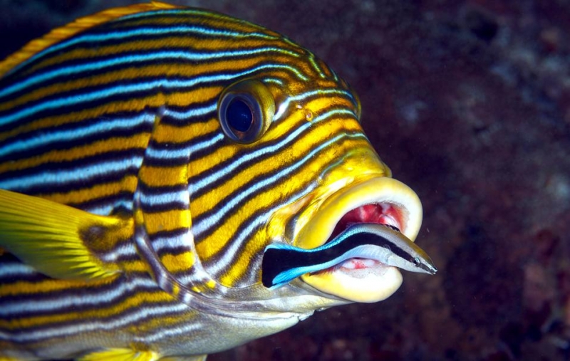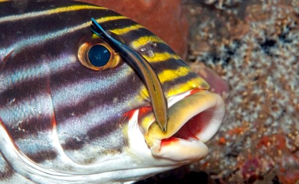 The Cleaner Wrasse is a typically small species of fish found in the coastal waters of the world’s major oceans. The word “wrasse” comes from the Cornish word wragh, meaning an old woman or hag via the Cornish dialect wrath. The Cleaner Wrasse is often seen alongside other marine animals including sharks and in a natural “cleaning station” where various marinelife come to be cleaned. This situation is very similar to a “drive-through” car wash. There are more than 500 different species of Cleaner Wrasse found in the shallower coastal waters & coral reefs of the Pacific, Indian and Atlantic oceans. Cleaner Wrasse most commonly inhabit areas that have an abundance of both food and places to hide, making coral reefs and rocky shores the perfect home. Cleaner Wrasse are the most well-known wrasse species as they are often seen going into the mouths of large marine animals in order remove the dead material inside. Cleaner Wrasse feed on dead tissues, scales & parasites that lurk inside the mouth of the larger animal and few are actually eaten by the predator that they are assisting. The Cleaner Wrasse comes in a variety of colors and sizes depending on the species.