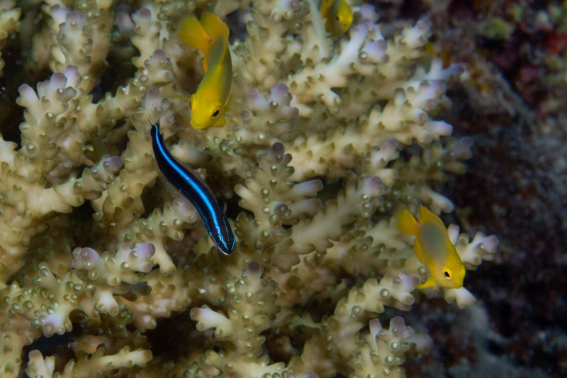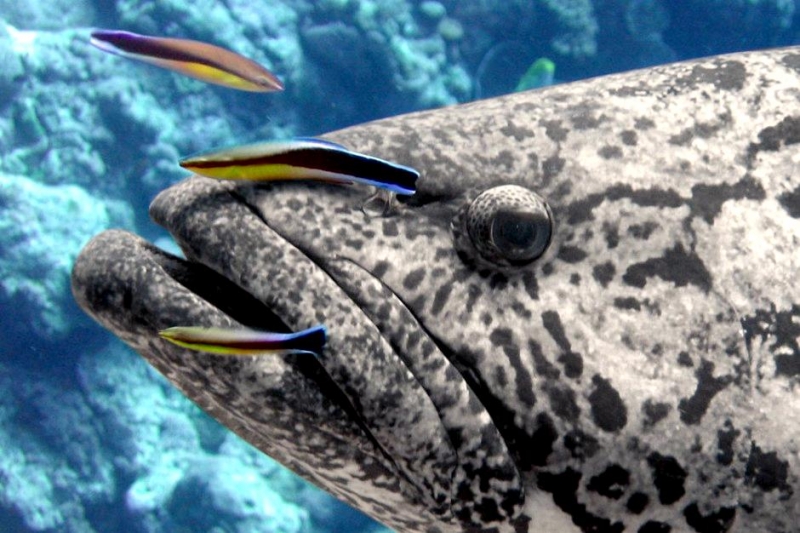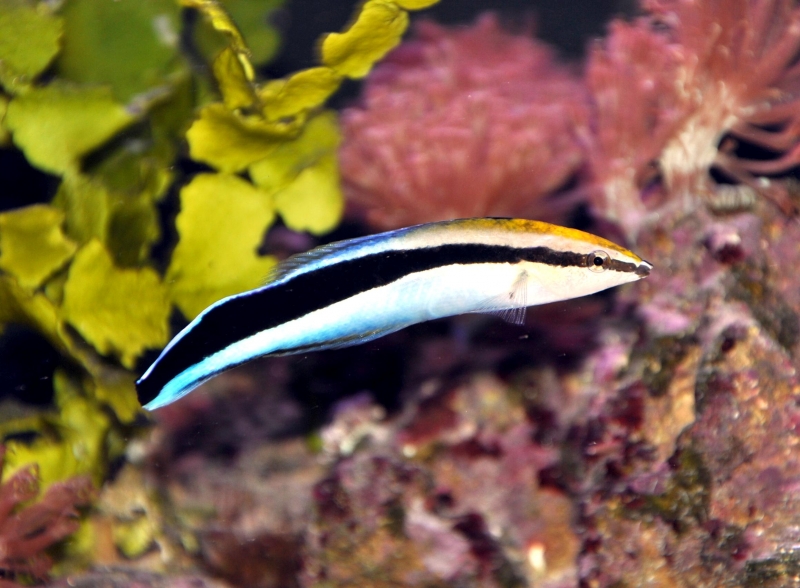Cleaner Wrasse tend to be relatively small in size, with many species being less than 20 centimeters in length. One species of Cleaner Wrasse however is enormous in comparison, growing to more than 2 meters long. Cleaner Wrasse are carnivorous animals that have thick lips with a row of teeth that usually face outwards. The mouth of the Cleaner Wrasse is protractile which means that it is capable of extending forwards. They feed on a number of small invertebrates, small fish and food particles in the water. Cleaner Wrasse are also known to follow large predatory fish, eating the trail of left-overs that it leaves behind it. Due to their small size, Cleaner Wrasse have numerous predators in their natural environment including larger fish as well some smaller species of shark. Cleaner Wrasse are known to live for a relatively long-time particularly for their small size. Cleaner Wrasse mate by releasing their eggs & sperm in to the water, which are fertilized and become part of the plankton until they are big enough to join the reef. Females lay thousands of eggs at at time, so the Cleaner Wrasse population numbers are relatively high.