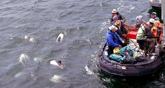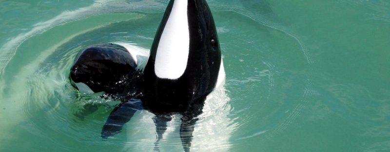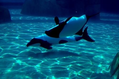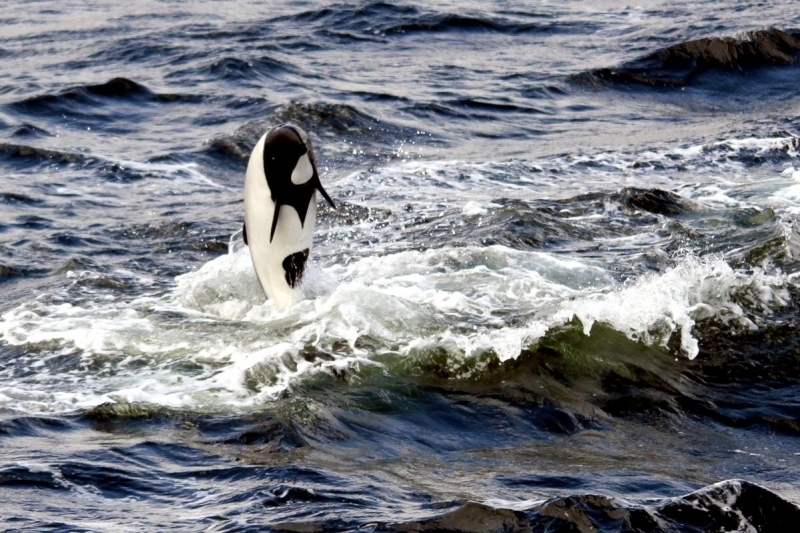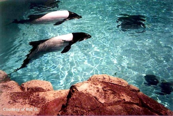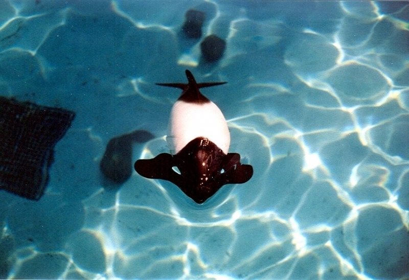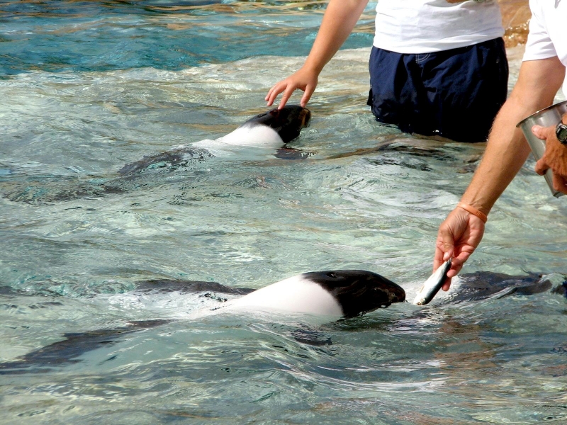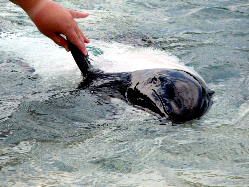 Commerson’s Dolphins are found in cold inshore waters near open coasts, sheltered fjords, bays, harbors, river mouths and are occasionally found in rivers. Within the Strait of Magellan, Commerson’s Dolphins seem to prefer areas with strong current that reaches or exceeds 15 kph (9.3 mph). Off South America, Commerson’s Dolphins appear to prefer areas where the continental shelf is wide and flat; the tidal range is great and temperatures are influenced by the cool Malvinas Current. Water temperatures in areas frequented by these dolphins range from 4°C-16 °C (South America) and 1°C-8 °C (Kerguélen). Around the Falkland/Malvinas and Kerguélen Islands as well as off mainland Argentina, Commerson’s Dolphins are often seen swimming in or at the edge of kelp beds. Sightings are common around the Golfe du Morbihan where the Commerson’s Dolphin inhabit open waters, kelp-ringed coastlines and protected areas between islets. They appear to be opportunistic feeders consuming fish, squid and shrimp. Stomach contents of Commerson’s Dolphins taken as by-catch in South America included at least 25 food items: mysid shrimp (22.5% of total diet), three species of small fish (20.4%), squid (14.1%), 17 species of other invertebrates, four species of algae and miscellaneous plant remains. Studies of the Kerguélen population have shown feeding mainly on 15-24 centimeters semipelagic chaennichthyid fish and to a lesser extent on coastal benthic, pelagic crustaceans (amphipods, hyperiids and euphausiids), benthic crustaceans and in one individual, numerous annelid tubes and asciadians were also found. They feed primarily near the sea bed. Commerson’s Dolphins normal breeding season is in the spring & summer, which runs from September to February with little else is yet known about their reproductive habits.