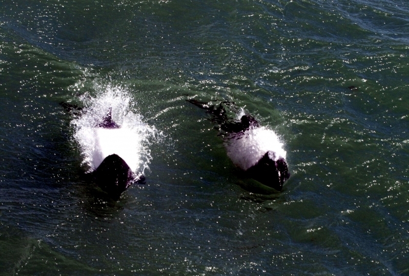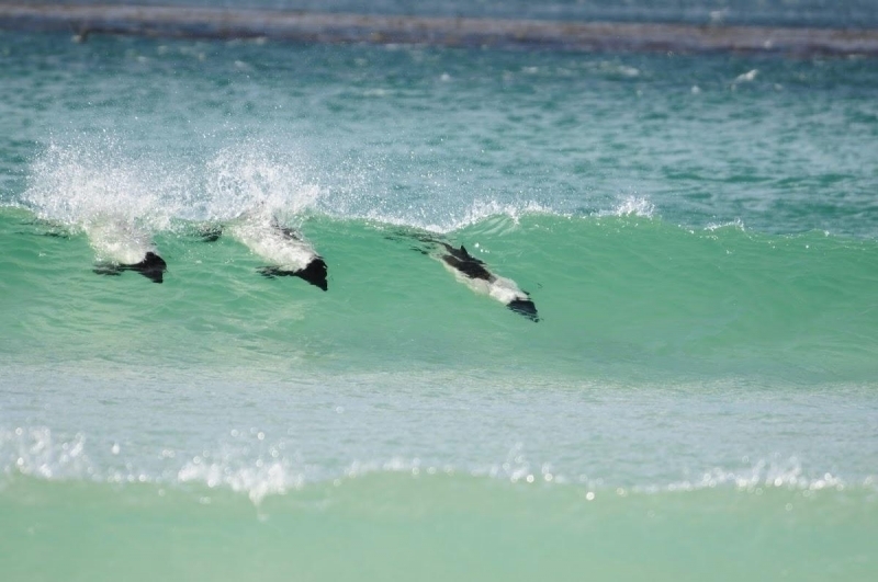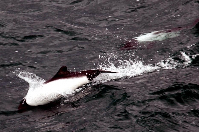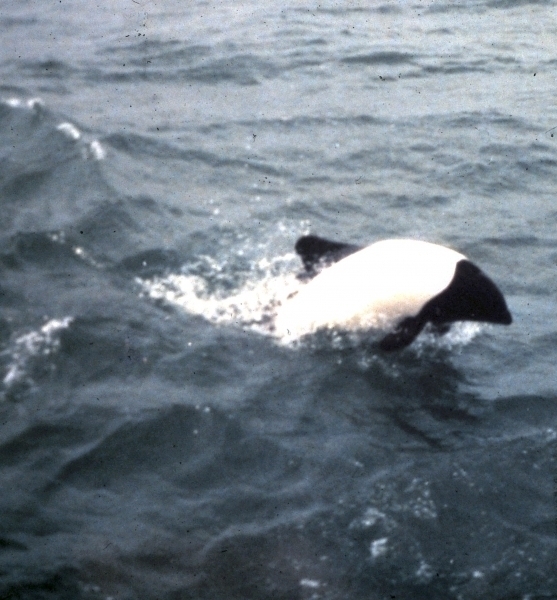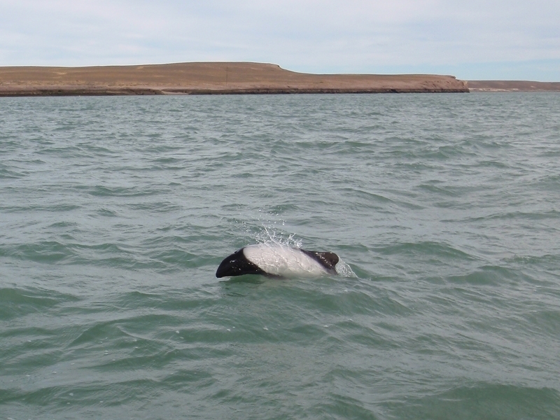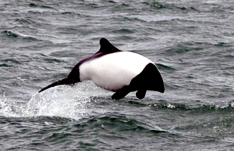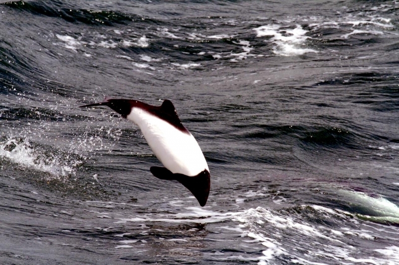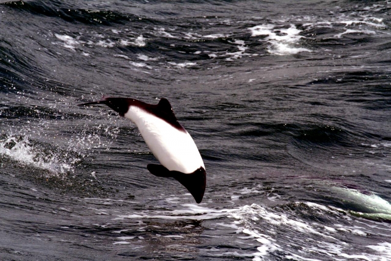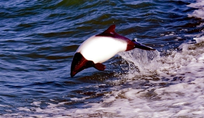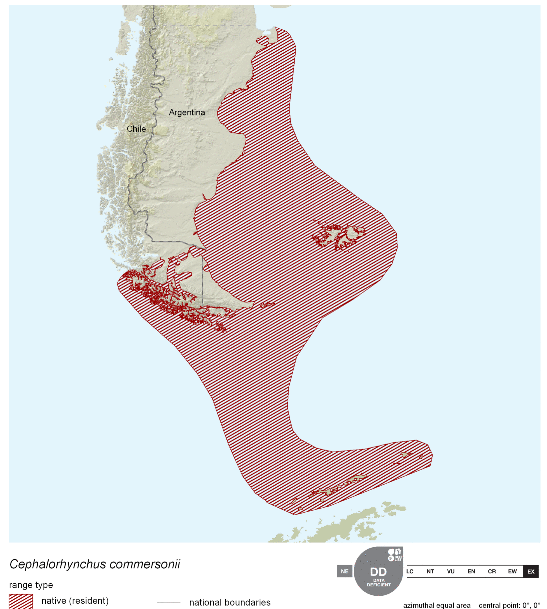 Commerson’s Dolphins are frequently mistaken for porpoises because they lack of beaks and have small heads. They have small stocky bodies with rounded, paddle-like flippers. Juveniles are gray-black and lighten into their adult white coloring of the anterior body and black head. The dorsal area from the fin back is also black with a black patch on the lighter ventral side. The dolphin is named for Dr. Philibert Commerson who was a French naturalist and first described the species in 1767 after he sighted them in the Strait of Magellan. Commerson’s Dolphins range in size from 1.2-1.7 meters and can reach up to 86 kilograms. These dolphins tend to be found in small pods of 2-7 although aggregations of 100 or more have been observed. Like other dolphin species, they are quick and agile and enjoy leaping & riding bow waves. They have also been observed swimming upside down. Commerson’s Dolphins range from the tip of South America, through the Strait of Magellan, around the Falkland Islands and the Kerguélen Islands. Little is known about the migratory patterns of these dolphins, however fishermen report that they disappear from their common areas during the winter. They may follow fish that migrate offshore in winter. The Commerson’s Dolphin population in the Strait of Magellan decreases in late autumn. The South American and Kerguélen populations are 2 distinct populations separated by 130° of longitude or 8,500 kilometers. In the Kerguélen population, the majority of Commerson’s Dolphins migrate out of the Golfe du Morbihan between June-December. The northernmost limit of the South America population is documented on the Brazilian coast between 31-32°S. Range extends south into Drake Passage (61°50’S) as far as the South Shetland Islands. On the west coast of South America, specimens have been reported from Isla Chiloé, Chile.