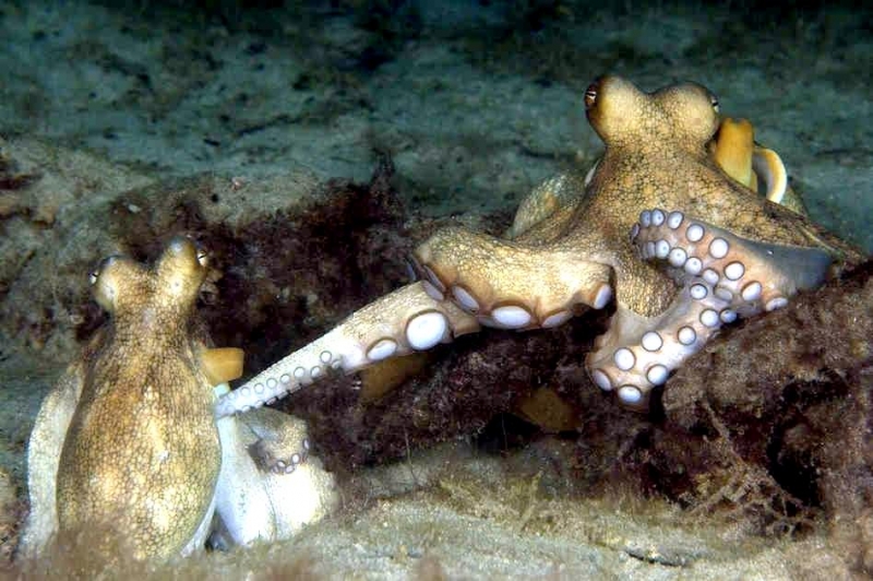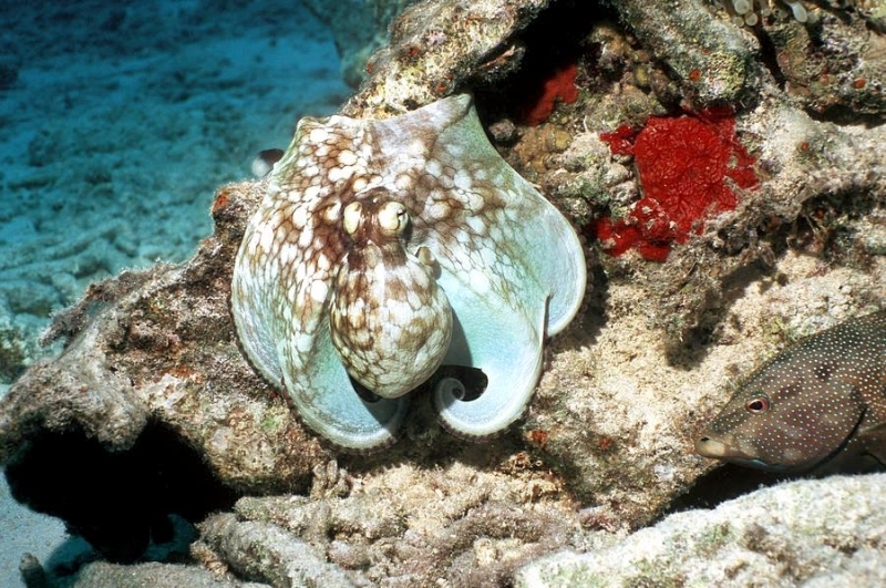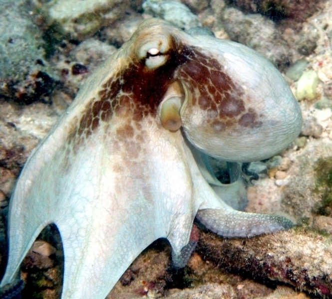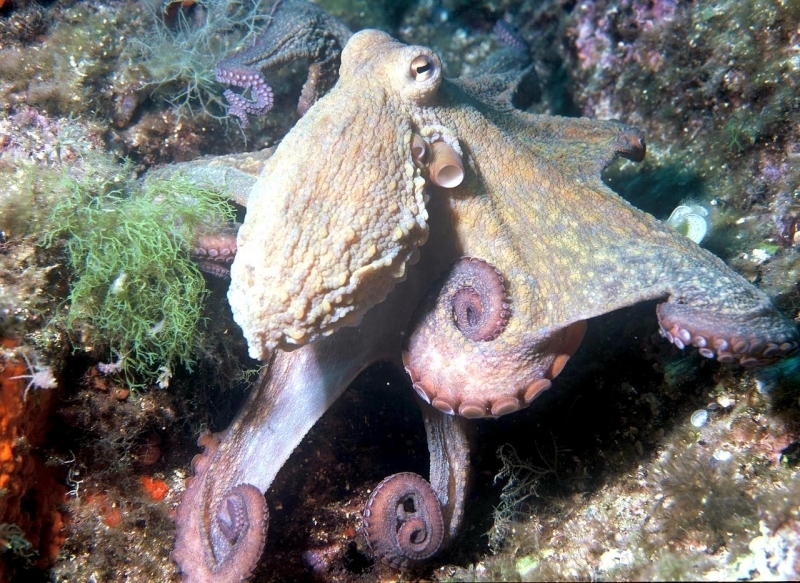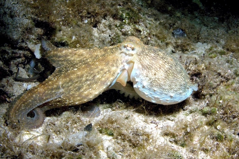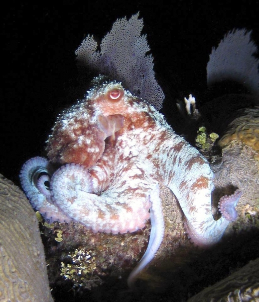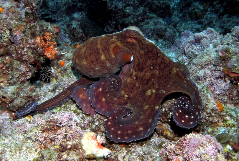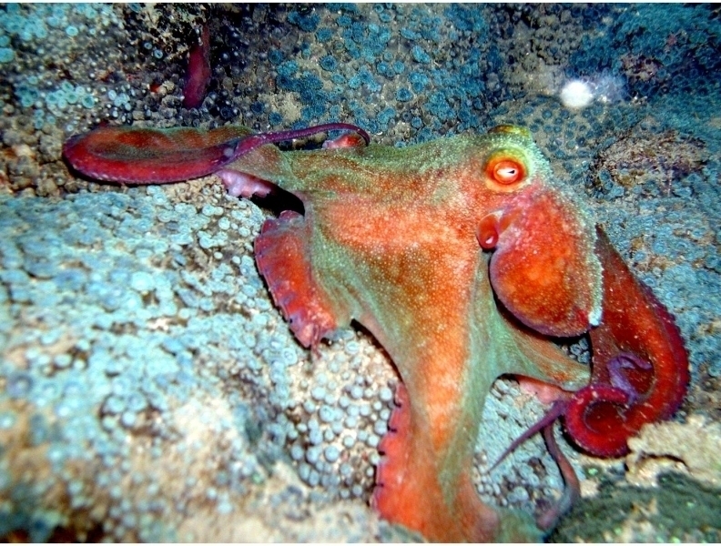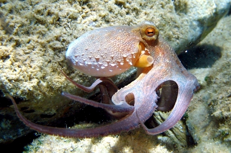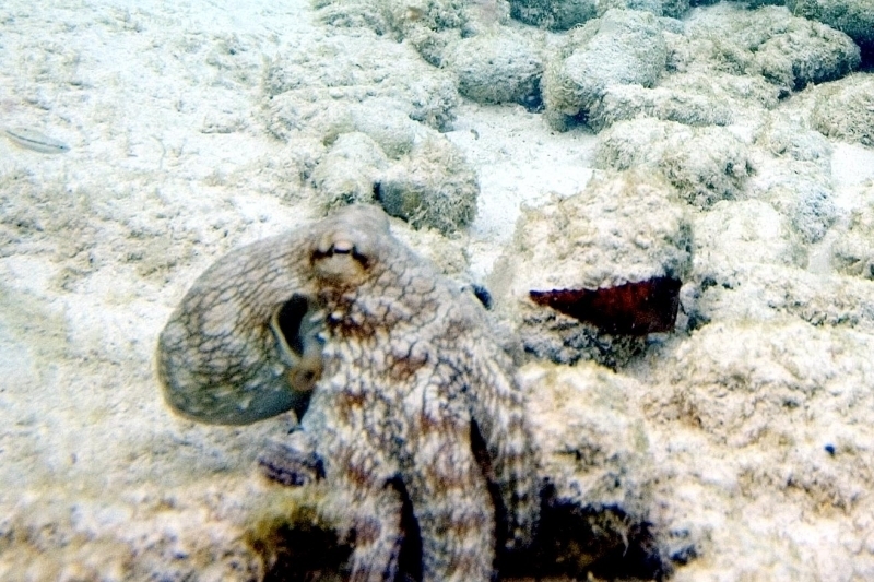 Common Octopus are perfectly adapted to live in very different habitats. They are experts at camouflaging themselves by changing their color, skin texture and posture. When they feel threatened, it usually changes its body color and tries to escape while releasing ink. This purple-black cloud confuses the enemy and may give the Common Octopus enough time to jet away to safety. The ink is toxic in high concentrations. In early spring, adults move closer to the shore for spawning. Common Octopus have separate sexes and fertilization is internal. A male and a female can mate with each other several times, but they may also mate with other individuals. Within 2 months after mating, the female releases up to 500,000 eggs. They are laid in shallow water and are always attached to a substrate. Crevices between rocks & coral reefs provide suitable shelter. On sandy or muddy bottom, eggs are laid in empty shells or in man-made objects such as cans, bottles or tires. The female Common Octopus cares for the eggs by gently cleaning them with her suckers and provides them with oxygen by squirting them with streams of water. She also defends them from predators until they hatch. The time that it takes for the embryo to develop, depends on the temperature & size of the egg. Soon after the eggs have hatched, the female dies. The tiny hatchlings are carried about in water currents where they feed from plankton. After about a month, they settle to the bottom where only 1 to 3 out of 200,000 hatchlings survive to adult stage. They have the most complex brain of all the invertebrates. Just like vertebrates, the Common Octopus have long-term & short-term memories. They learn to solve problems by trial-and-error and experience. Once they have solved a problem, they remember and can easily solve it. Its eyesight is comparable to that of a human. Focusing is done by moving the lens in & out, rather than by changing its shape as the human eye does but the Common Octopus does not rely solely on its eyes to investigate its surroundings. They also have an acute sense of touch in the suckers. A blind Common Octopus can tell the difference between different objects just as well as a seeing one.