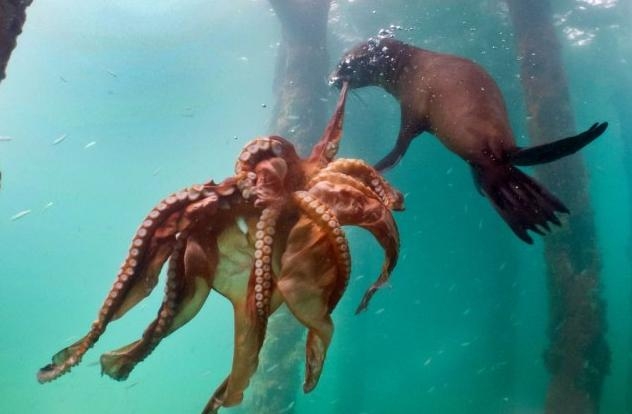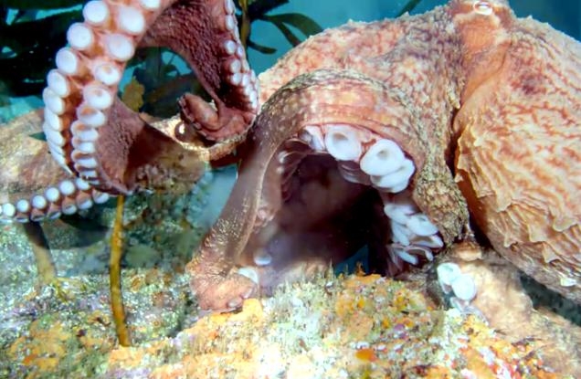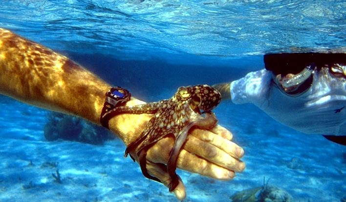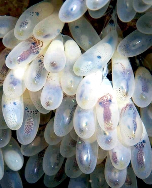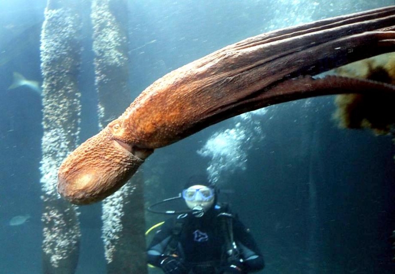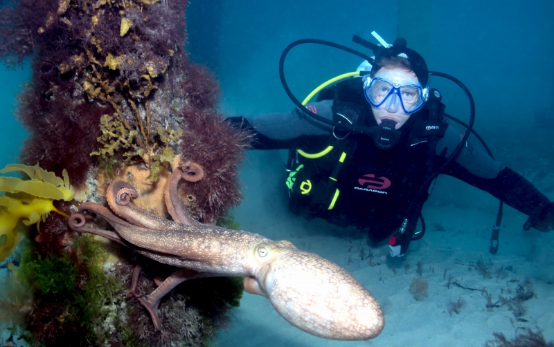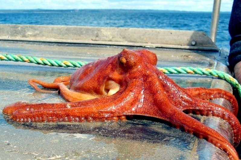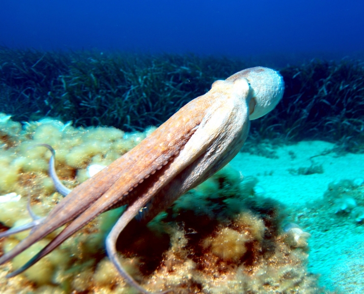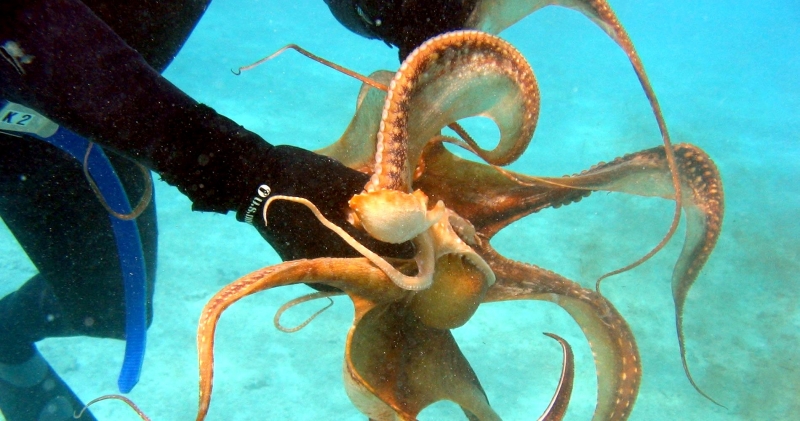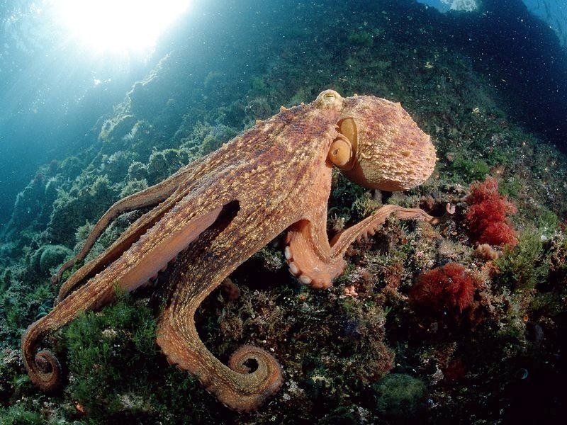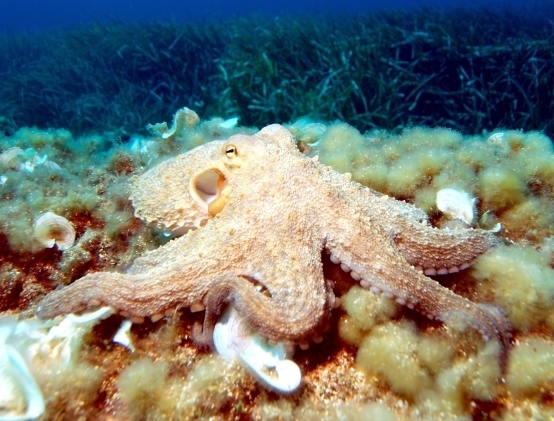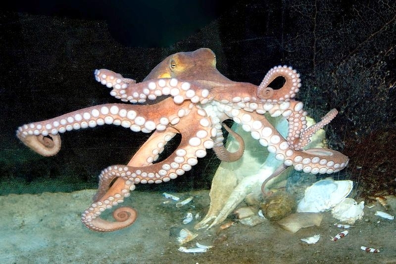 Common Octopus are perfectly adapted to live in very different habitats. They are experts at camouflaging themselves by changing their color, skin texture and posture. When they feel threatened, it usually changes its body color and tries to escape while releasing ink. This purple-black cloud confuses the enemy and may give the Common Octopus enough time to jet away to safety. The ink is toxic in high concentrations. In early spring, adults move closer to the shore for spawning. Common Octopus have separate sexes and fertilization is internal. A male and a female can mate with each other several times, but they may also mate with other individuals. Within 2 months after mating, the female releases up to 500,000 eggs. They are laid in shallow water and are always attached to a substrate. Crevices between rocks & coral reefs provide suitable shelter. On sandy or muddy bottom, eggs are laid in empty shells or in man-made objects such as cans, bottles or tires. The female Common Octopus cares for the eggs by gently cleaning them with her suckers and provides them with oxygen by squirting them with streams of water. She also defends them from predators until they hatch. The time that it takes for the embryo to develop, depends on the temperature & size of the egg. Soon after the eggs have hatched, the female dies. The tiny hatchlings are carried about in water currents where they feed from plankton. After about a month, they settle to the bottom where only 1 to 3 out of 200,000 hatchlings survive to adult stage. They have the most complex brain of all the invertebrates. Just like vertebrates, the Common Octopus have long-term & short-term memories. They learn to solve problems by trial-and-error and experience. Once they have solved a problem, they remember and can easily solve it. Its eyesight is comparable to that of a human. Focusing is done by moving the lens in & out, rather than by changing its shape as the human eye does but the Common Octopus does not rely solely on its eyes to investigate its surroundings. They also have an acute sense of touch in the suckers. A blind Common Octopus can tell the difference between different objects just as well as a seeing one.
