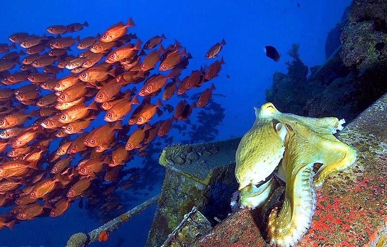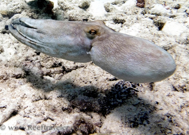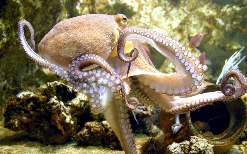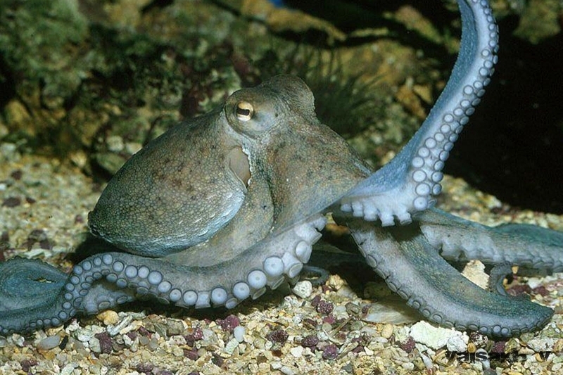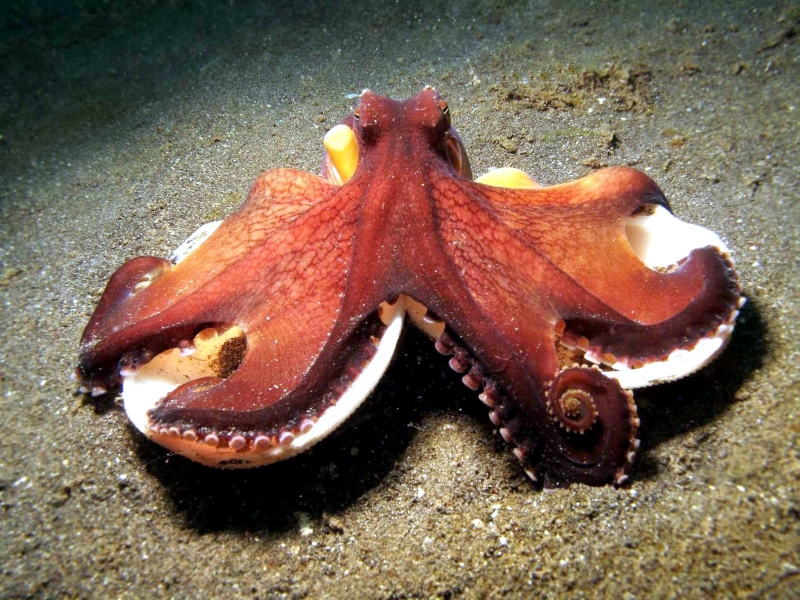 The Common Octopus reaches 24–36 inches in length. The name Octopus came from the Greek okto (eight) and pous (foot). The arms are lined with suckers. The skin is smooth and has special pigment cells that make it possible for the octopus to blend in with the surroundings. These pigment cells have 3 bags filled with different colors which are adjusted until the background is matched. Coloration reflects the Common Octopus mood. White is for fear, red is for anger and brown is the usual color. Their closest relatives are the Chambered Nautilus, Cuttlefish and Squids. The Common Octopus is an active nocturnal predator that feeds mainly on crustaceans, fish and bivalves. They leave their dens at dusk to go for hunting trips and return at dawn. It happens that they search for food during the day, but those trips are of much shorter duration. New research have found that the Common Octopus actually stockpile food. On dives, researchers discovered piles of living bivalves around the burrows where the Common Octopus lives. They can then pick them up and bring them to their shelter whenever they are hungry. The Common Octopus is found world-wide in tropical, subtropical & temperate waters. It prefers coastal waters and can live both in the shallows and down to a depth of 500 feet. As tiny hatchlings, the Common Octopus becomes food for many other species of animals. There are also fisheries, which land 20,000 to 100,000 tons yearly. They are caught using “Octopus Pots”, plastic traps that the animal mistakes for a safe shelter. The Common Octopus is normally solitary & territorial. It finds a home in a cavity or digs a burrow for itself and leaves it only to feed or reproduce. They often protect and hide their homes with shells, stones and other solid things that they gather.