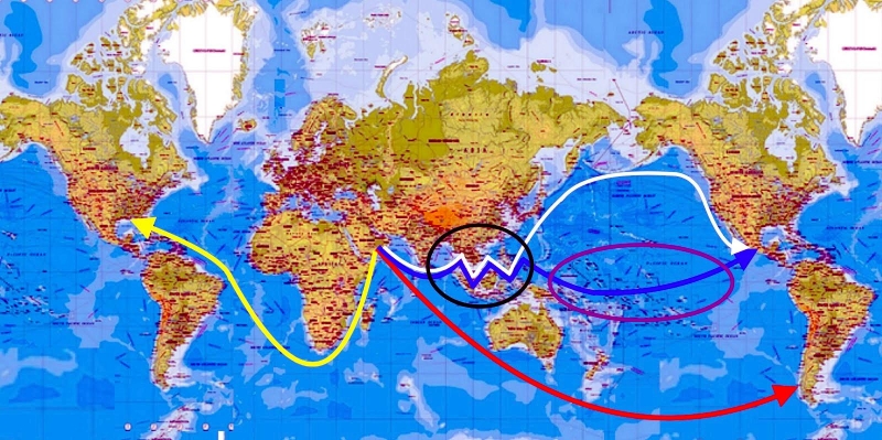 The subtropical gyres are surrounded by four linked currents: two boundary currents oriented roughly north-south at their eastern and western edges and two east-west currents at the northern and southern extent of the gyre. The placement of the Earth’s landmasses and the rotation of the planet cause the boundary currents to be narrowest and deepest on the western edge of the subtropical gyres. Western boundary currents are also among the fastest non-tidal ocean currents on Earth, reaching speeds of more than 5 mph (2.5 meters per second) and containing as much as 100 times the combined flow of the world’s rivers. These currents include the Gulf Stream in the North Atlantic, the Kuroshio in the North Pacific and the Agulhas in the Indian Ocean. As these warm western boundary currents slow and spread out, they turn east to form the most pole-ward currents of their associated gyre. In the north, they also act as the southern boundary of the sub-polar gyres, permitting the exchange of water between the subtropics and the Arctic. In the south, the Antarctic Circumpolar Current connects to the southern subtropical gyres through these currents in a similar way. The colder eastern boundary currents, which flow from the high latitudes toward the equator, are the slowest and most diffuse currents around the gyre. As they reach the equator, they turn west and pick up speed driven by the trade winds and heat from the tropical sun.