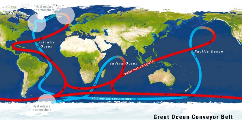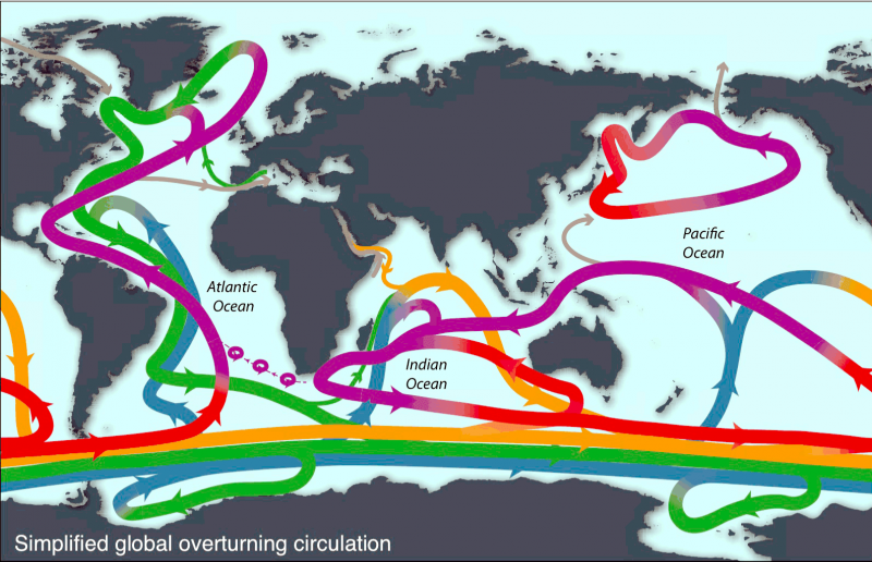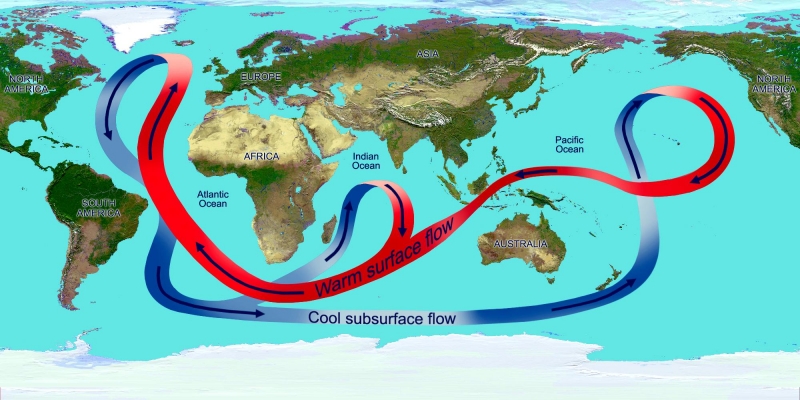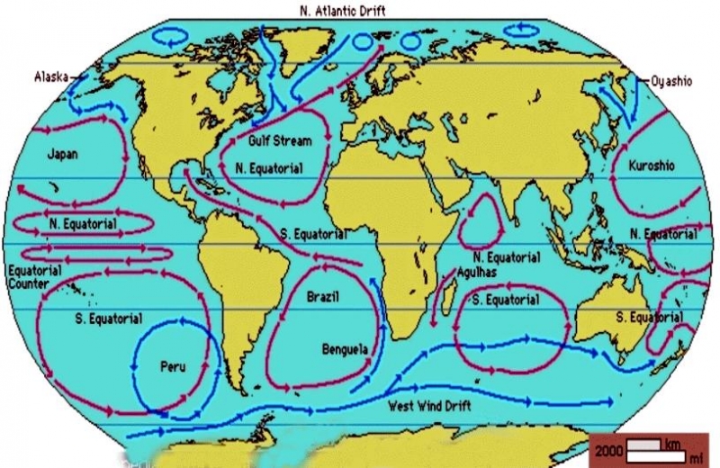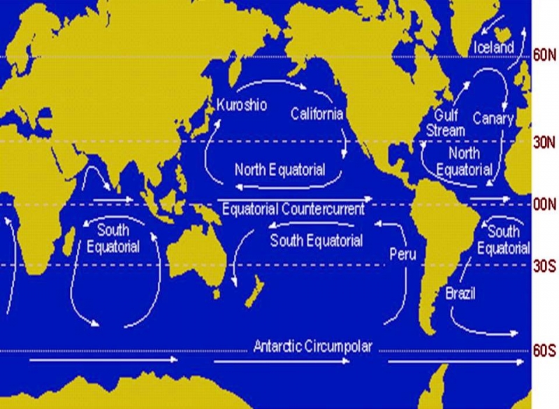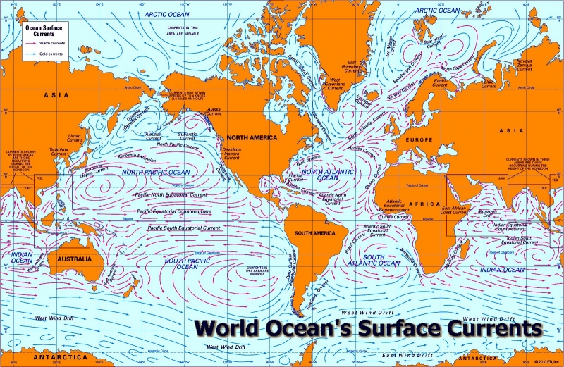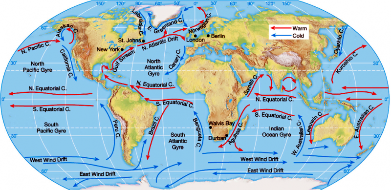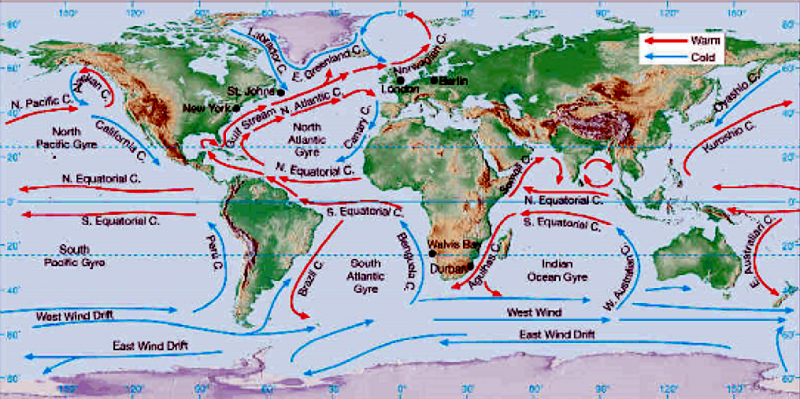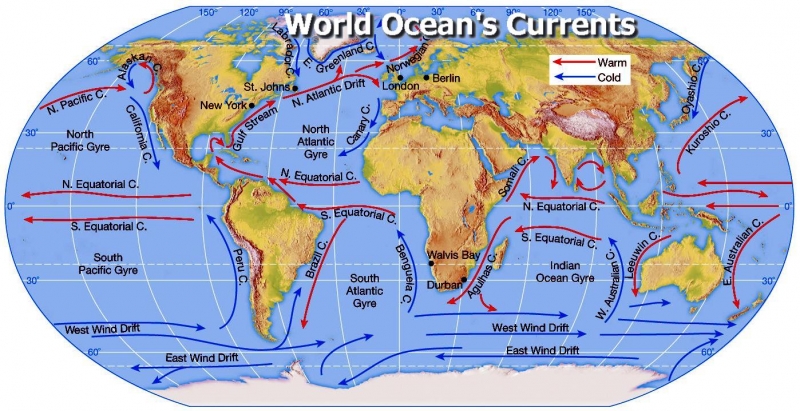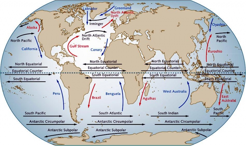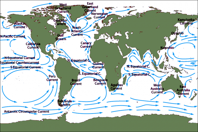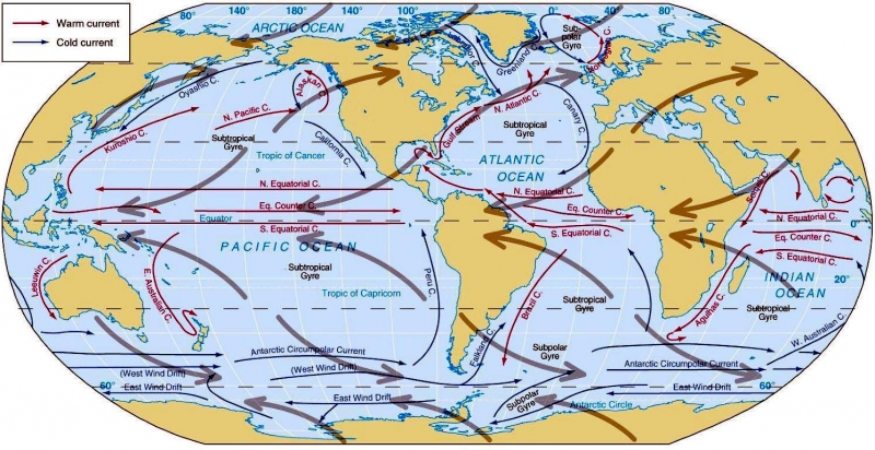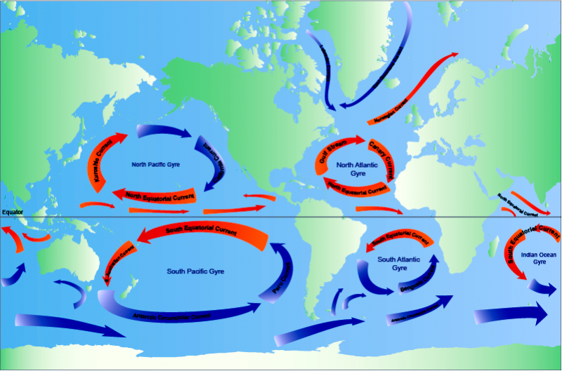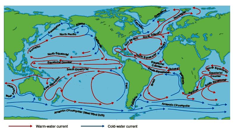 One of the most important roles of ocean currents is in governing Earth’s weather and climate. Western boundary currents such as the Gulf Stream carry large amounts of heat from tropical waters to the north. This flow is part of the thermohaline circulation or ocean conveyor and helps distributes heat around the planet. This in turn governs wind patterns, air temperature and precipitation both locally and globally. Recent studies have shown that western boundary currents have shifted position slightly over the course decades, leading to changes in wind, temperature and precipitation patterns around the globe more commonly associated with El Niño and the other ocean oscillations. One important question marine biologists & oceanographers are trying to answer is how small changes in the placement, temperature, speed and volume of currents might result in large or abrupt changes in Earth’s long-term climate. Identifying the natural and human factors that could change or disrupt the natural function of ocean currents is also an important part of understanding and predicting future climate changes.