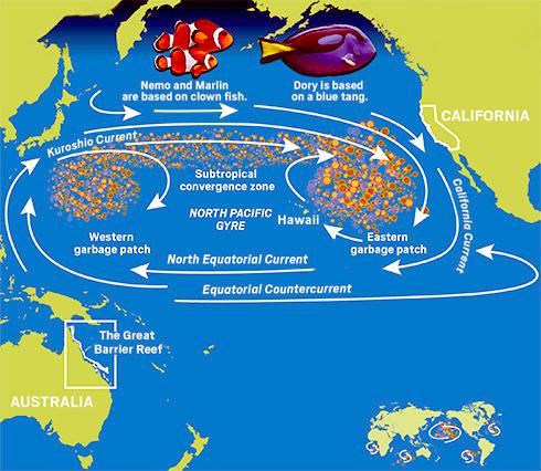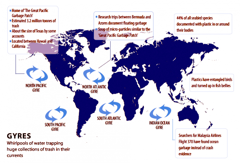 Currents are critical to marinelife. Cold water contains large amounts of the nutrients that feed the base of the food chain. Those places where cold water mixes with warm, nutrient-poor water often contain high levels of biomass (living things) as well as a high degree of biodiversity (different species). Many warm-water animals that favor these boundary zones such as tuna, swordfish and squid are particularly important commercial resources, so understanding how and where ocean waters mix gives fishing fleets the ability to locate schools and minimize their time at sea. It also gives marine biologists information they need to help manage fisheries or protect endangered species. A gyre’s currents also cause floating debris to slowly drift towards the center of the ocean, forming large patches of floating trash. This can be a hazard to marine life and as the chemicals in the plastics enter the food chain, of concern to humans as well.