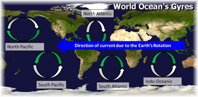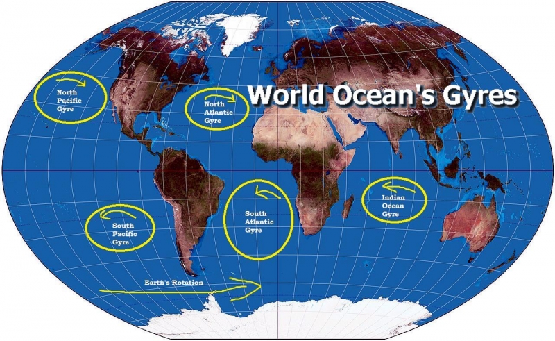 The net wind-driven movement of water known as Ekman transport, creates a bulge in each ocean basin that is as much as 3 feet (1 meter) higher than mean global sea level. The force of gravity pulling on this large mass of water creates a pressure gradient similar to that in an atmospheric high pressure system which in turn leads to a stable, rotating mass of water. Five permanent subtropical gyres can be found in the major ocean basins, two each in the Atlantic & Pacific Oceans and one in the Indian Ocean turning clockwise in the Northern Hemisphere and counterclockwise in the Southern Hemisphere. Smaller counterclockwise gyres centered at around 60 degrees north latitude are created by the prevailing winds around permanent sub-Arctic low-pressure systems. Another sub-polar gyre the only one centered on a landmass, circles Antarctica driven by the near-constant westerly winds that blow over the Southern Ocean unimpeded by land.