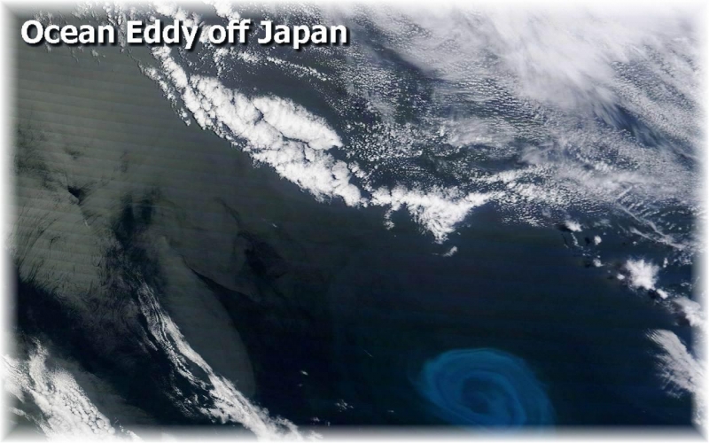 Eddies are relatively small, contained pockets of moving water that break off from the main body of a current and travel independently of their parent. They can form in almost any part of a current, but are especially pronounced in western boundary currents. Once the fast-moving currents leave the confining influence of land, they become unstable and like a fire hose with no one holding it, begin to meander and bend. If a current becomes so tightly bent that it doubles back on itself, that section of flow may “pinch off” and separate from the main body of the current like an oxbow bend in a river. These swirling features can take the shape of warm-core (masses of warm water turning in colder ocean waters) or cold-core (masses of cold water in warm) eddies and can travel for months across hundreds or even thousands of miles of open ocean. Eddies also form in the mid-ocean, far from boundary currents. Their genesis results from an instability process in which large-scale mean flows are constantly breaking down into smaller scale features. The atmosphere behaves in much the same way: energy is put into the system on the planetary scale (it is warm at the equator and cold at the poles), which creates large-scale flow that spawns the storms and fronts we know as weather. In that sense, ocean eddies are analogous to atmospheric weather although their spatial scales are smaller and temporal scales longer because of differences between air and water.