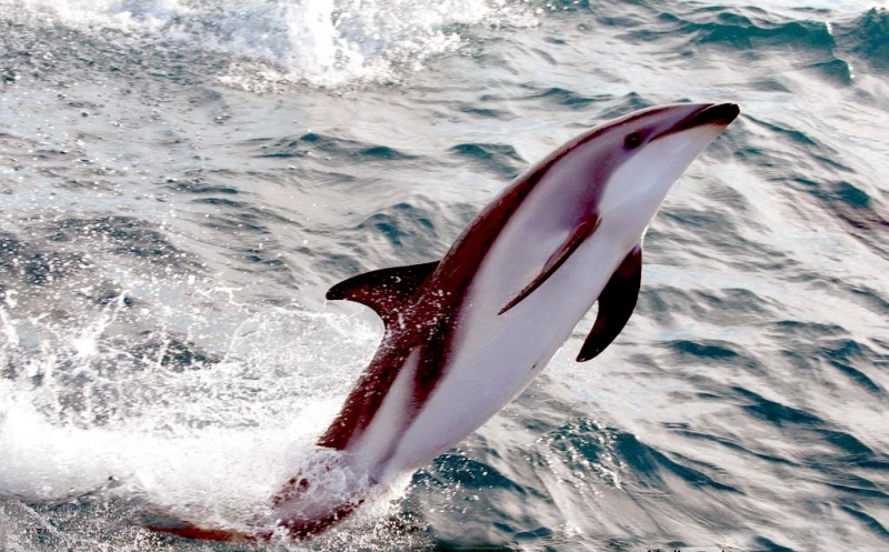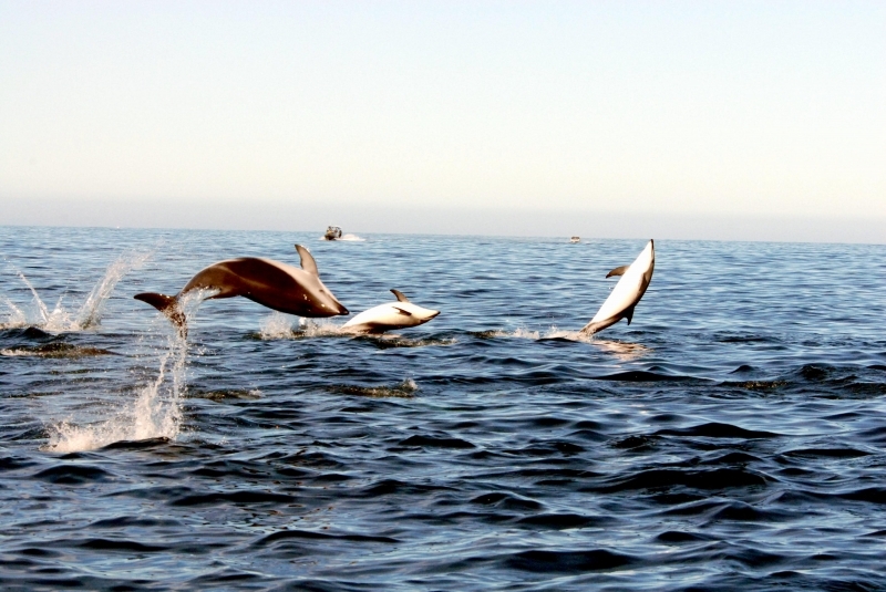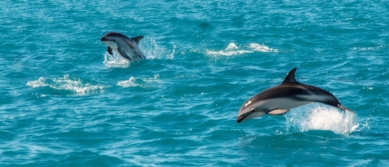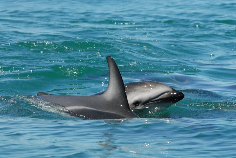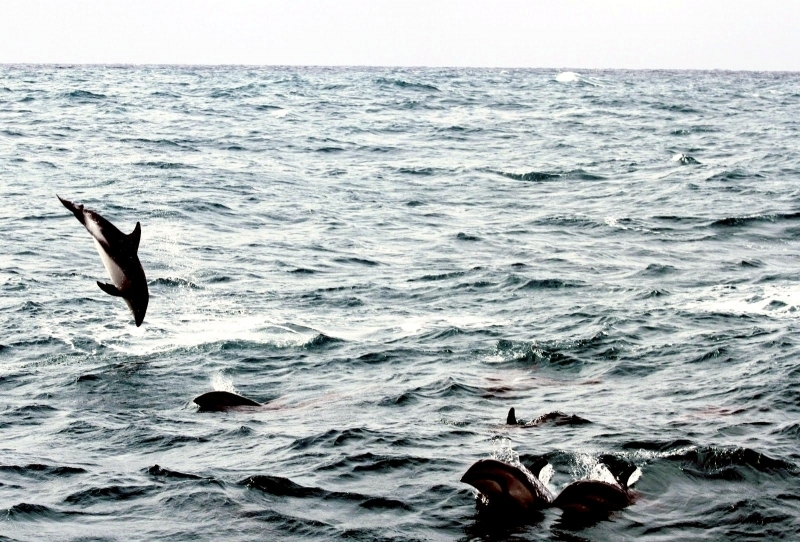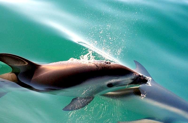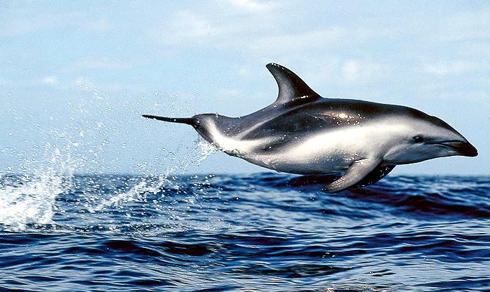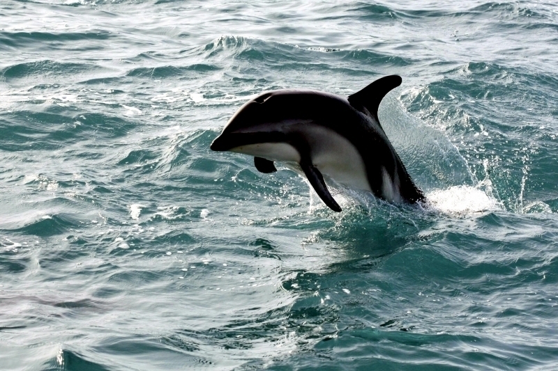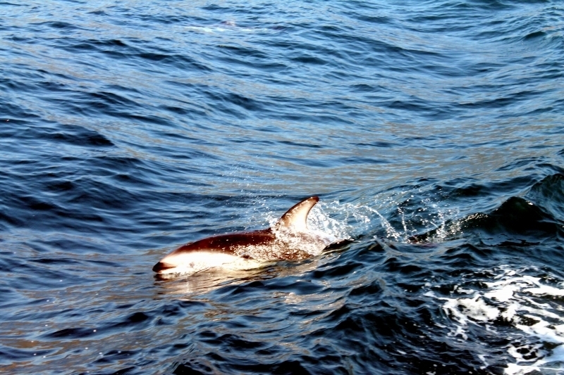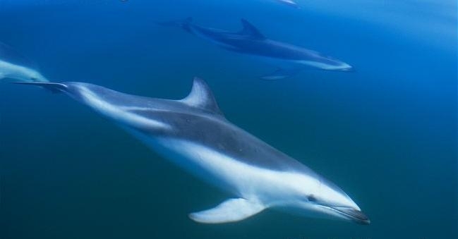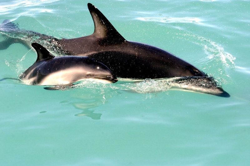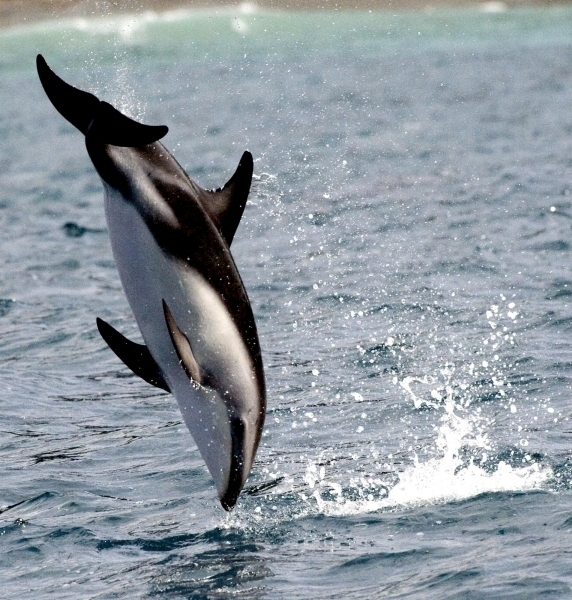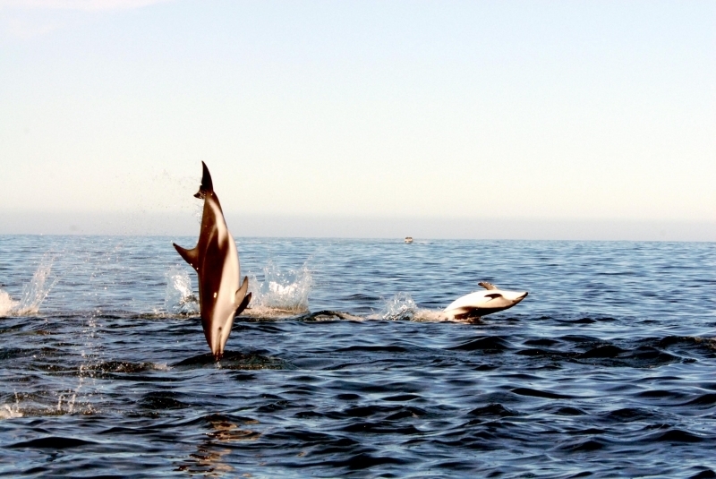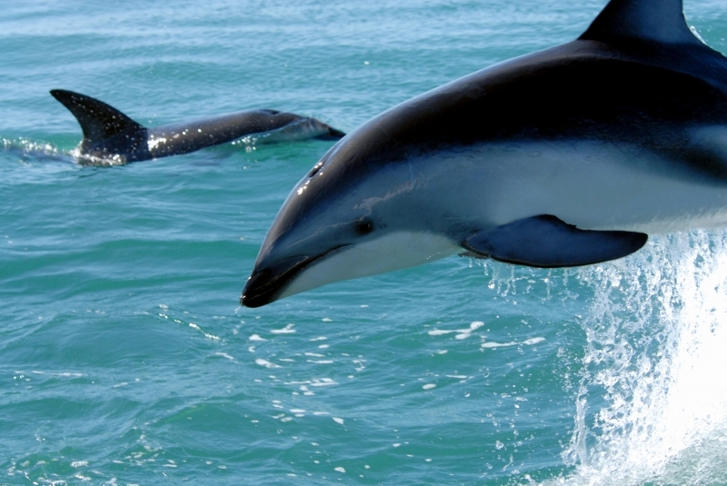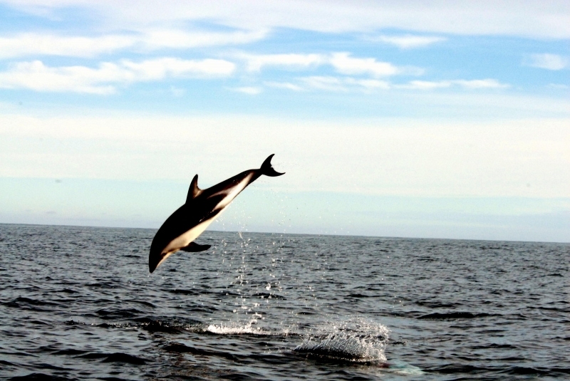 Most calves tend to be born towards the end of the winter and in the early summer months between October & February when the female gives birth to a single offspring after a gestation period that lasts for around 11 months. The calf is fed on the nutritious milk provided by its mother until it is then taught to hunt by her after about a year. Calves tend to remain close their mother until they are around 3 years old when they leave to join a pod of their own (males with often form bachelor groups) and the female is then able to mate again. Dusky Dolphins are thought to be able to first breed when they are between the ages of 4 to 5 and are thought to live for an average of 20 years. The Dusky Dolphin is a carnivorous animal that only feeds on other animals in order to gain the nutrients that it needs to survive. By congregating in large pods, Dusky’s are able to trap vast schools of fish so that they have the best opportunity to feed, by traveling through the waters in a line and pushing the shoal into an area where it is trapped. Prey depends largely on the area in which the Dusky Dolphins are feeding but they most commonly consume anchovies, sardines & mackerel in shallower waters, squid at mid-depths and larger prey including hake & octopus in deeper ocean. Although they have excellent hearing and are able to see remarkably well through the water, it is actually a specially evolved system that these animals use which both helps them to locate prey and to also avoid upcoming obstacles. By producing a rapid series of clicking noises, the Dusky Dolphin’s brain is then able to translate the clicks that bounce off things ahead such as fish, into a mental sound map of the surrounding area and therefore knows exactly where to find food.