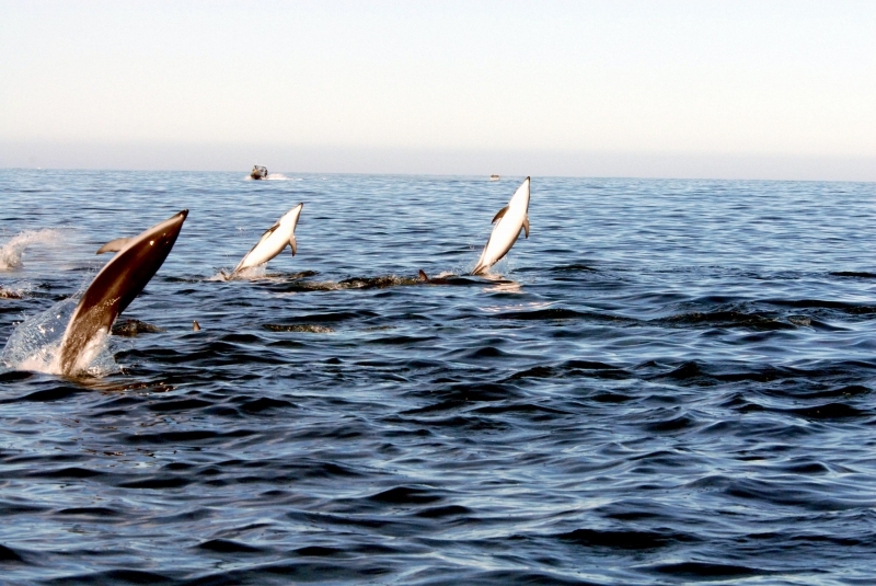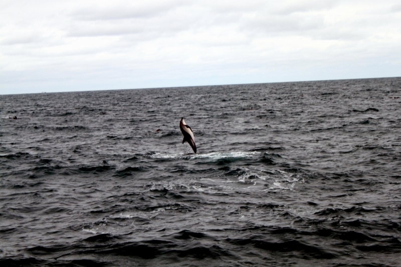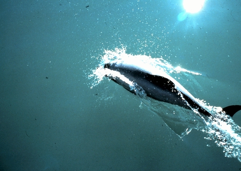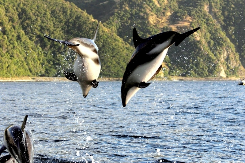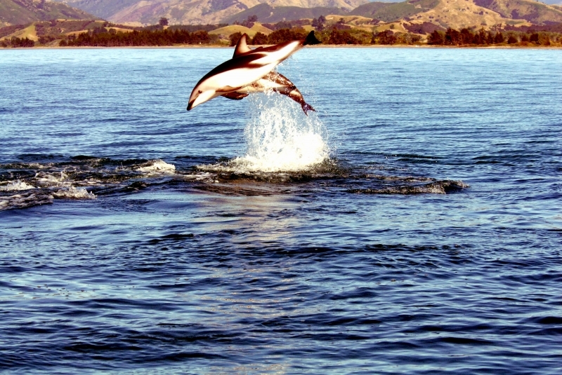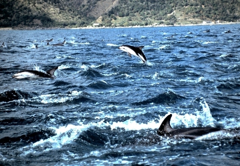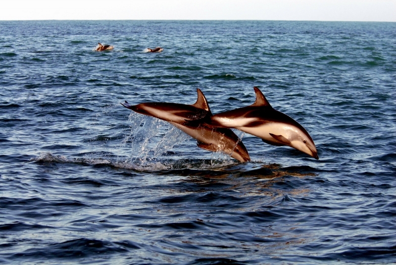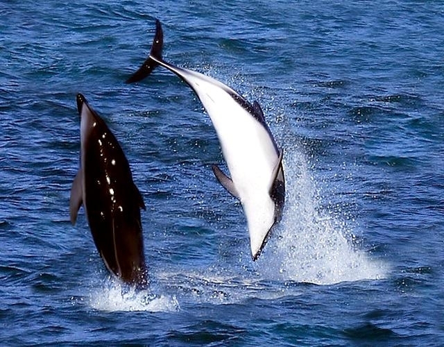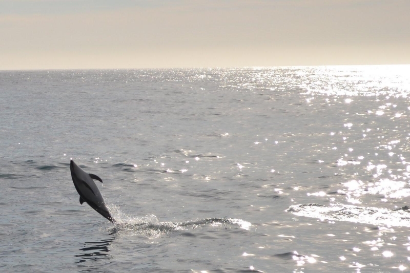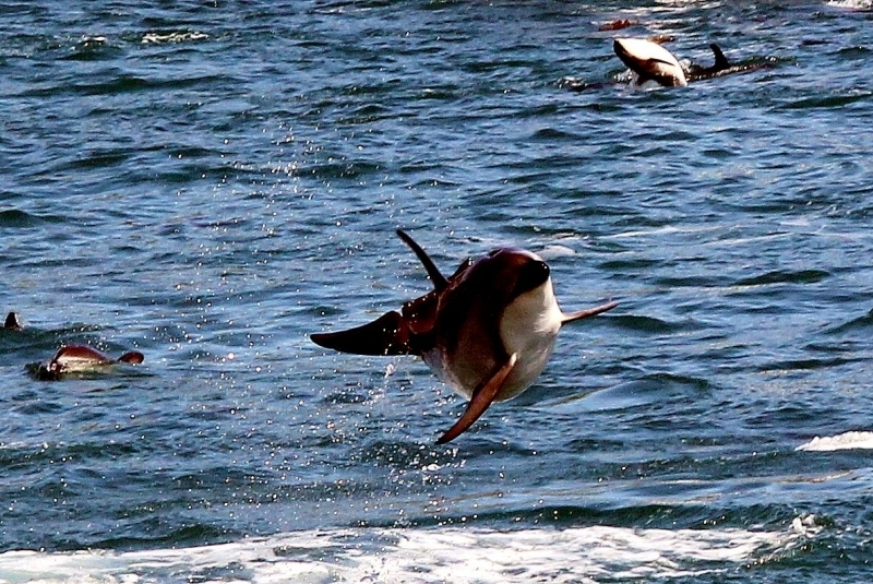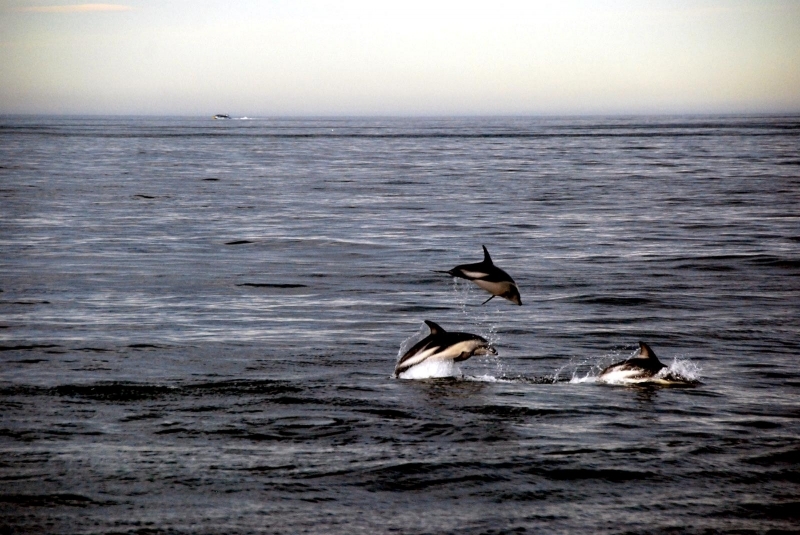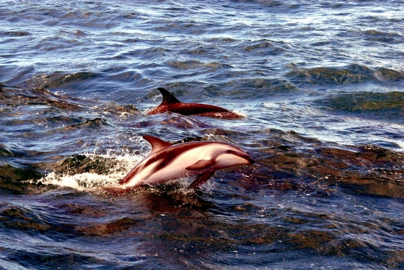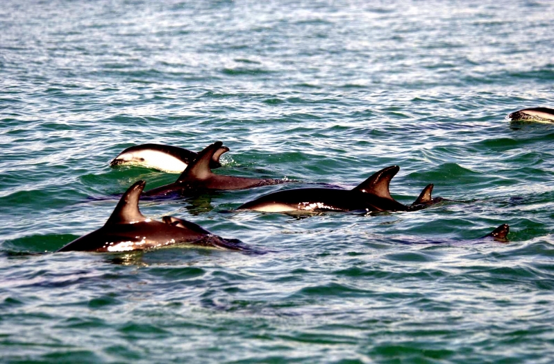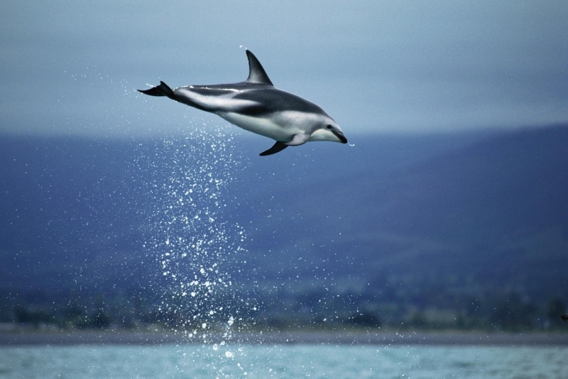 Most calves tend to be born towards the end of the winter and in the early summer months between October & February when the female gives birth to a single offspring after a gestation period that lasts for around 11 months. The calf is fed on the nutritious milk provided by its mother until it is then taught to hunt by her after about a year. Calves tend to remain close their mother until they are around 3 years old when they leave to join a pod of their own (males with often form bachelor groups) and the female is then able to mate again. Dusky Dolphins are thought to be able to first breed when they are between the ages of 4 to 5 and are thought to live for an average of 20 years. The Dusky Dolphin is a carnivorous animal that only feeds on other animals in order to gain the nutrients that it needs to survive. By congregating in large pods, Dusky’s are able to trap vast schools of fish so that they have the best opportunity to feed, by traveling through the waters in a line and pushing the shoal into an area where it is trapped. Prey depends largely on the area in which the Dusky Dolphins are feeding but they most commonly consume anchovies, sardines & mackerel in shallower waters, squid at mid-depths and larger prey including hake & octopus in deeper ocean. Although they have excellent hearing and are able to see remarkably well through the water, it is actually a specially evolved system that these animals use which both helps them to locate prey and to also avoid upcoming obstacles. By producing a rapid series of clicking noises, the Dusky Dolphin’s brain is then able to translate the clicks that bounce off things ahead such as fish, into a mental sound map of the surrounding area and therefore knows exactly where to find food.