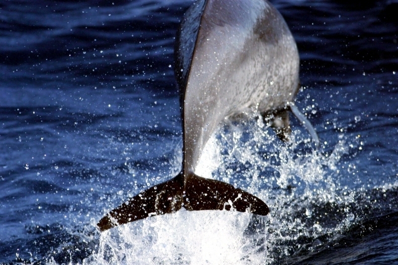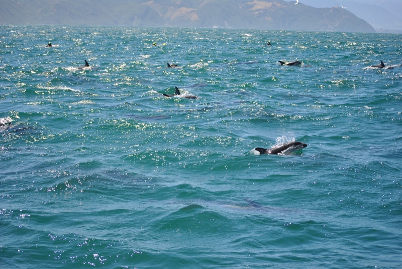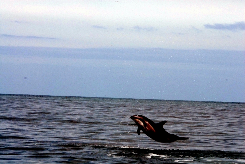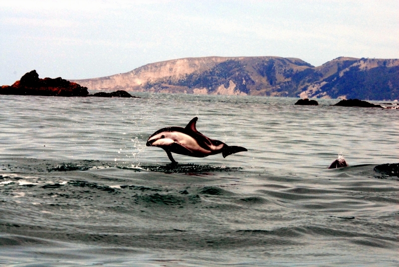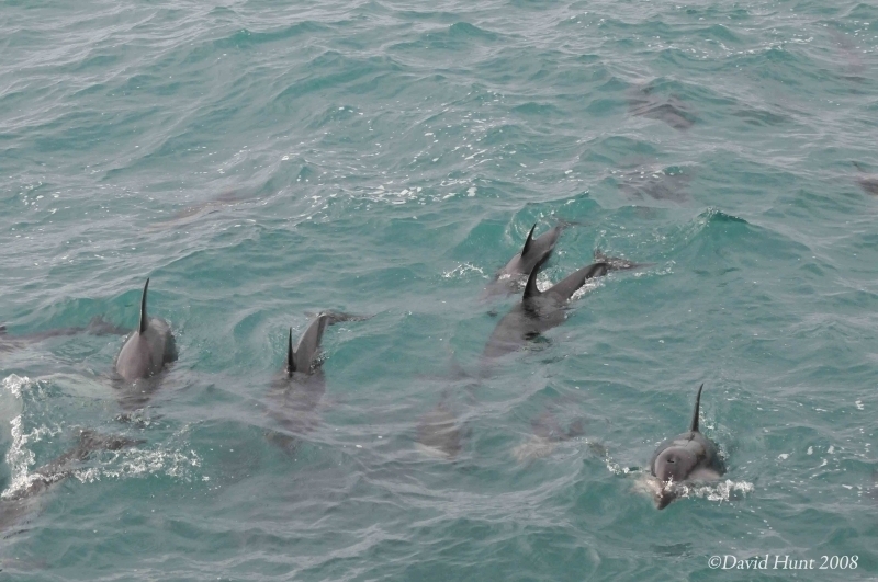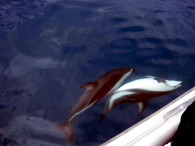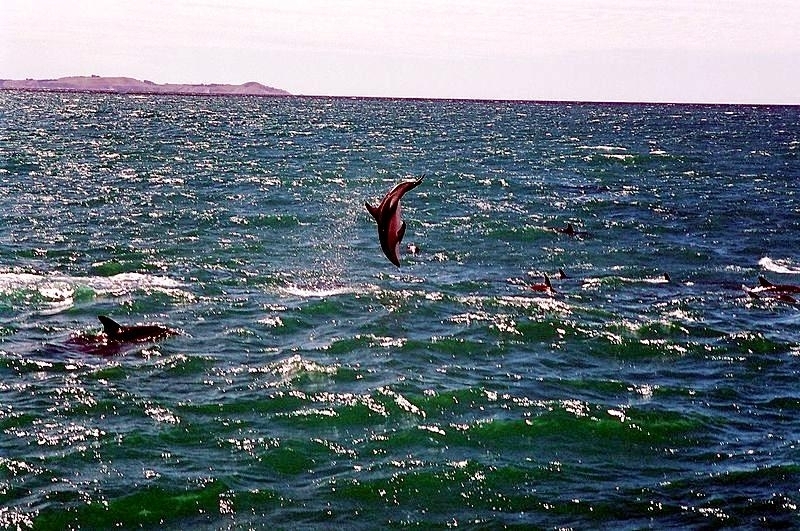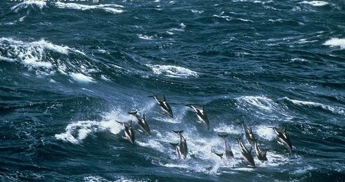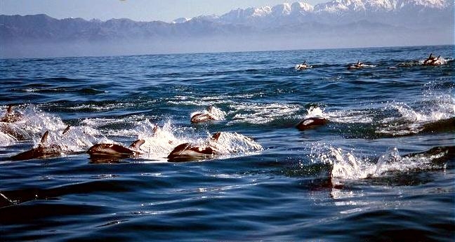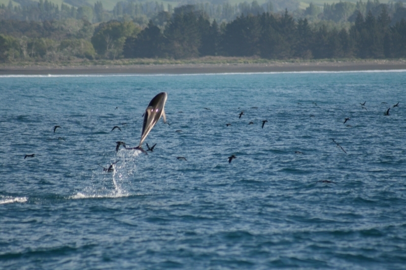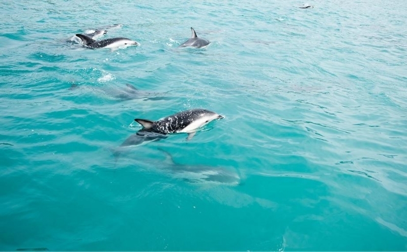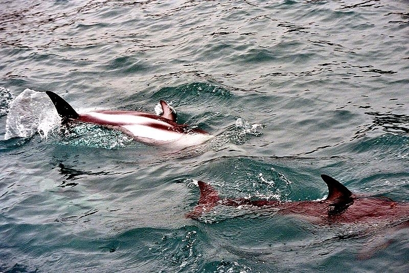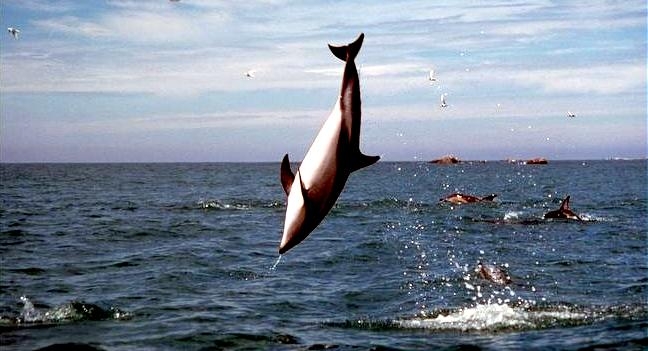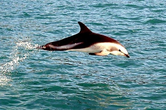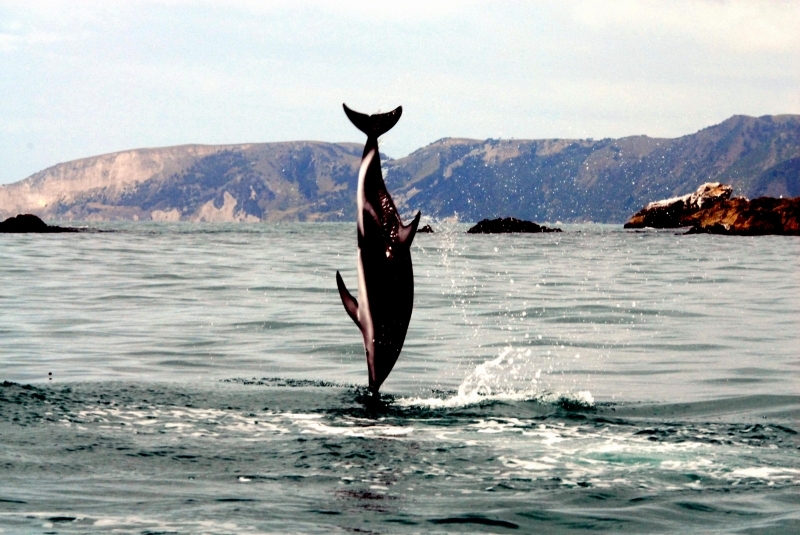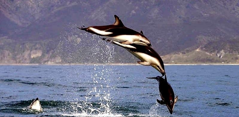 Most calves tend to be born towards the end of the winter and in the early summer months between October & February when the female gives birth to a single offspring after a gestation period that lasts for around 11 months. The calf is fed on the nutritious milk provided by its mother until it is then taught to hunt by her after about a year. Calves tend to remain close their mother until they are around 3 years old when they leave to join a pod of their own (males with often form bachelor groups) and the female is then able to mate again. Dusky Dolphins are thought to be able to first breed when they are between the ages of 4 to 5 and are thought to live for an average of 20 years. The Dusky Dolphin is a carnivorous animal that only feeds on other animals in order to gain the nutrients that it needs to survive. By congregating in large pods, Dusky’s are able to trap vast schools of fish so that they have the best opportunity to feed, by traveling through the waters in a line and pushing the shoal into an area where it is trapped. Prey depends largely on the area in which the Dusky Dolphins are feeding but they most commonly consume anchovies, sardines & mackerel in shallower waters, squid at mid-depths and larger prey including hake & octopus in deeper ocean. Although they have excellent hearing and are able to see remarkably well through the water, it is actually a specially evolved system that these animals use which both helps them to locate prey and to also avoid upcoming obstacles. By producing a rapid series of clicking noises, the Dusky Dolphin’s brain is then able to translate the clicks that bounce off things ahead such as fish, into a mental sound map of the surrounding area and therefore knows exactly where to find food.