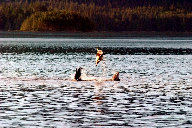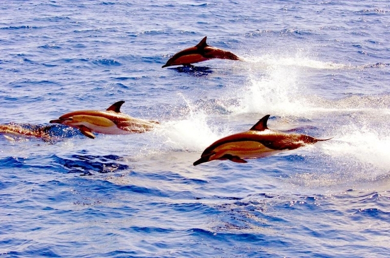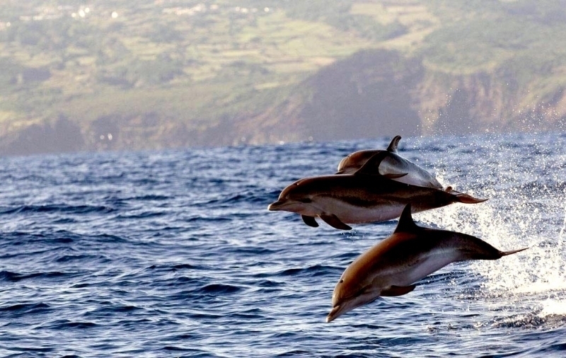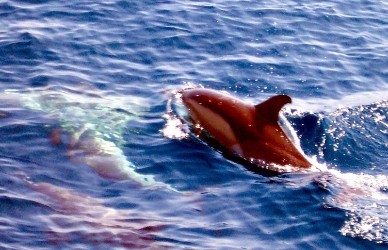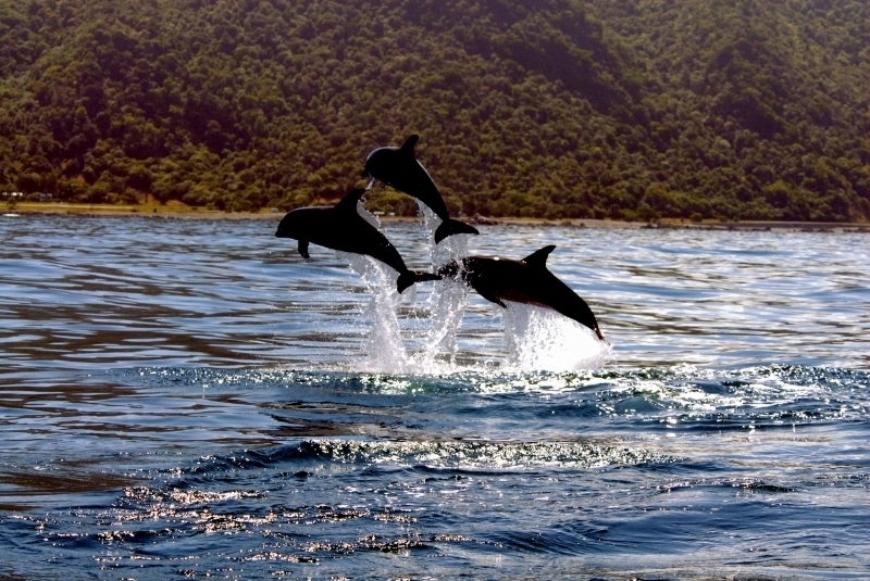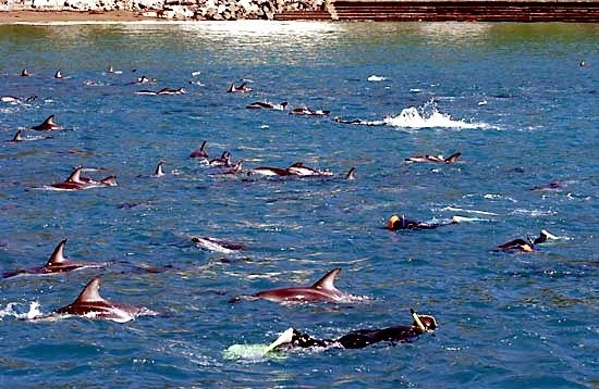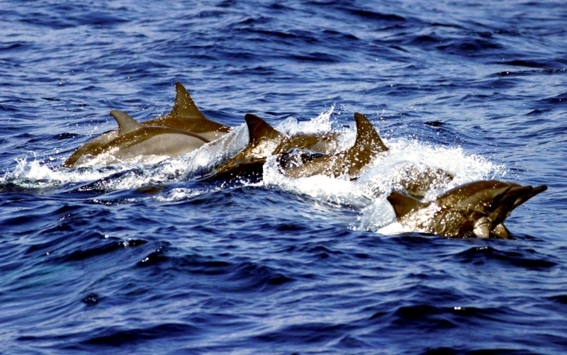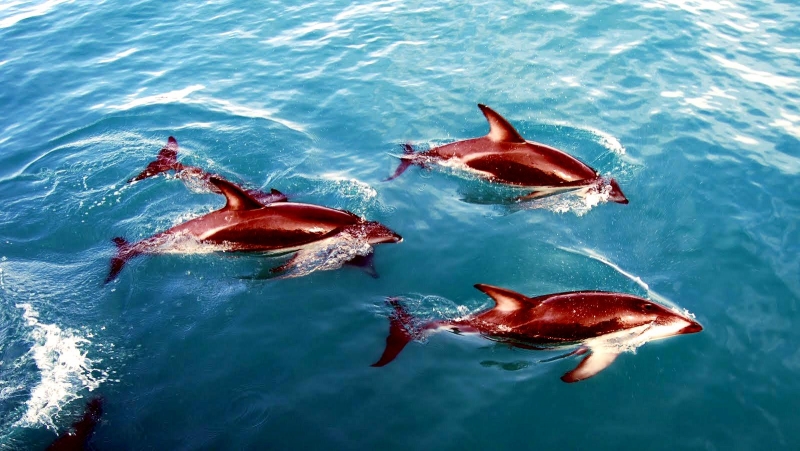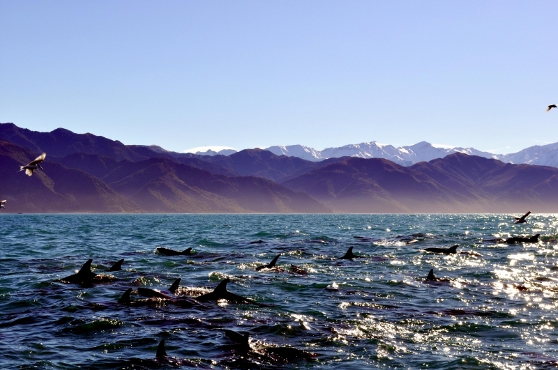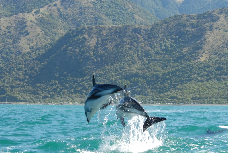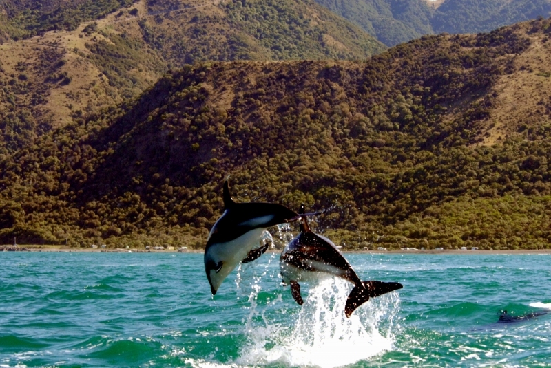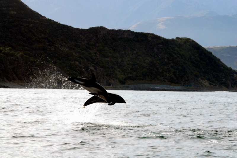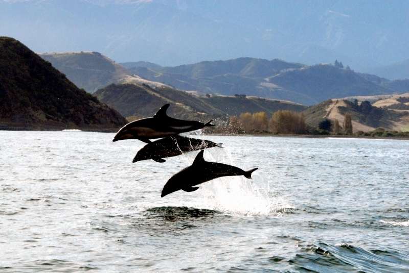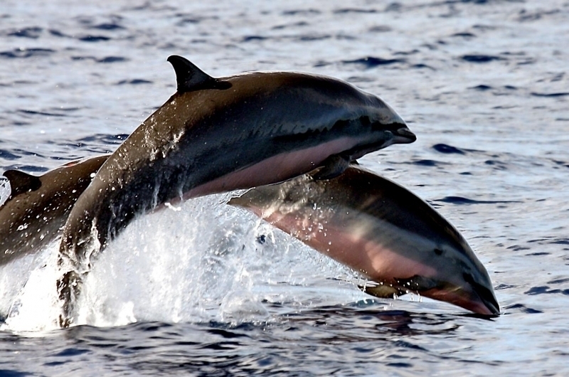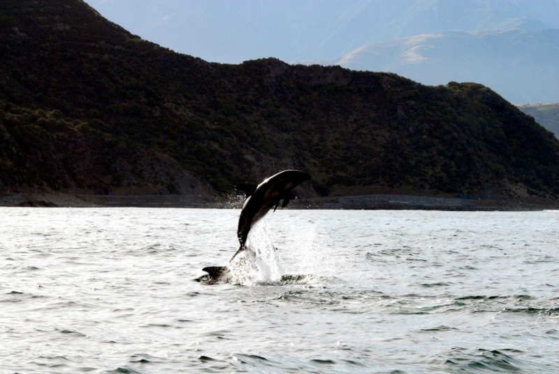 Most calves tend to be born towards the end of the winter and in the early summer months between October & February when the female gives birth to a single offspring after a gestation period that lasts for around 11 months. The calf is fed on the nutritious milk provided by its mother until it is then taught to hunt by her after about a year. Calves tend to remain close their mother until they are around 3 years old when they leave to join a pod of their own (males with often form bachelor groups) and the female is then able to mate again. Dusky Dolphins are thought to be able to first breed when they are between the ages of 4 to 5 and are thought to live for an average of 20 years. The Dusky Dolphin is a carnivorous animal that only feeds on other animals in order to gain the nutrients that it needs to survive. By congregating in large pods, Dusky’s are able to trap vast schools of fish so that they have the best opportunity to feed, by traveling through the waters in a line and pushing the shoal into an area where it is trapped. Prey depends largely on the area in which the Dusky Dolphins are feeding but they most commonly consume anchovies, sardines & mackerel in shallower waters, squid at mid-depths and larger prey including hake & octopus in deeper ocean. Although they have excellent hearing and are able to see remarkably well through the water, it is actually a specially evolved system that these animals use which both helps them to locate prey and to also avoid upcoming obstacles. By producing a rapid series of clicking noises, the Dusky Dolphin’s brain is then able to translate the clicks that bounce off things ahead such as fish, into a mental sound map of the surrounding area and therefore knows exactly where to find food.