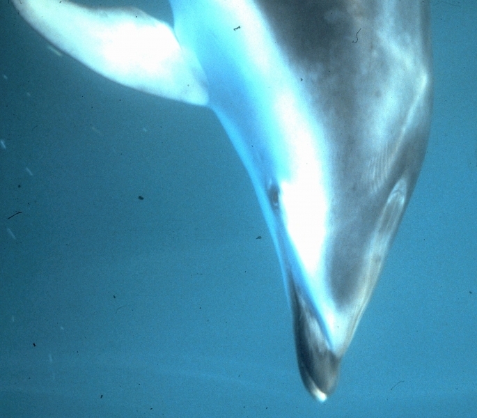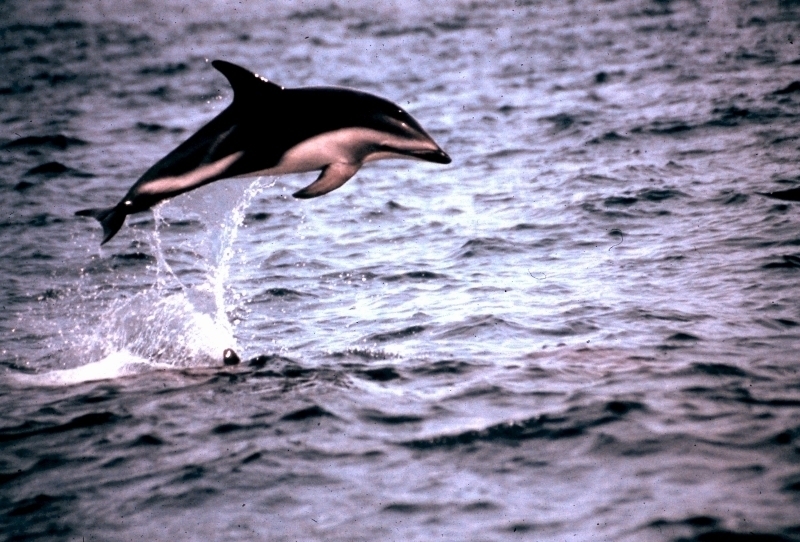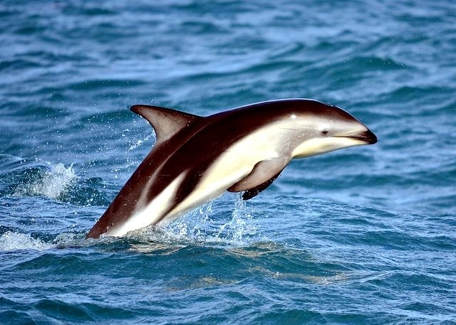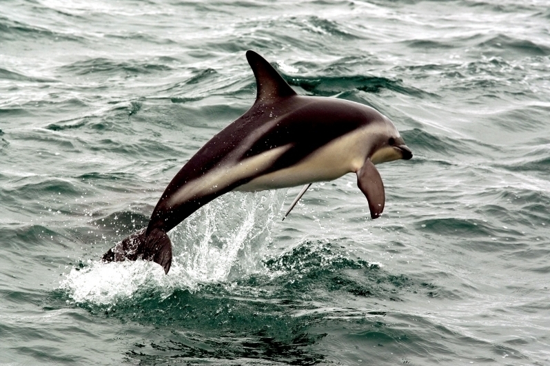 The Dusky Dolphin is a small species of dolphin that is found inhabiting the cooler waters along continental shelves throughout the southern hemisphere. It is commonly thought that the Dusky Dolphin was first described by John Edward Gray in 1828 from stuffed skin and a single skull shipped from the Cape of Good Hope to the British Museum. It gained its current name from American biologist Dr. Frederick W. True in 1889. Dusky Dolphins are widespread throughout the southern hemisphere with 3 species being recognized that have been grouped by their geographical range, with one found off the coast of South America, one near South Africa in the Indian Ocean and another in the deeper waters close to New Zealand. Dusky populations have declined throughout much of their natural range primarily due to threats caused by increasing levels of human activity. The Dusky Dolphin is the smallest of the world’s 33 different species of dolphin growing to under 2 meters in length and generally weighing less than 100 kilograms. Like other species of cetacean, they have a smooth & hairless, streamlined body that helps them to glide through the water and is powered by their 2 tail flukes which lay horizontally rather than vertically like those of fish. The upper-side of their bodies is either dark grey or blue-black in color and is separated from their light gray to white under-side by a grey line which runs from their beak to the base of their tail. Dusky Dolphins also have 2 light grey lines which run diagonally from their tail to their dorsal fin which is tall and curved to help them to change direction quickly in the water. The beak of the Dusky is black and more rounded in shape than those of other dolphin species and contains between 24 and 36 pairs of sharp, cone-shaped teeth that are ideal for catching slippery and fast-moving prey.