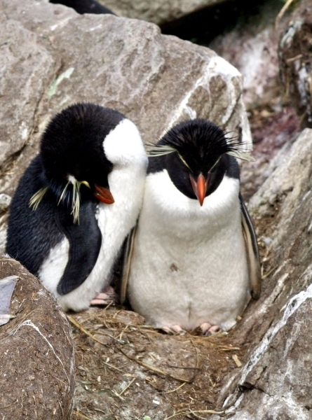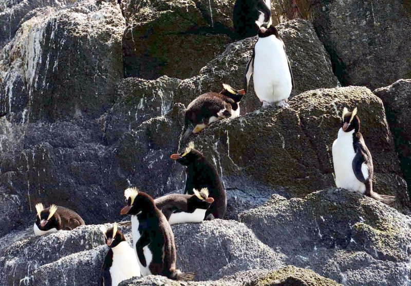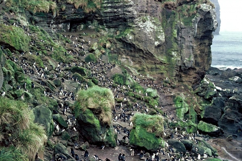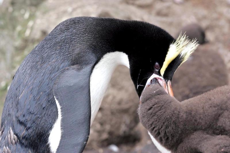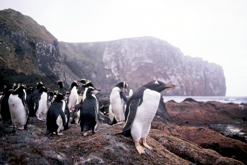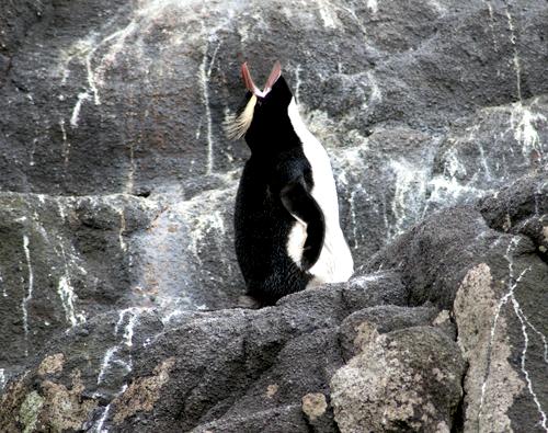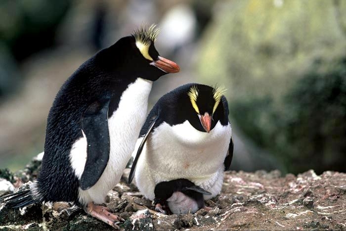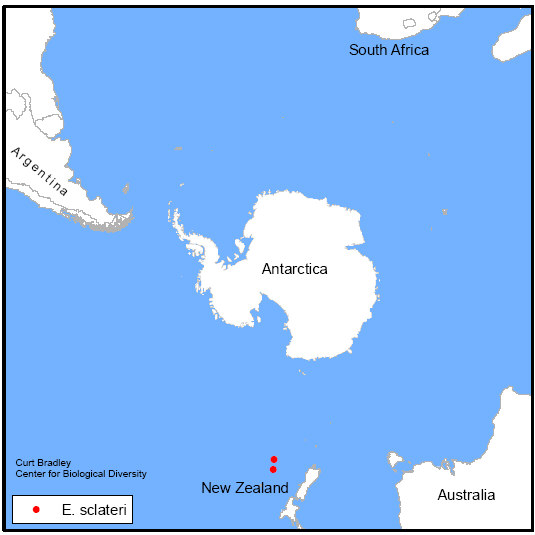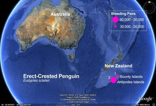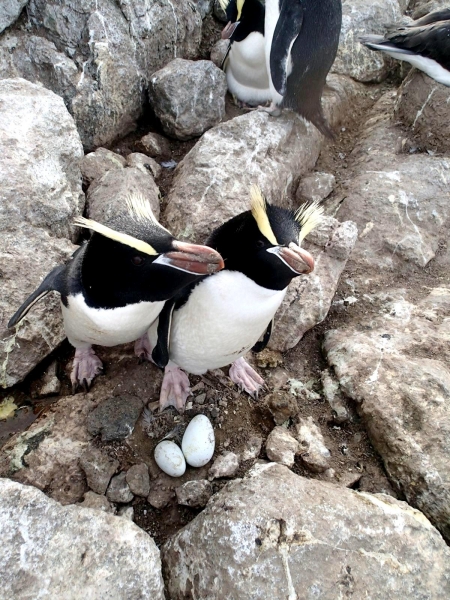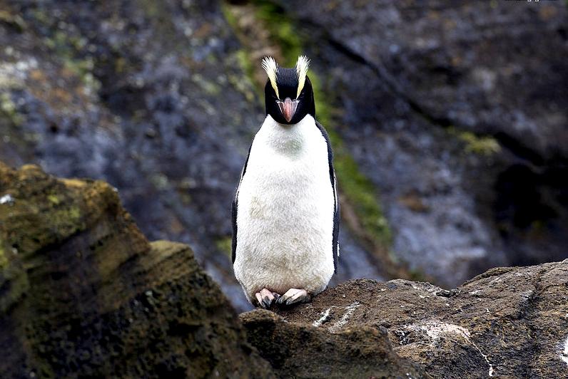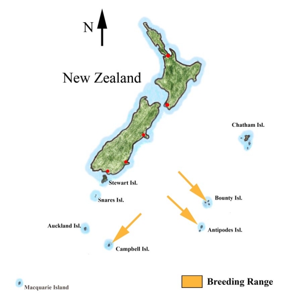 Erect-crested Penguins are a very social species with many displays and vocalizations. Like other penguin species, mating Erect-crested pairs recognize each other both by sight and the distinct vocalizations of individual birds whose harsh, low-pitched calls are heard mainly during the day. Aggressive displays are characterized by the use of the crest and by a lowered head, combined with a growling or barking. Fighting behavior includes twisting of bills, biting and flipper beat. Juveniles are sometimes found molting on the New Zealand mainland. Erect-crested Penguins feed on small fish & krill near the surface and may travel hundreds of kilometers at a time to hunt for prey. They breed in large colonies on rocky coasts, often high up steep inclines where nests are formed on rock platforms. Erect-crested Penguins often breeds near Rockhopper Penguin colonies. Courtship displays include an enthusiastic greeting with an open bill, vertical head swinging, trumpeting, quivering, bowing and preening. Males return to the breeding colonies in September competing & fighting for nest sites. The females join the males 2-weeks later and work together to form nests made of mud, stones and grass. Female Erect-crested Penguins lay 2 eggs, the first of which is lost 98% of the time, leaving the larger second egg to be incubated. Incubation lasts for about 35 days and the chicks are fed regurgitated food by the females until they fledge in February. Adults return to sea after molting in March. These seabirds are only found primarily on New Zealand’s Antipodes Islands and Bounty Islands with smaller populations around the Auckland Islands and Campbell Islands.