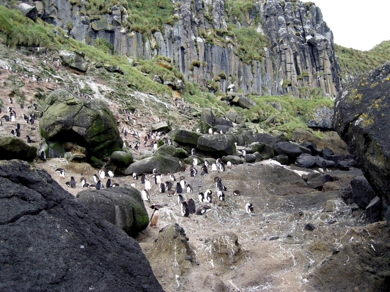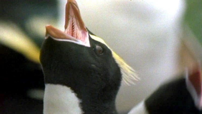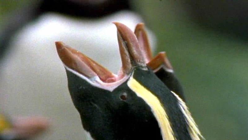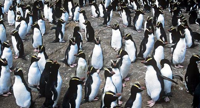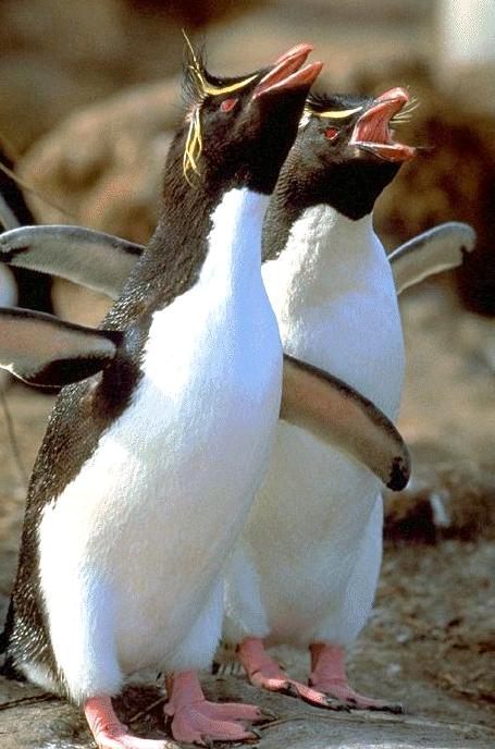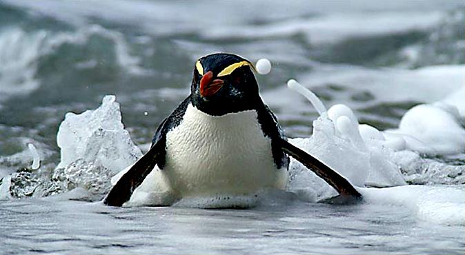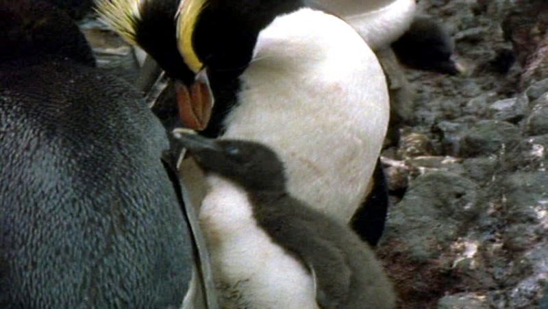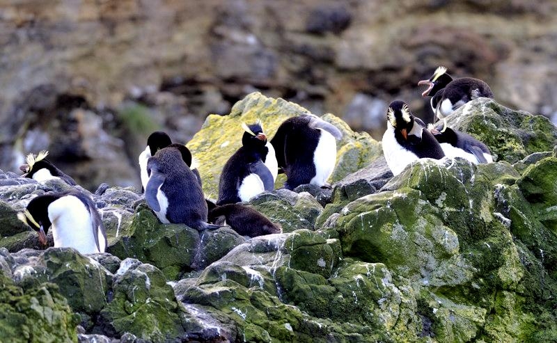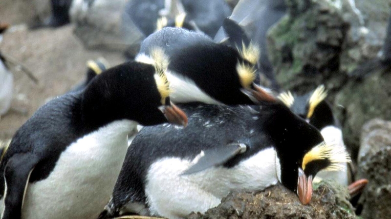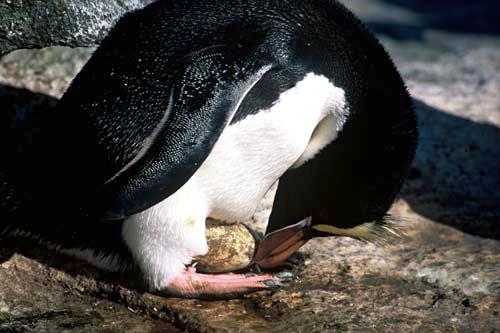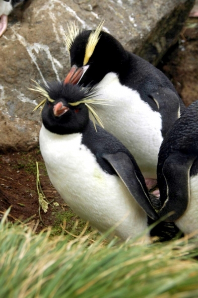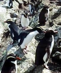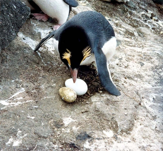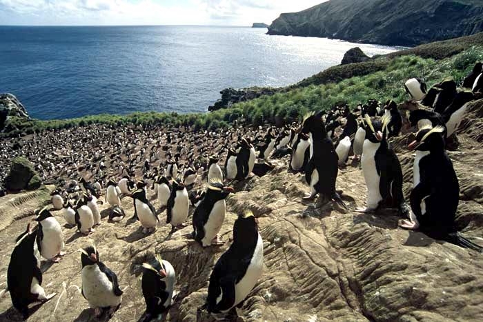 Erect-crested Penguins are a very social species with many displays and vocalizations. Like other penguin species, mating Erect-crested pairs recognize each other both by sight and the distinct vocalizations of individual birds whose harsh, low-pitched calls are heard mainly during the day. Aggressive displays are characterized by the use of the crest and by a lowered head, combined with a growling or barking. Fighting behavior includes twisting of bills, biting and flipper beat. Juveniles are sometimes found molting on the New Zealand mainland. Erect-crested Penguins feed on small fish & krill near the surface and may travel hundreds of kilometers at a time to hunt for prey. They breed in large colonies on rocky coasts, often high up steep inclines where nests are formed on rock platforms. Erect-crested Penguins often breeds near Rockhopper Penguin colonies. Courtship displays include an enthusiastic greeting with an open bill, vertical head swinging, trumpeting, quivering, bowing and preening. Males return to the breeding colonies in September competing & fighting for nest sites. The females join the males 2-weeks later and work together to form nests made of mud, stones and grass. Female Erect-crested Penguins lay 2 eggs, the first of which is lost 98% of the time, leaving the larger second egg to be incubated. Incubation lasts for about 35 days and the chicks are fed regurgitated food by the females until they fledge in February. Adults return to sea after molting in March. These seabirds are only found primarily on New Zealand’s Antipodes Islands and Bounty Islands with smaller populations around the Auckland Islands and Campbell Islands.