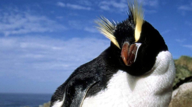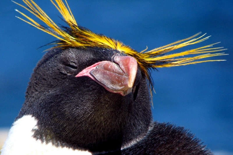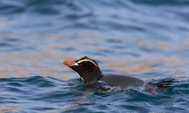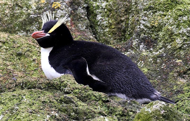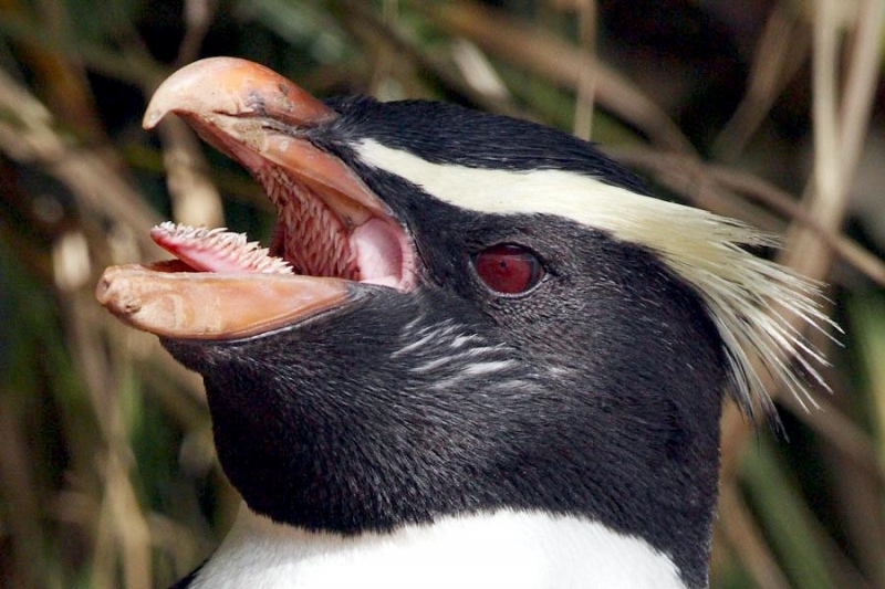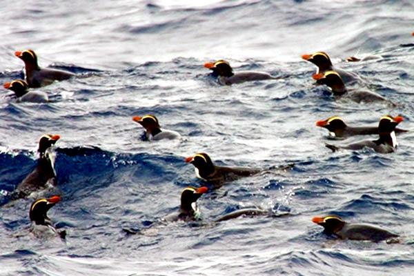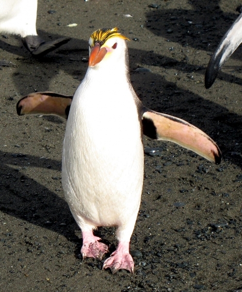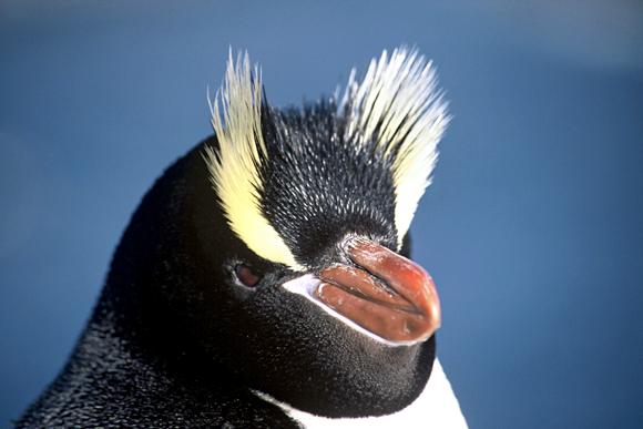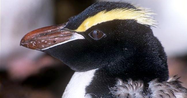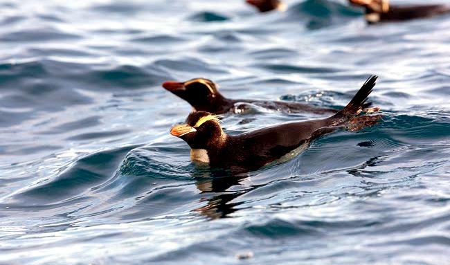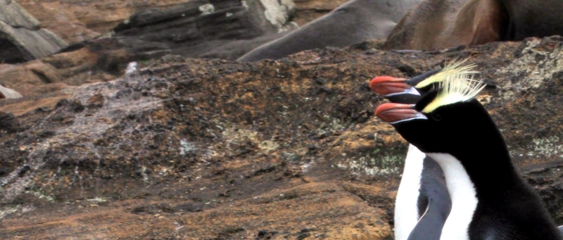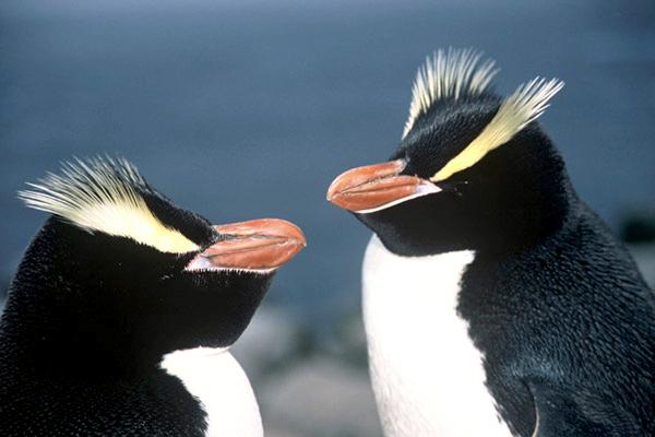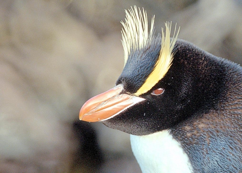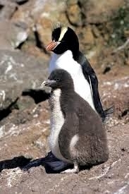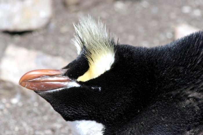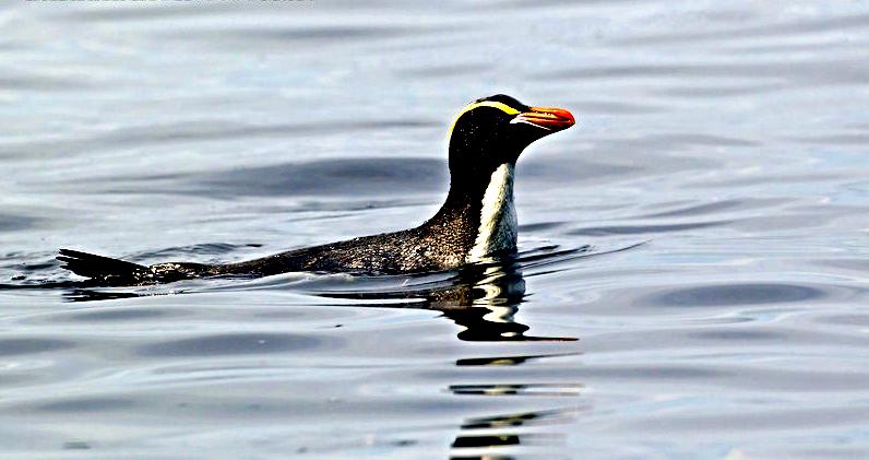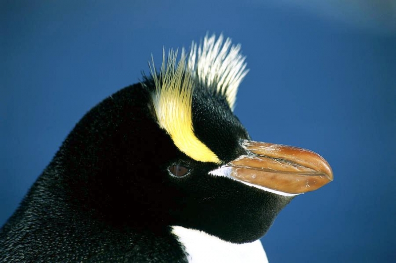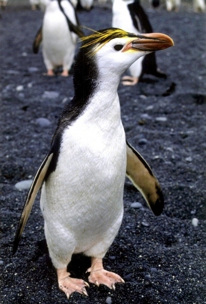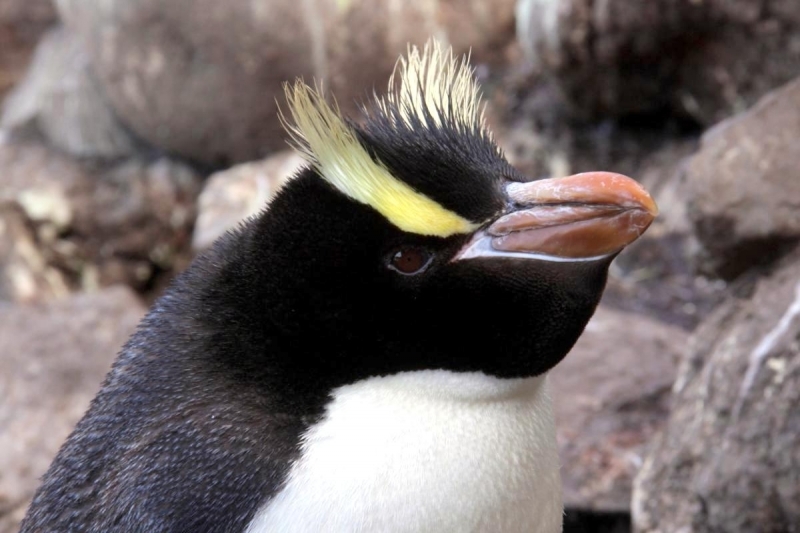 Erect-crested Penguins are the largest of the 6 species of crested penguins standing about 50 centimeters tall and weighing up to 4 kilograms. Erect-crested Penguins are also known as “Big-crested Penguins”. The “erect crest” component of their common name refers to the wide yellow streaks that point upward from above their eye areas. Their characteristic brush-like crests distinguish them from other species, however they are easily confused with their cousins the Fiordland-crested Penguin and Snares-crested Penguin. The word Penguin first appears in the 16th century as a synonym for the now extinct Great Auk. When European explorers discovered what are today known as Penguins in the Southern Hemisphere, they noticed their similar appearance to the Great Auk of the Northern Hemisphere and named them after this bird, although they are not closely related. Males are generally larger than the females. Adults have black heads and throats with a wide yellow stripe on their face that extends above their eye forming the erect crest. This species sports the classic tuxedo with a black back & white belly. The dorsal (upper) side of their flippers are black with white edges and white with a black patch at the tip underneath. Erect-crested Penguins have long, slender beaks that are dark orange in color. Juveniles are distinguished from adults by their slight difference in color and shorter crests.