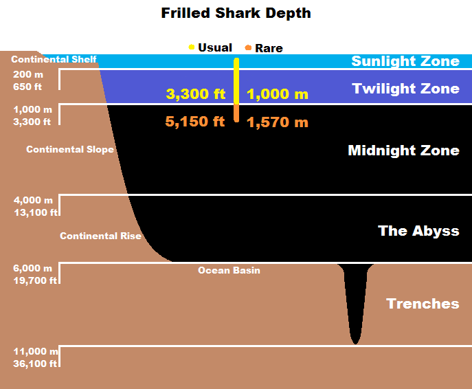 Although these species are rare, scientists have been able to discover these sharks from Pacific & Atlantic oceans. These species inhabit all along the northern Scotland, northern Norway, Morocco, France, western Ireland and Mauritania. A good many number of these individuals are also found in the Rio Grande Rise off southern Brazil, Mid-Atlantic Ridge, Vavilov Ridge, Georgia, Suriname, New England and western Pacific. Most of these species are known to reside in Honshu (Japan), New South Wales, Tasmania, eastern Pacific, Hawaii, California, northern Chile, southern Africa and around New Zealand. They exist all throughout the mid-continental as well as continental shelf. The Frilled Shark is also caught at a depth of about 1,570 meters (5,150 feet) which is unusual but the average depth is 50–200 meters (160–660 feet) and they are often found less than 1,000 meters (3,300 feet) depth. When the water temperature at 100 meters (330 feet) exceeds 15 °C, the Frilled Shark tends to move deeper. Therefore, one may suggest that these species might undergo vertical migrations. Because of its extended jaw, Frilled Sharks are capable to ingest prey size of one-half of its own. Nonetheless, these species are not adaptable for delivering strong powerful bite force probably because of its length and the expression of its jaws. These types of fishes primarily prey on smaller sharks, bony fishes & cephalopods. The bulk of their diet is composed of squid (60% of squid) especially for those living in Suruga Bay, Japan. They are comparatively fast swimmers in deep oceanic waters.