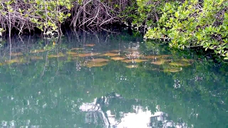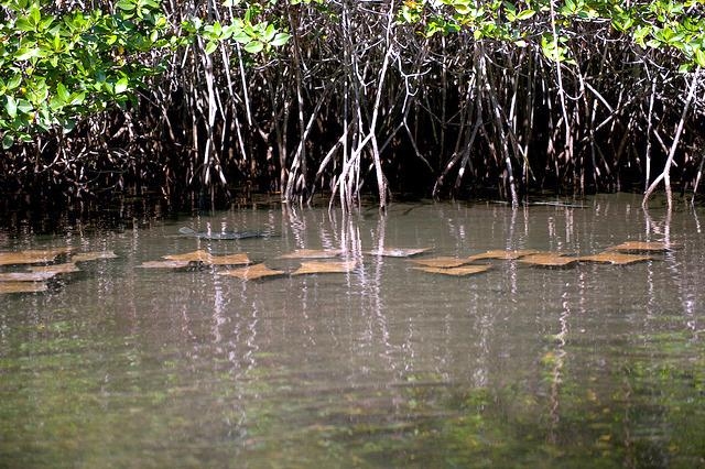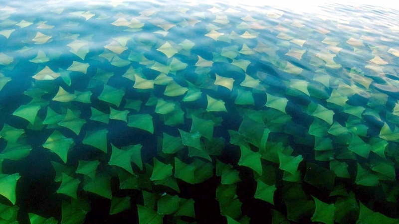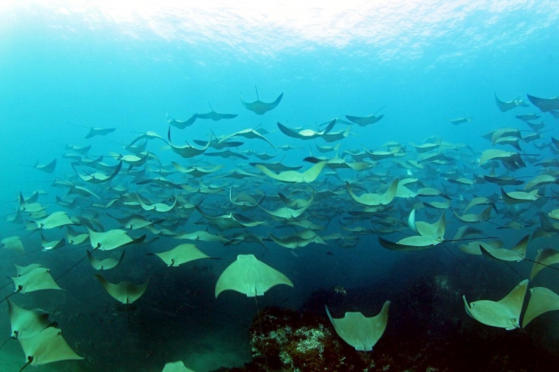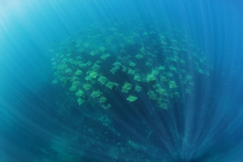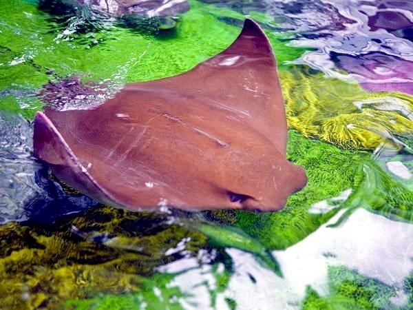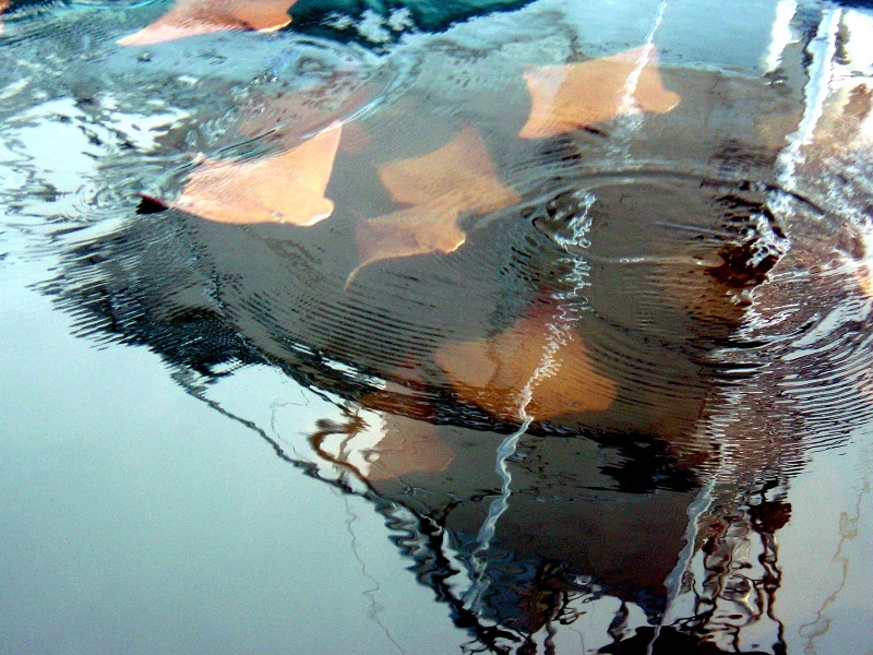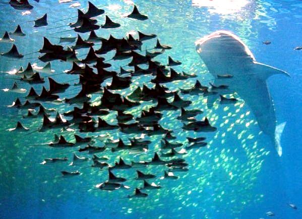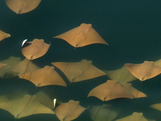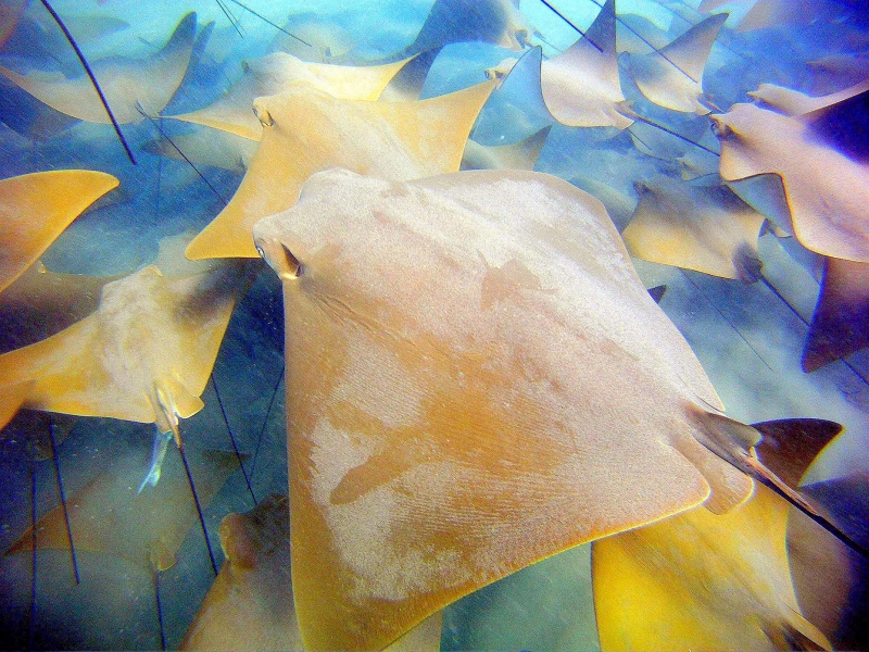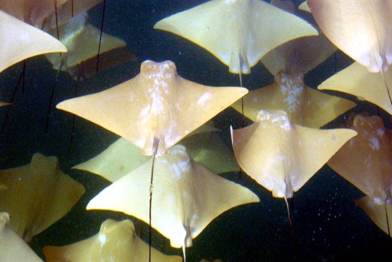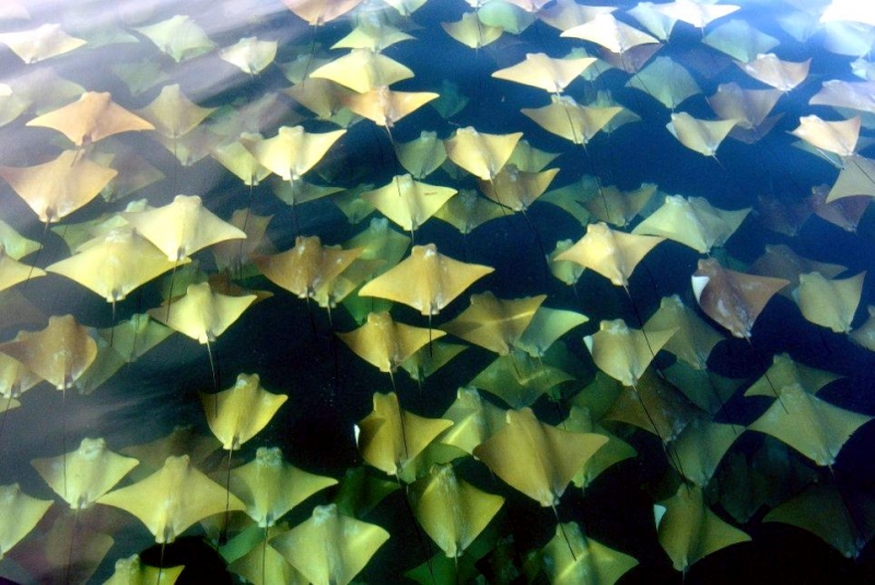 Why do Golden Stingrays migrate? They are oceanodromous, which means “truly migratory fishes that live and migrate wholly in the sea”. Twice a year, up to 10,000 Golden Stingrays gather near Yucatan Peninsula and migrate about 800 miles across the Gulf of Mexico. They swim to western Florida in the spring and back to the Yucatan Peninsula in fall. In the Atlantic Ocean, Golden Stingray populations also migrate northward as far as New England in late spring and southward as far as southern Brazil in late fall. No one yet knows why they migrate or what initiates the sociable gathering of so many thousands to make the swim together. Some guesses are that changes in water temperature coupled with a certain orientation of the sun tells them “time to head out”. The migration hasn’t yet been linked to feeding or mating activity. One oddity is that the southbound groups seem to be larger than the northbound but again, we don’t know what’s behind that. Golden Stingrays are pelagic meaning they live in the open ocean, although they are sometimes found in inshore, brackish waters. They are extremely gregarious and live in groups known as a fever as opposed to a school. Their mass biannual migration must be quite a show, as they are excellent swimmers as fast as 56 mph and natural acrobats. They use their pectoral fins like wings to swim, glide, twist & turn, measuring up to 7 feet wide (2.1 meters) from tip to tip makes for some pretty impressive acrobatic tricks. They seem to like flipping over and curling their 2 fin tips above the surface of the water, especially the females. Since they are brownish with a pale under-body, some people mistake them for sharks especially with the 2 pectoral fins gliding along jaws-style. They look much like the dorsal fins of a pair of sharks (especially to swimmers, who may react with impressive gymnastic feats of their own). Unlike other stingrays, Golden Stingrays rarely rest on the seabed where unsuspecting humans can step on them and prefer to be on the move, in water from the surface to about 70 feet down (22 meters). They can settle on the bottom to sleep during the day but in deep water, they have to sleep by swimming slowly along or “hang-gliding” in a rising current (rays have no swim bladder, so they sink if they stop swimming). The Golden Stingray is related to sharks, like all 70 species of stingrays. The genus name is derived from the Greek “rhinos” meaning nose and “pteron” meaning wing. The species name bonasus is from the Greek “bonasos” meaning bison. Golden Stingrays are also known as the Cownose Stingray because of their anatomy featuring their long, pointed pectoral fins separate into two lobes on their distinctive, broad head. The lobes and their wide-set eyes give them a cow-like look. Their skeletons are cartilaginous as they have no bones in their bodies therefore no bone marrow, so red-blood cells are produced in the spleen. They are jawed fish with paired fins, paired nares (nostrils), scales and two-chambered hearts. They have no ribs, so if placed on the ground, the larger specie’s own body weight would crush their internal organs long before they would suffocate. They detect prey by sensing movement as well as weak electric signals. They also use their supple, synchronized pectoral fins to forage for food. It’s a nightly group activity. They swim along the bottom, flapping their fins over the sand to expose buried crabs, shellfish and oysters. In front of their mouths, 2 modified fins produce suction so they can whisk the food in and vent water out through their gills.