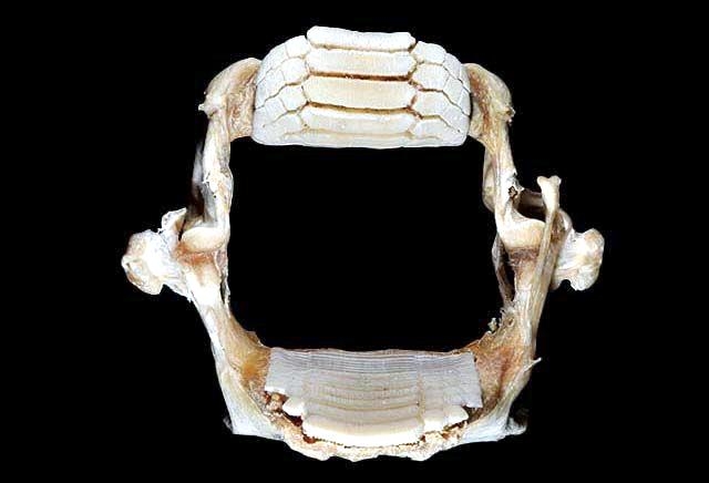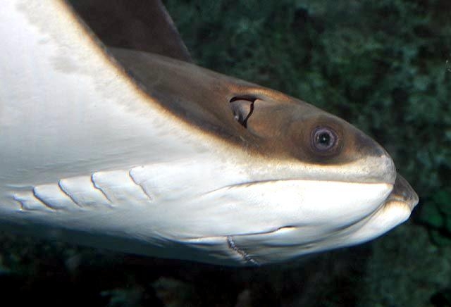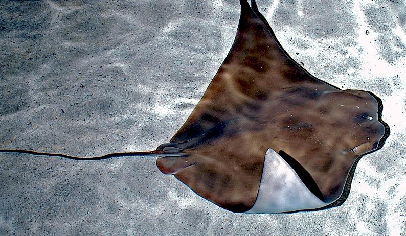Golden Stingrays are ovoviviparous: the females produce eggs, which after fertilization hatch internally, so that the young are “born” live. They mate every winter and females produce usually only one young ray, but can have five or six. The embryo grows within its mother with its wings folded over its body. The gestation period is believed to be 11-12 months, although some evidence suggests that Golden Stingrays might have two gestation periods lasting 5-6 months. At full term, the pup is born live exiting tail first. The Golden Stingray is a foot to a foot & a half wide (28-46 centimeters) at birth and grows to about 45 inches (1.1 meters) wide at maturity, although some have been seen that are about twice that size. It can weigh 50 pounds (23 kilograms) or more. The mother will protect her young until they mature, but they feed themselves. Often called the “pussycats of the sea”, Golden Stingrays are generally docile creatures. Even when isolated, they will attack only when cornered or threatened and they do come armed. Their stinger is a spine (barb) like a fingernail, but actually a scale with serrated, razor-sharp edges. On the Golden Stingray, it is located near the base of its tail not at the tip. This whip-like tail is 2 to 3 times as long as the body and can actually smack you to make the barb especially effective. The blow can sever arteries or even the Achilles tendon in a human leg. The spine carries venom, a protein-based toxin that can produce a drastic decrease in blood pressure, altered respiration, increased pulse, dizziness and shock. If the stingray loses one of its barbs while defending itself, it immediately begins to grow a new one. Stingrays shed and re-grow their spines on a regular basis regardless of whether they use them.