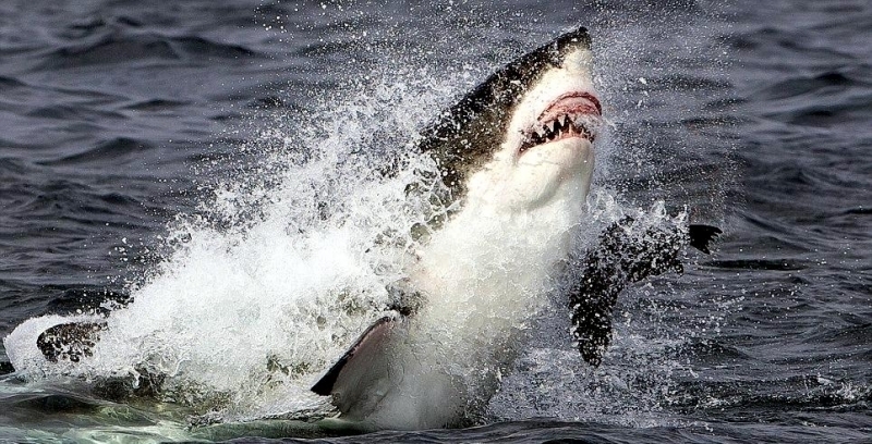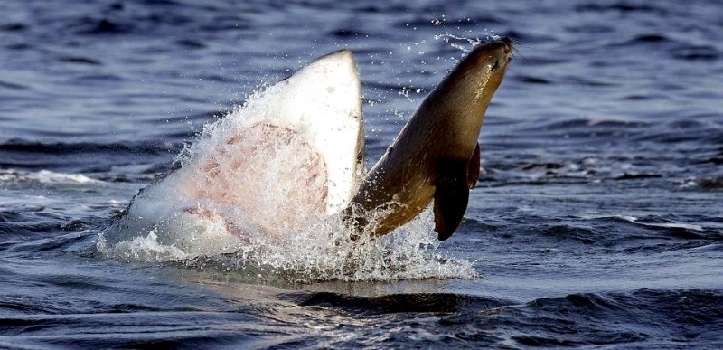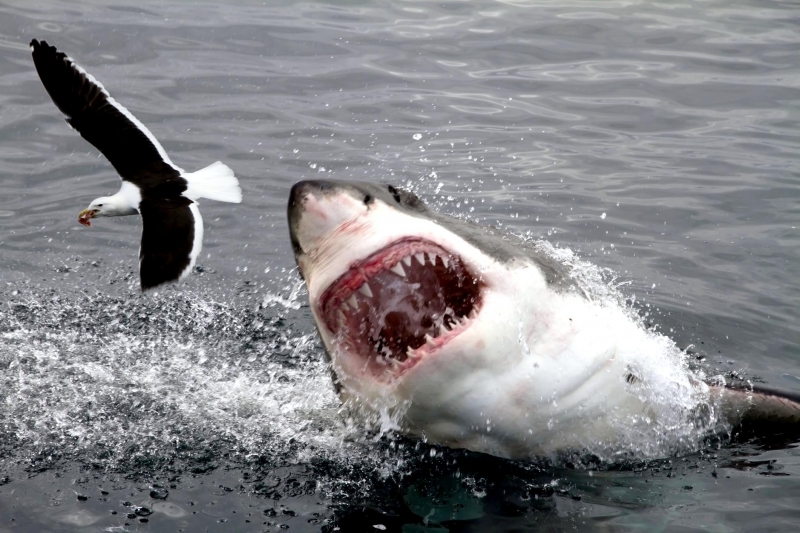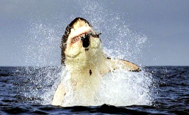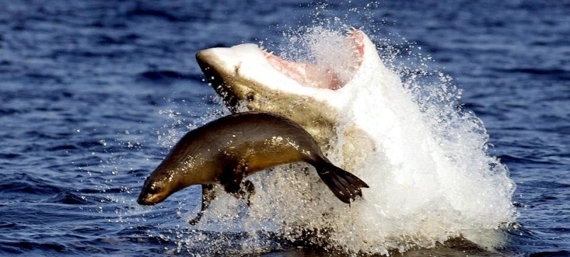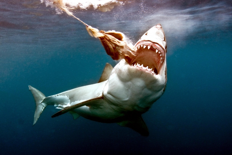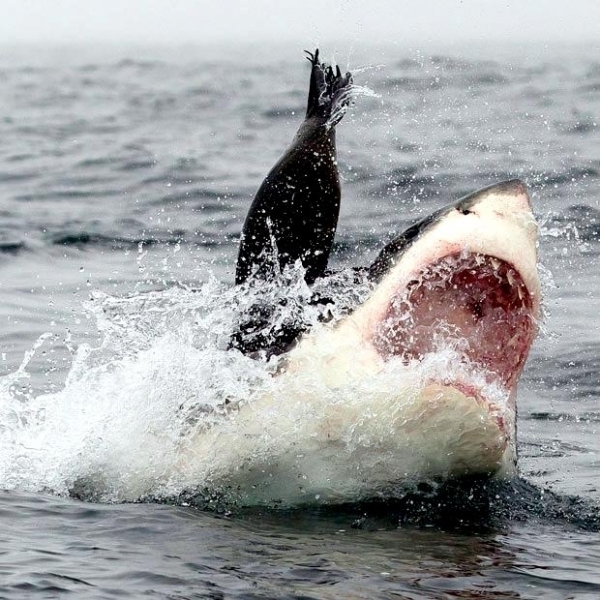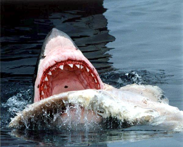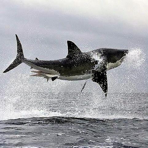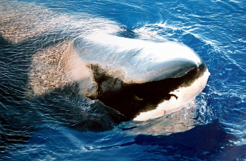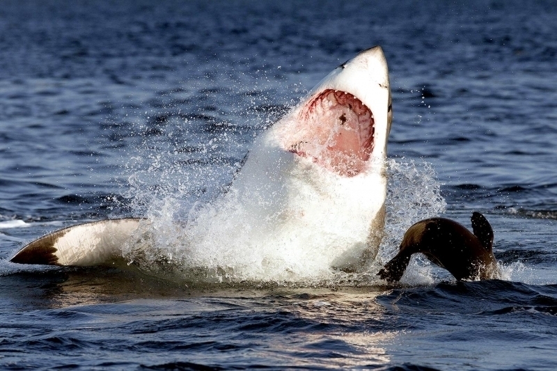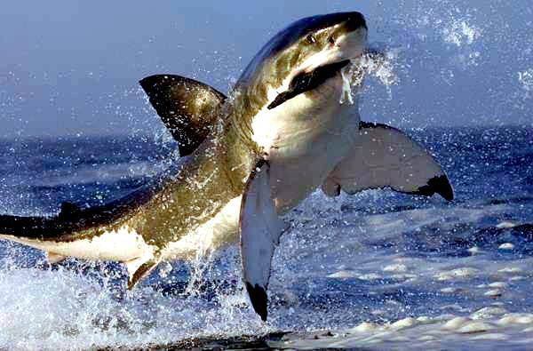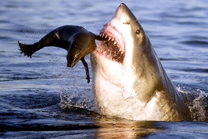 Few creatures strike more fear in humans than the Great White Shark. In reality, Great White attacks on humans are rare and it is even rarer for one of these attacks to be fatal. However the size of the Great White Shark, its efficiency as a predator and movies such as “Jaws”, add to the perpetuation of this unnecessary fear. The Great White averages 15 feet in length, but some have been recorded as large as 20+ foot long and generally weigh up to 5,000 pounds. Great Whites also known as the “White Pointer”, are blue-gray on the dorsal or top part of their bodies. This helps them blend in with the bottom of the ocean when viewed from above. The belly or ventral part of the body is white. This makes it difficult to see the sharks from below, with sunlight shining in around them. They have strong, torpedo-shaped bodies and powerful tails that help them swim. Great White Sharks can reach speeds up to 15 mph. Great Whites use their speed & coloring to help them hunt. They search for prey at the surface of the ocean while swimming below. Once they spot a target, they use a burst of speed to bump their prey while simultaneously biting it. They have several rows of teeth that can number into the thousands. As teeth fall out, they are rapidly replaced by those in the row behind them. These sharp, serrated teeth can be devastating. A single, large bite can be fatal. When Great White Sharks are young, they feed on smaller prey like fish and rays. As they grow larger, they feed more exclusively on marine mammals such as sea lions, seals and small whales.