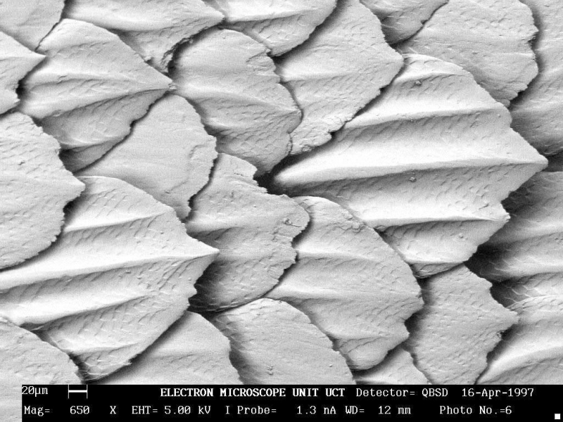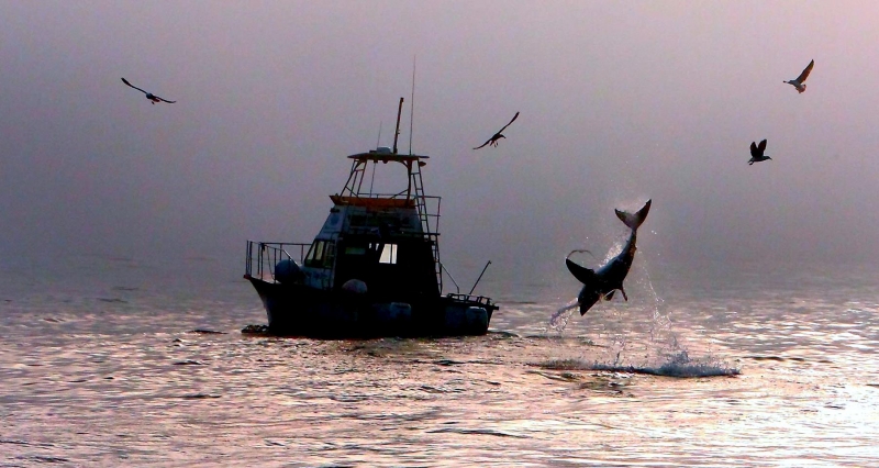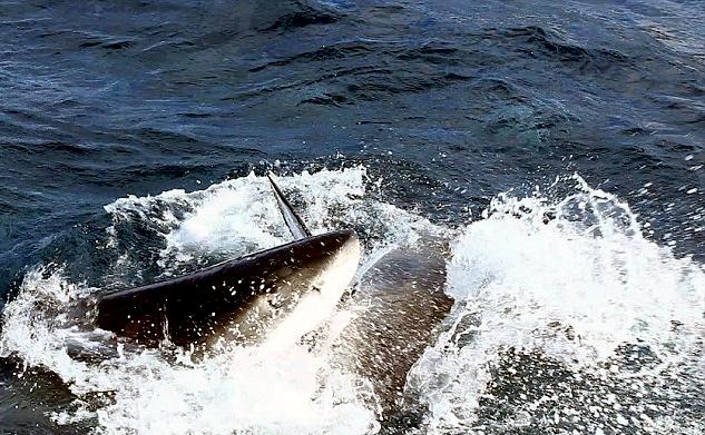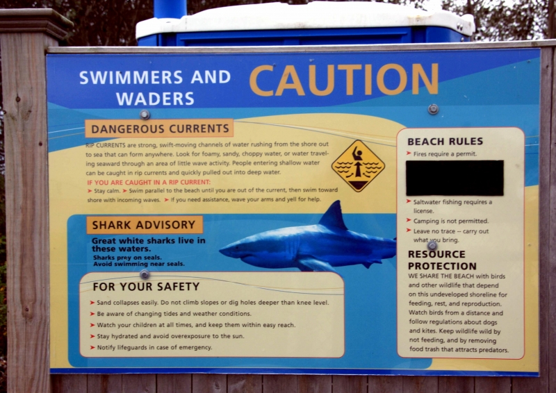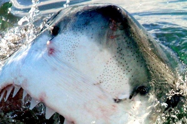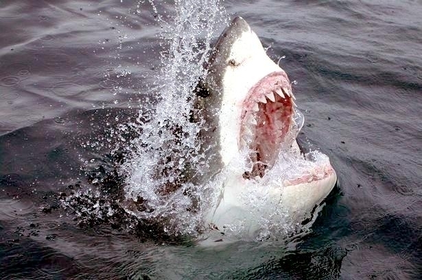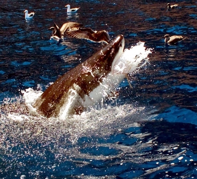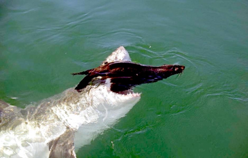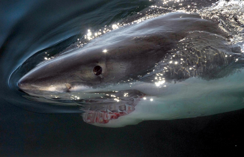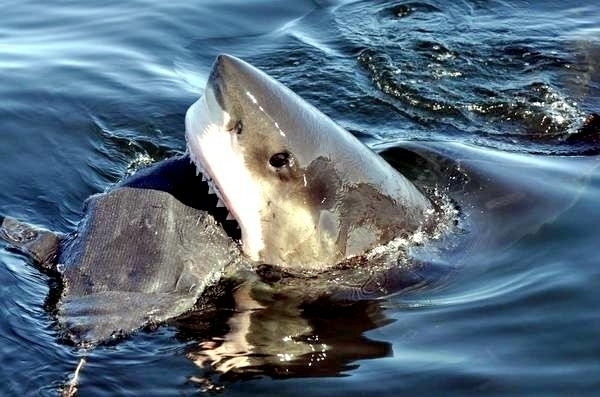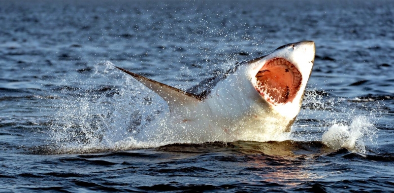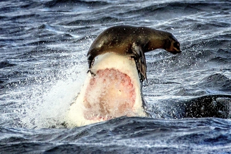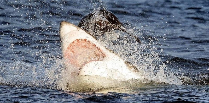 Few creatures strike more fear in humans than the Great White Shark. In reality, Great White attacks on humans are rare and it is even rarer for one of these attacks to be fatal. However the size of the Great White Shark, its efficiency as a predator and movies such as “Jaws”, add to the perpetuation of this unnecessary fear. The Great White averages 15 feet in length, but some have been recorded as large as 20+ foot long and generally weigh up to 5,000 pounds. Great Whites also known as the “White Pointer”, are blue-gray on the dorsal or top part of their bodies. This helps them blend in with the bottom of the ocean when viewed from above. The belly or ventral part of the body is white. This makes it difficult to see the sharks from below, with sunlight shining in around them. They have strong, torpedo-shaped bodies and powerful tails that help them swim. Great White Sharks can reach speeds up to 15 mph. Great Whites use their speed & coloring to help them hunt. They search for prey at the surface of the ocean while swimming below. Once they spot a target, they use a burst of speed to bump their prey while simultaneously biting it. They have several rows of teeth that can number into the thousands. As teeth fall out, they are rapidly replaced by those in the row behind them. These sharp, serrated teeth can be devastating. A single, large bite can be fatal. When Great White Sharks are young, they feed on smaller prey like fish and rays. As they grow larger, they feed more exclusively on marine mammals such as sea lions, seals and small whales.
