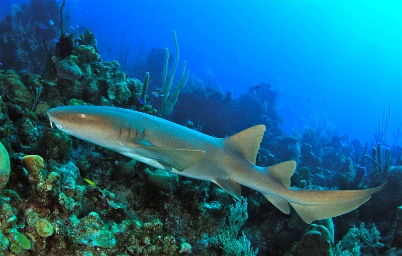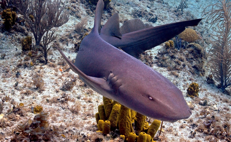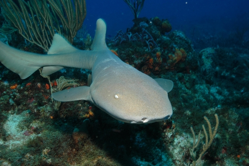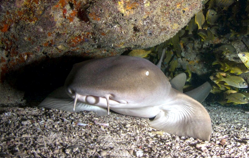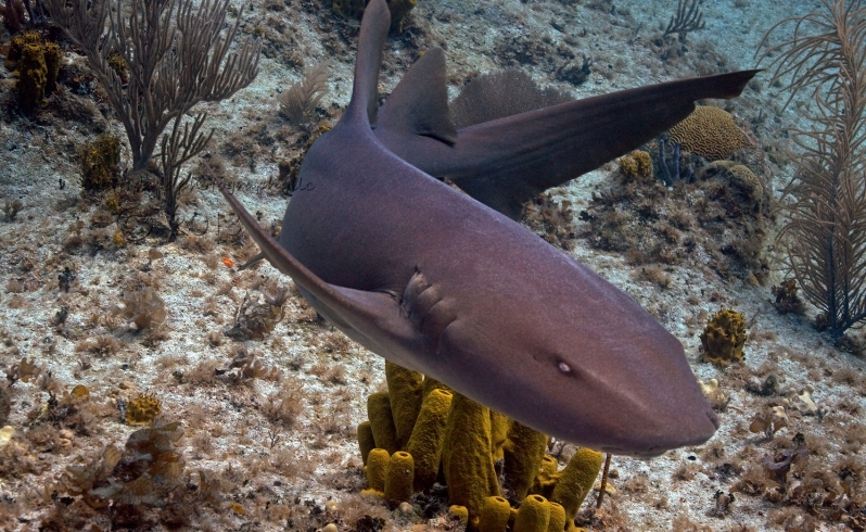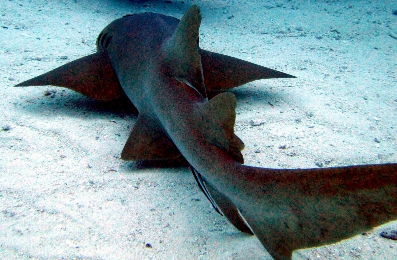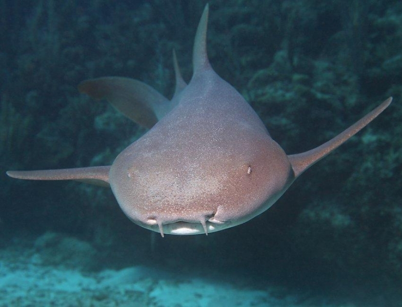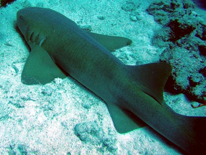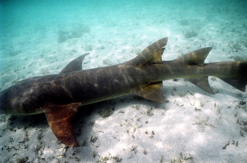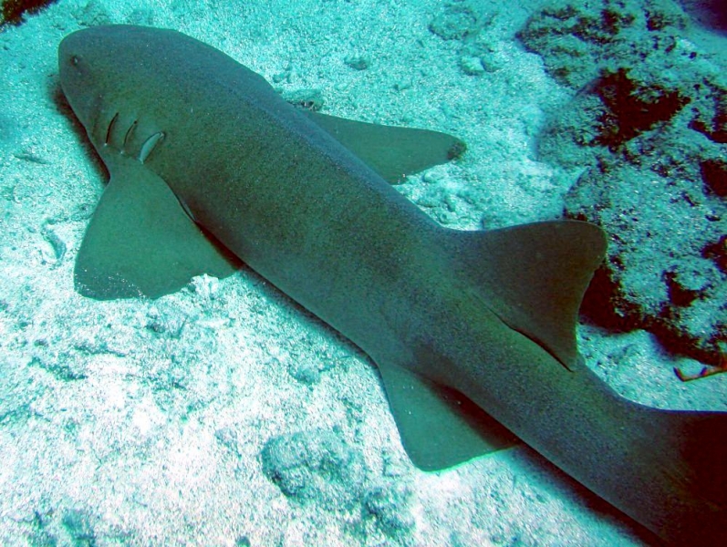 Nurse Sharks reach a maximum of 4.3 meters total length; maximum weight is 110 kilograms. The Nurse Shark is a common reef-associated bottom-dwelling shark found in brackish and marine environments in the shallows to 100 meters. The origin of the name Nurse Shark is unclear. It may come from the sucking sound they make when hunting for prey in the sand, which vaguely resembles that of a nursing baby or it may derive from an archaic word nusse, meaning cat shark. The most likely theory though is that the name comes from the Old English word hurse meaning sea-floor shark. It has moderately long barbels between the nostrils, nasoral (near the nostrils) grooves are present, the mouth is well in front of the eyes, small spiracles, the precaudal tail is shorter than the head and body, the dorsal fins are broadly rounded (the first much larger than the second and anal fins), caudal fin moderately long, over 1/4 of total body length, yellow-brown to gray-brown in color, with or without small dark spots and obscure dorsal saddle markings. Nurse Sharks are commonly found over shallow sand flats, in channels and around coral reefs while the young pups may be found among prop roots of red mangroves. Nurse Sharks show a strong preference for certain resting sites and repeatedly return to the same caves and crevices following nocturnal activity. Nurse Sharks are nocturnal, feeding on bottom invertebrates such as spiny lobsters, shrimp, crabs, sea urchins, squid, octopus, snails & fishes such as mullet, puffers and stingrays.