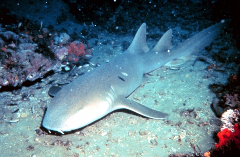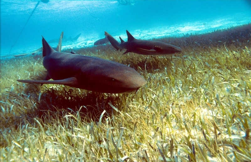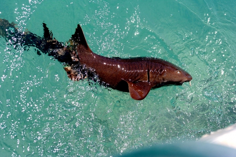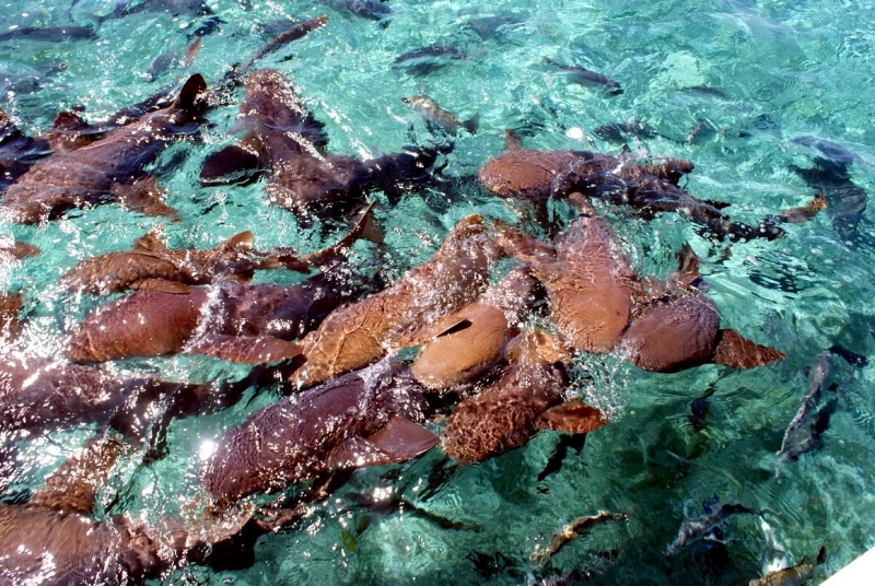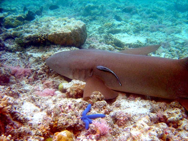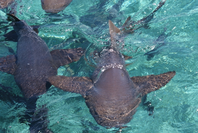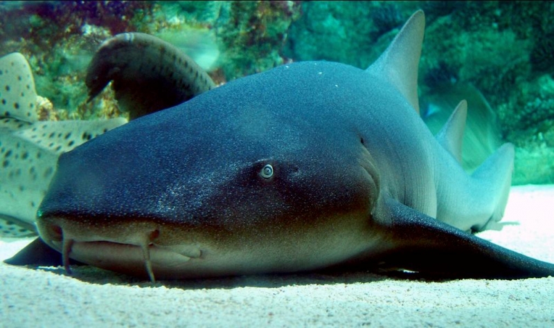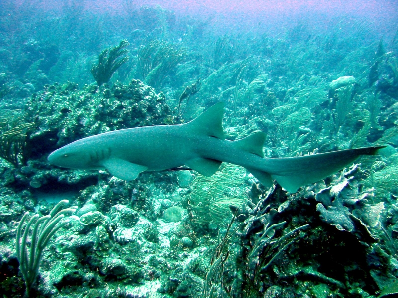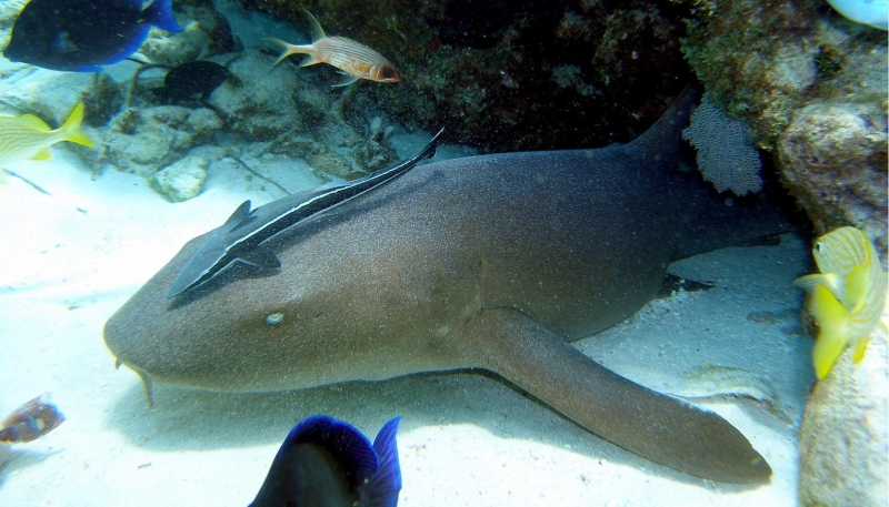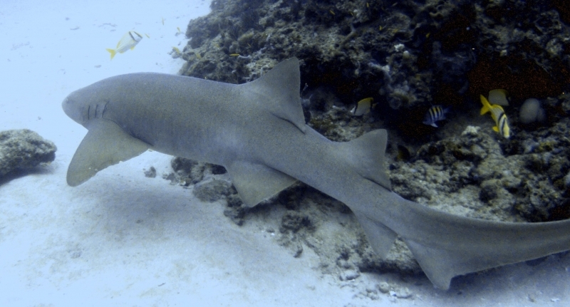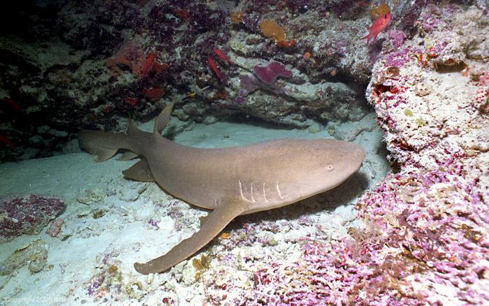 Nurse Sharks reach a maximum of 4.3 meters total length; maximum weight is 110 kilograms. The Nurse Shark is a common reef-associated bottom-dwelling shark found in brackish and marine environments in the shallows to 100 meters. The origin of the name Nurse Shark is unclear. It may come from the sucking sound they make when hunting for prey in the sand, which vaguely resembles that of a nursing baby or it may derive from an archaic word nusse, meaning cat shark. The most likely theory though is that the name comes from the Old English word hurse meaning sea-floor shark. It has moderately long barbels between the nostrils, nasoral (near the nostrils) grooves are present, the mouth is well in front of the eyes, small spiracles, the precaudal tail is shorter than the head and body, the dorsal fins are broadly rounded (the first much larger than the second and anal fins), caudal fin moderately long, over 1/4 of total body length, yellow-brown to gray-brown in color, with or without small dark spots and obscure dorsal saddle markings. Nurse Sharks are commonly found over shallow sand flats, in channels and around coral reefs while the young pups may be found among prop roots of red mangroves. Nurse Sharks show a strong preference for certain resting sites and repeatedly return to the same caves and crevices following nocturnal activity. Nurse Sharks are nocturnal, feeding on bottom invertebrates such as spiny lobsters, shrimp, crabs, sea urchins, squid, octopus, snails & fishes such as mullet, puffers and stingrays.