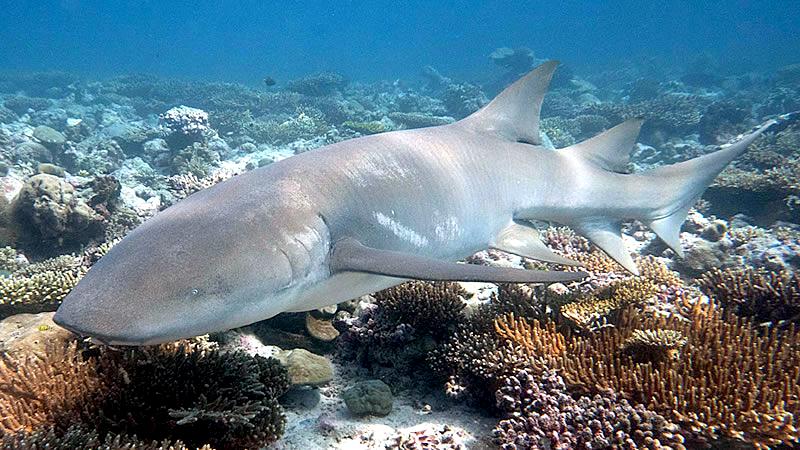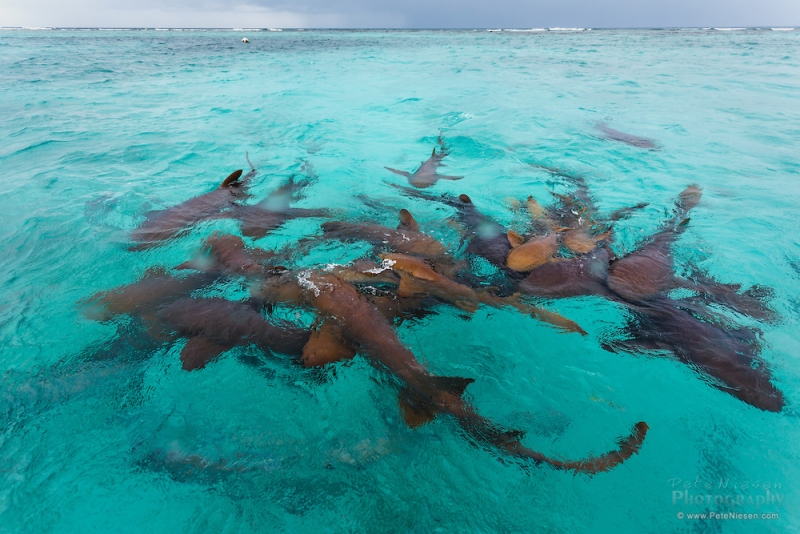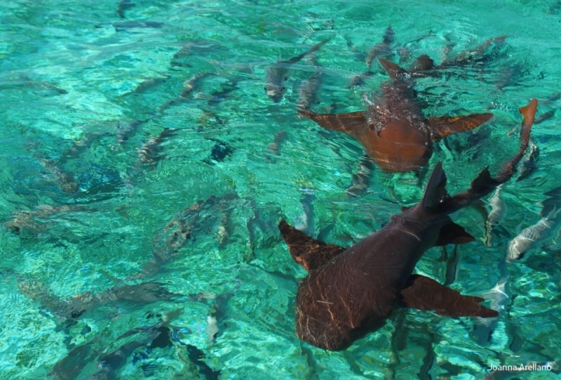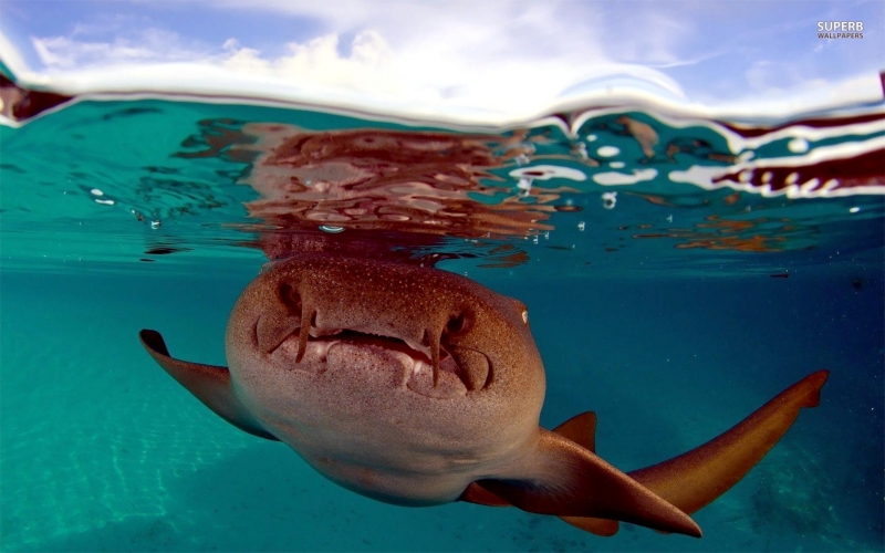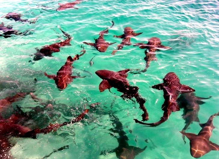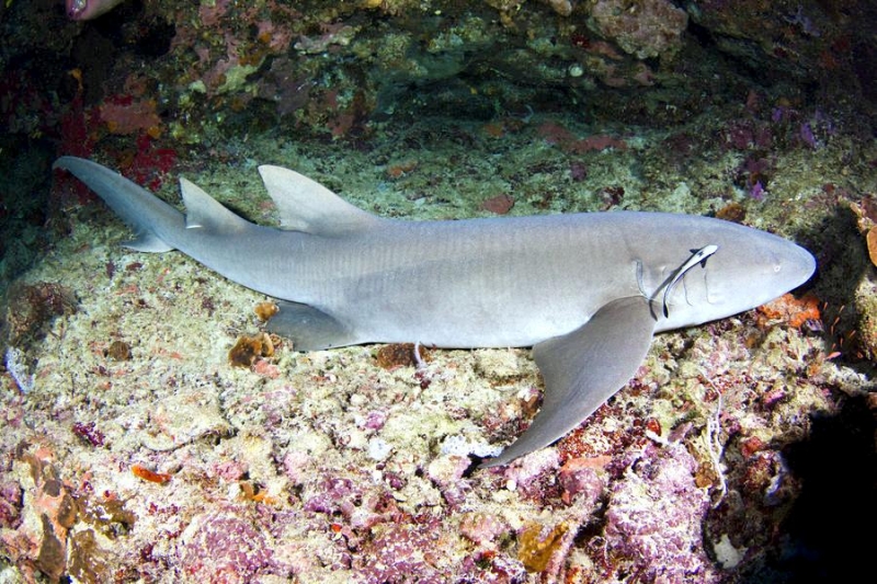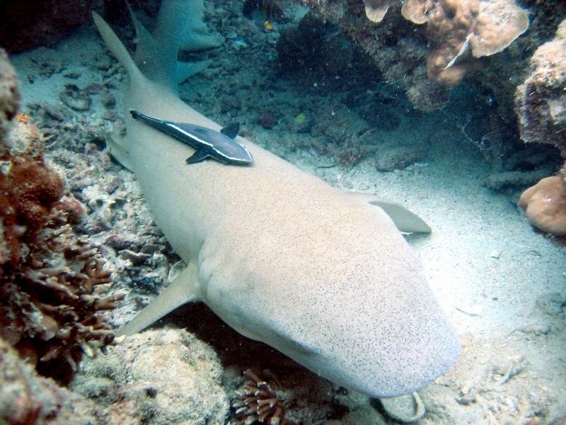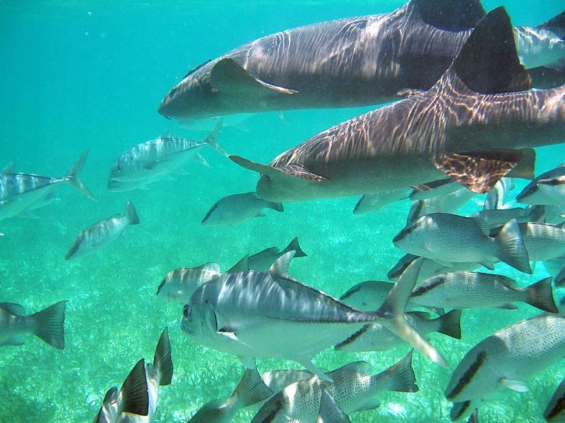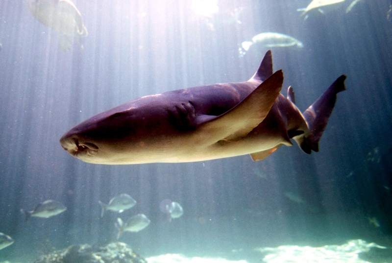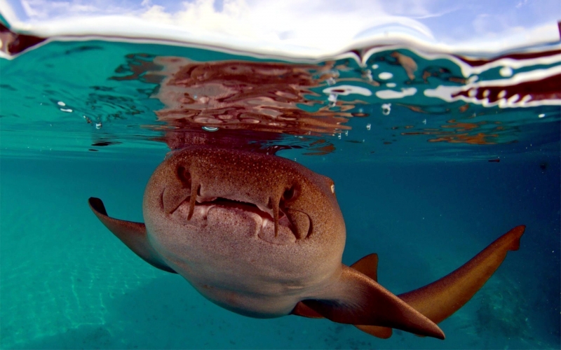 Nurse Sharks reach a maximum of 4.3 meters total length; maximum weight is 110 kilograms. The Nurse Shark is a common reef-associated bottom-dwelling shark found in brackish and marine environments in the shallows to 100 meters. The origin of the name Nurse Shark is unclear. It may come from the sucking sound they make when hunting for prey in the sand, which vaguely resembles that of a nursing baby or it may derive from an archaic word nusse, meaning cat shark. The most likely theory though is that the name comes from the Old English word hurse meaning sea-floor shark. It has moderately long barbels between the nostrils, nasoral (near the nostrils) grooves are present, the mouth is well in front of the eyes, small spiracles, the precaudal tail is shorter than the head and body, the dorsal fins are broadly rounded (the first much larger than the second and anal fins), caudal fin moderately long, over 1/4 of total body length, yellow-brown to gray-brown in color, with or without small dark spots and obscure dorsal saddle markings. Nurse Sharks are commonly found over shallow sand flats, in channels and around coral reefs while the young pups may be found among prop roots of red mangroves. Nurse Sharks show a strong preference for certain resting sites and repeatedly return to the same caves and crevices following nocturnal activity. Nurse Sharks are nocturnal, feeding on bottom invertebrates such as spiny lobsters, shrimp, crabs, sea urchins, squid, octopus, snails & fishes such as mullet, puffers and stingrays.