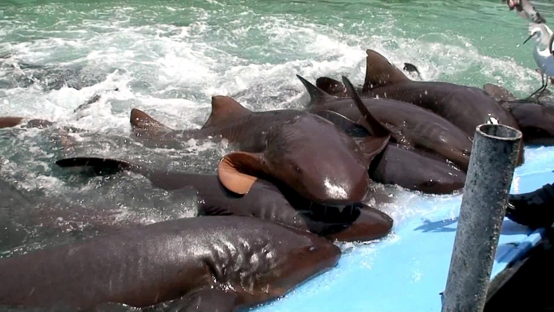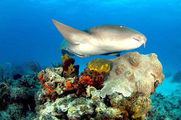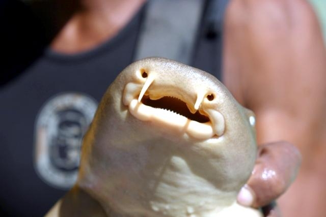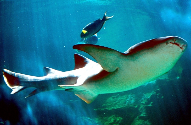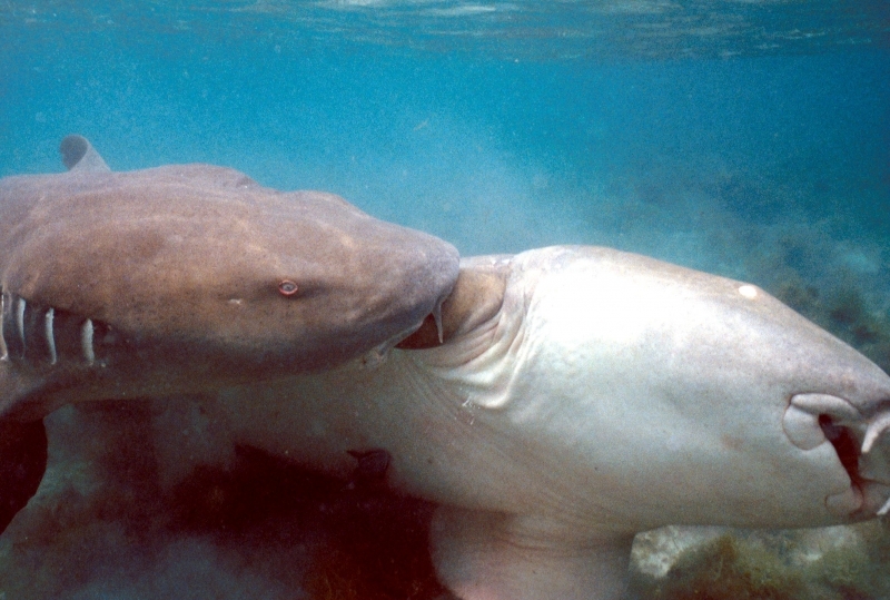 Nurse Sharks are ovoviviparous that give birth to 21-28 pups in a litter. Young in the uterus are sustained by a large supply of yolk. Females give birth in late spring and summer in waters off Florida. During courtship, a pair (sometimes a trio) of adults were observed engaged in synchronized parallel swimming. A male may grab one of the female’s pectoral fins with his mouth which induces the female to pivot 90° and roll on her back on the bottom. Then the male inserts a clasper in her vent and then rolls on his back beside the female. The eggs are retained within the body of the female in a brood chamber where the embryo develops, receiving nourishment from a yolk sac. This is the method of reproduction for the “live-bearing” fishes where pups hatch from egg capsules inside the mother’s uterus and are born soon afterward. Nurse Sharks are non-aggressive and will generally swim away when approached; they are one of the most docile animals in the sea. However, some unprovoked attacks on swimmers and divers have been reported. If disturbed, the bite is powerful and capable of inflicting serious injury. In some instances, jaw release was accomplished only after using surgical instruments. It is not true that all sharks need to swim in order to breathe and when they cannot for whatever reason, they die. All sharks breathe primarily by using a ram-jet ventilation system used while they are swimming. Some sharks however, have a second system based on respiratory pumping of water. Nurse Sharks can switch to this respiratory system when they are at rest, saving energy and the necessity to swim to move water & oxygen over their gills. This dual respiratory system is especially important for bottom dwellers such as Nurse Sharks.