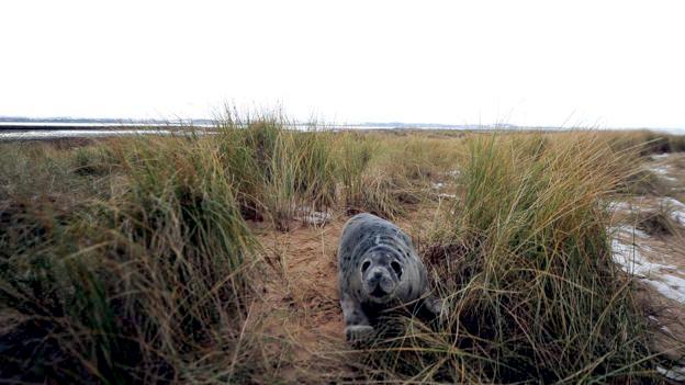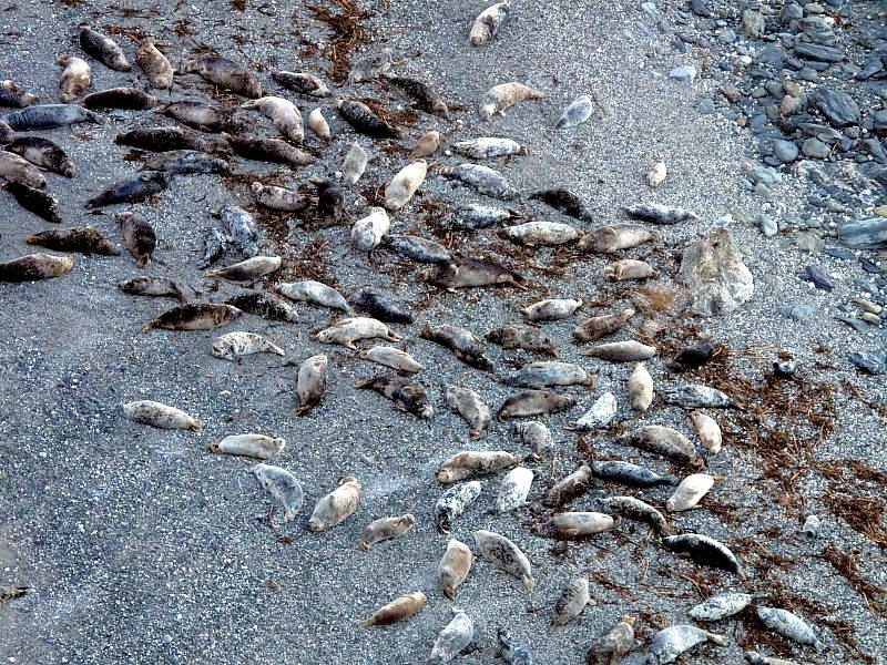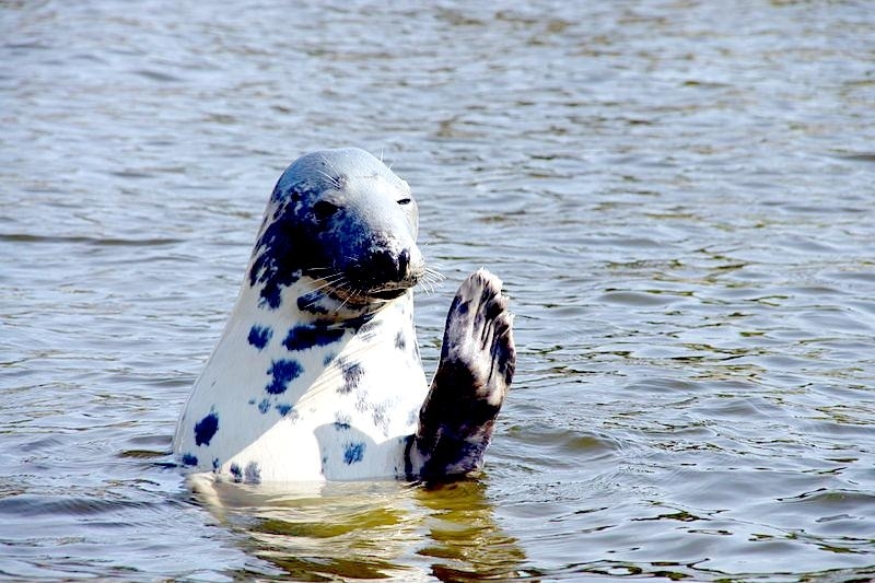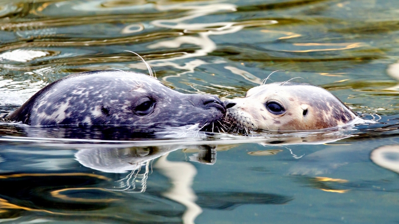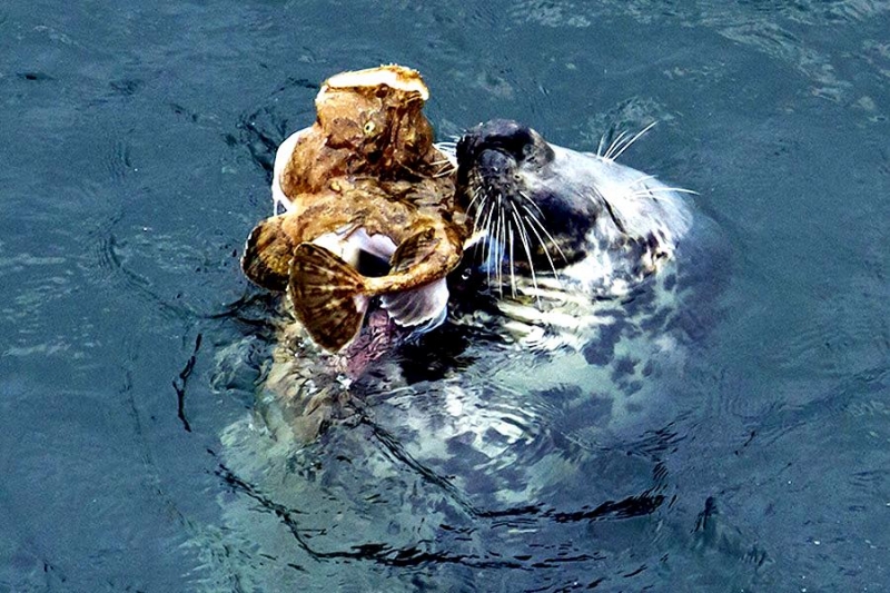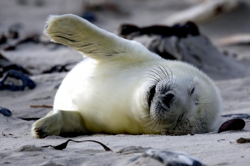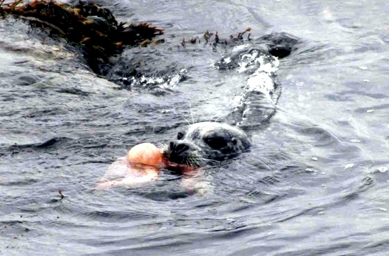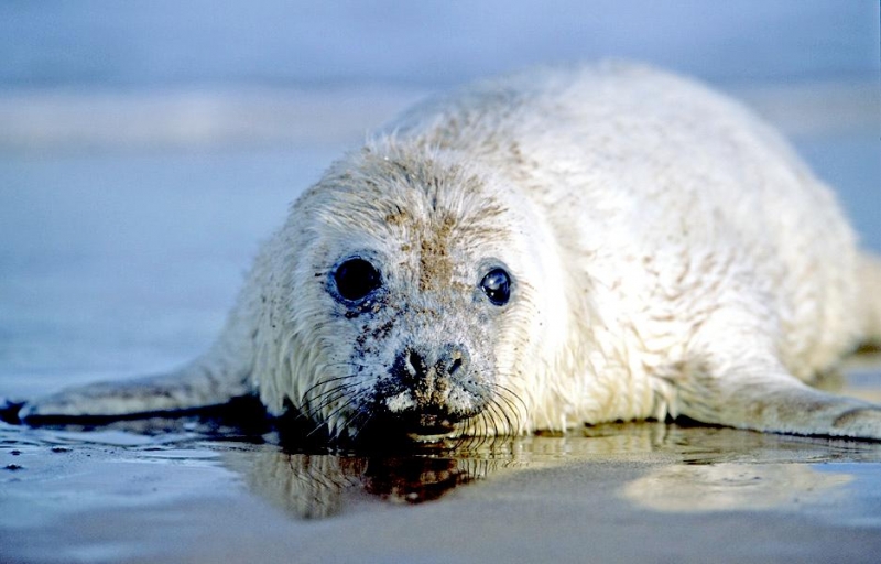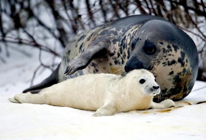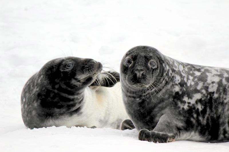 The total western Atlantic population is thought to be at least 150,000, mostly found on the coasts of Sable Island and the Gulf of St. Lawrence. Approximately 130,000-140,000 Grey Seals are estimated in the eastern Atlantic population, and about 7,500 in the Baltic Sea population making the total estimated world-wide total around 290,000-300,000. Grey Seals feed on a wide variety of fish, crustaceans and cephalopods. Sand Eels or Sand Lances are the preferred prey in many areas. Like other seal species, Grey Seals also consume seabirds occasionally. They typically dive to about 30-70 meters while feeding. Sharks prey on Grey Seals in the western Atlantic and Killer Whales have also been observed killing the these seals on both sides of the Atlantic. Grey Seals gather together for hauling out, breeding and molting. The breeding season varies between populations, generally taking place between mid-December and early February in Canada, late July to December in the U.K., February to April in the Baltic Sea and peaking in October in Iceland and Norway. Breeding territories also vary by population in the Atlantic and are established on rocky islands and coasts, in caves, sandy islands and beaches and in some areas of the Gulf of St. Lawrence on land-fast ice or ice floes. In middle of the Baltic Sea, pups are born on pack ice and some seals also pup on land near Estonia and the Stockholm archipelago. Pupping on pack ice varies according to the amount of ice formed in the Baltic Sea.
