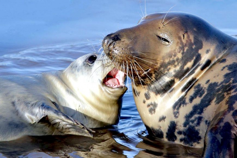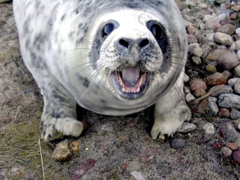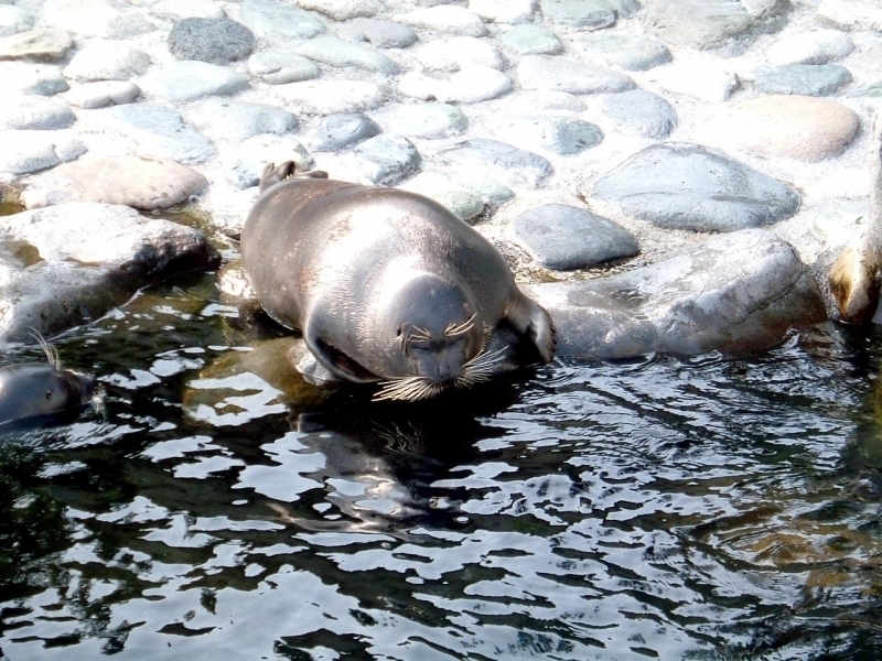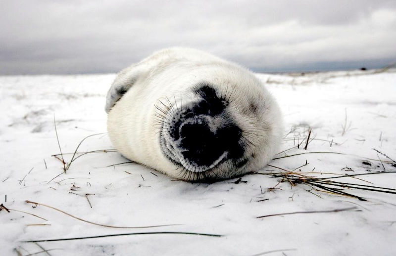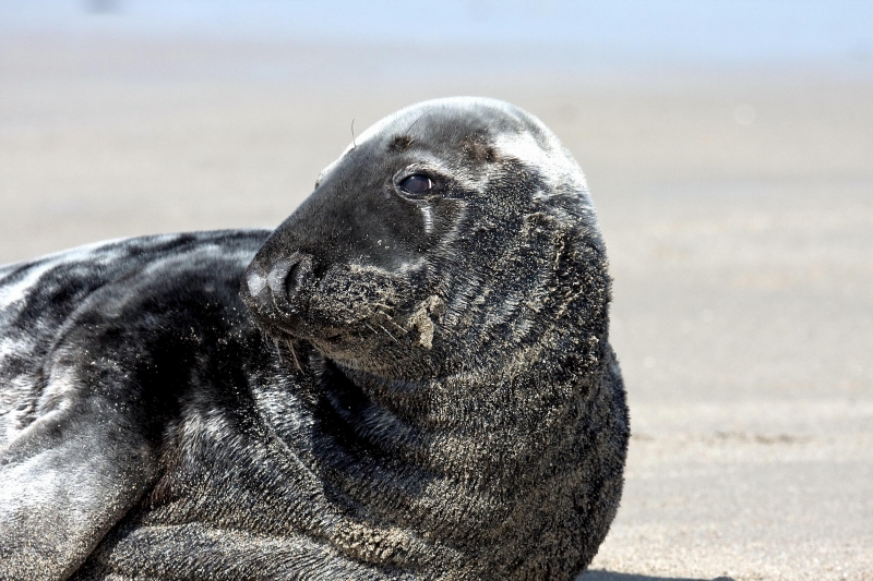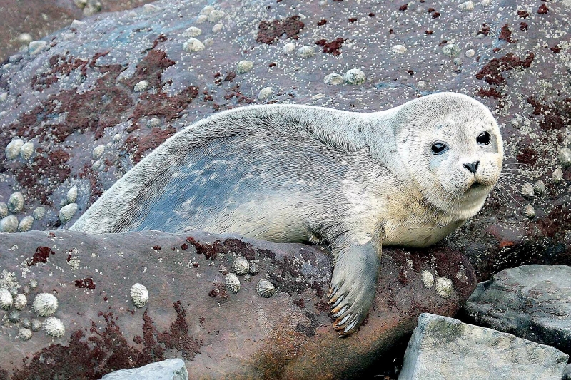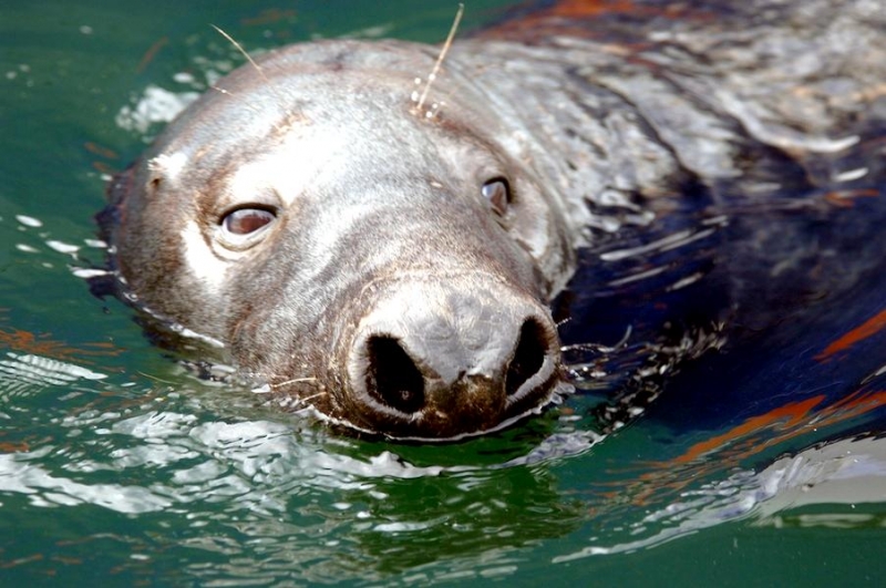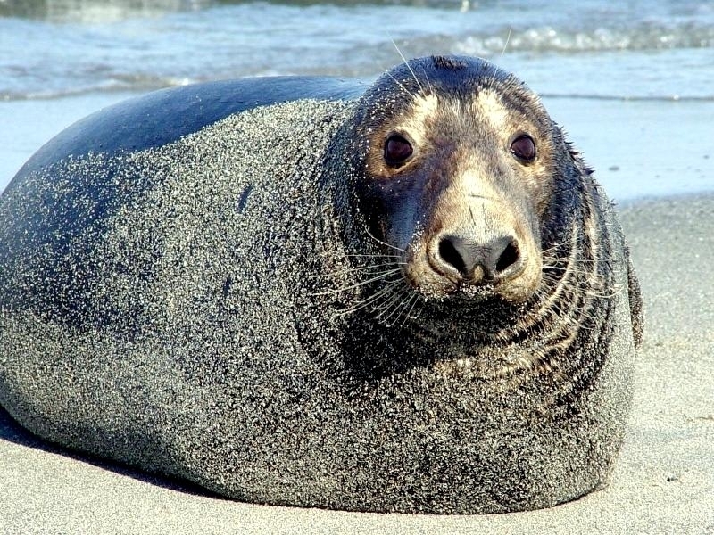 Grey Seals have a wide variety of coloring. Males tend to have a dark brown-gray to black coat with a few light patches. Females are generally light gray-tan, lighter on the chest with dark spots and patches. Adult males and some older adult females to a lesser extent, have a characteristically long nose with wide nostrils, which is why this species is called “Horsehead” in Canada and why its Latin name translates to “Hooked-nose Pig of the Sea”. Adult males in the eastern Atlantic population are smaller than those of the western Atlantic measuring between 1.95-2.5 meters in length and weighing 170-310 kilograms. Adult females measure 1.65-2.1 meters in length and weigh between 103-180 kilograms. The western Atlantic Grey Seals tend to be about 20% heavier. Grey Seals have been known to dive to depths up to 300 meters for as long as 20 minutes. Females live up to 35 years of age, males up to 25 years. Members of the western Atlantic population generally live longer. Their maximum recorded ages are 46 years for females and 29 years for males, although in captivity, males actually live longer into their 40’s such as the 42-year-old “Orkney”, a male Grey Seal at the San Francisco Zoo who died in 2013. Grey Seals are found in the north Atlantic Ocean separated into three distinct populations: the western Atlantic population is found off the coast of Canada from north Labrador down to New England occasionally as far south as Virginia. The eastern Atlantic population is found around the coasts of the United Kingdom and Ireland and on the coasts of the Faroe Islands, Iceland, Norway and northwestern Russia as far as the White Sea. Smaller populations are also found on the French, Dutch and German coasts and wandering individuals have been found as far south as Portugal. The third known population of Grey Seals is located in the Baltic Sea.